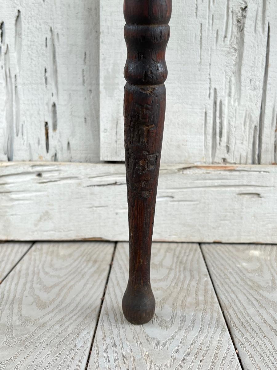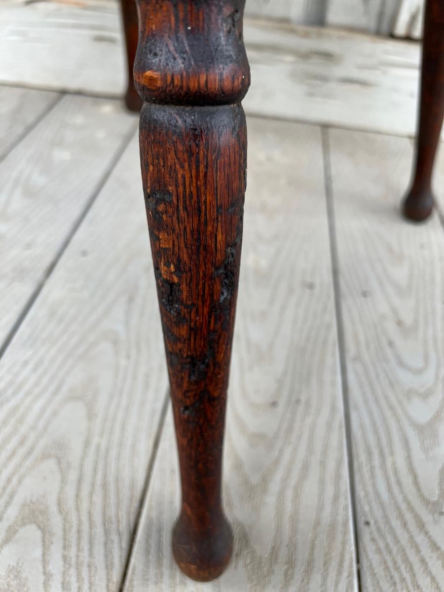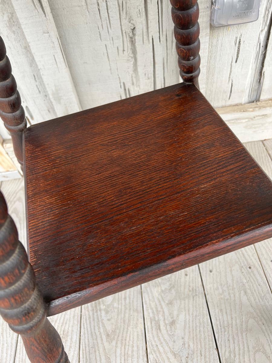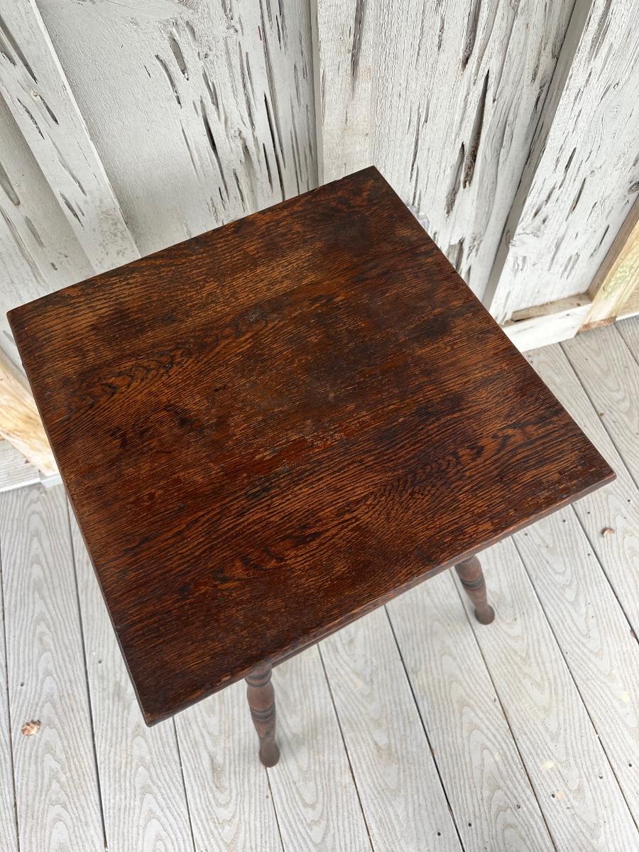 Table needs some TLC. No name brand found. There are some spots on the leg that does need some repair. See pictures. 28” H x 16” Square. 14” H to second shelf & 12” Square.