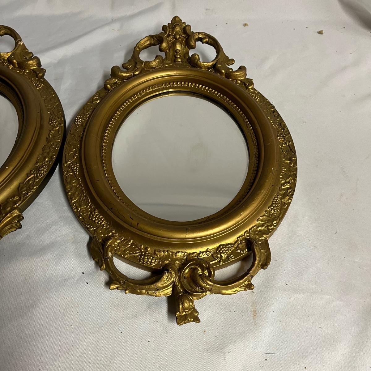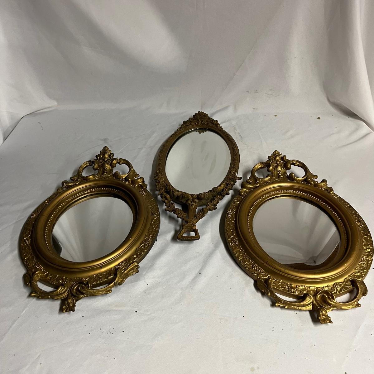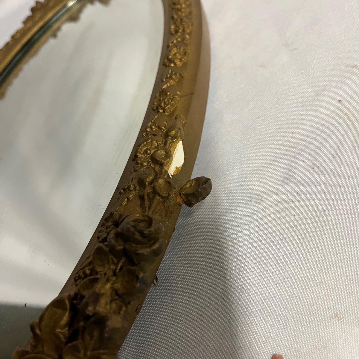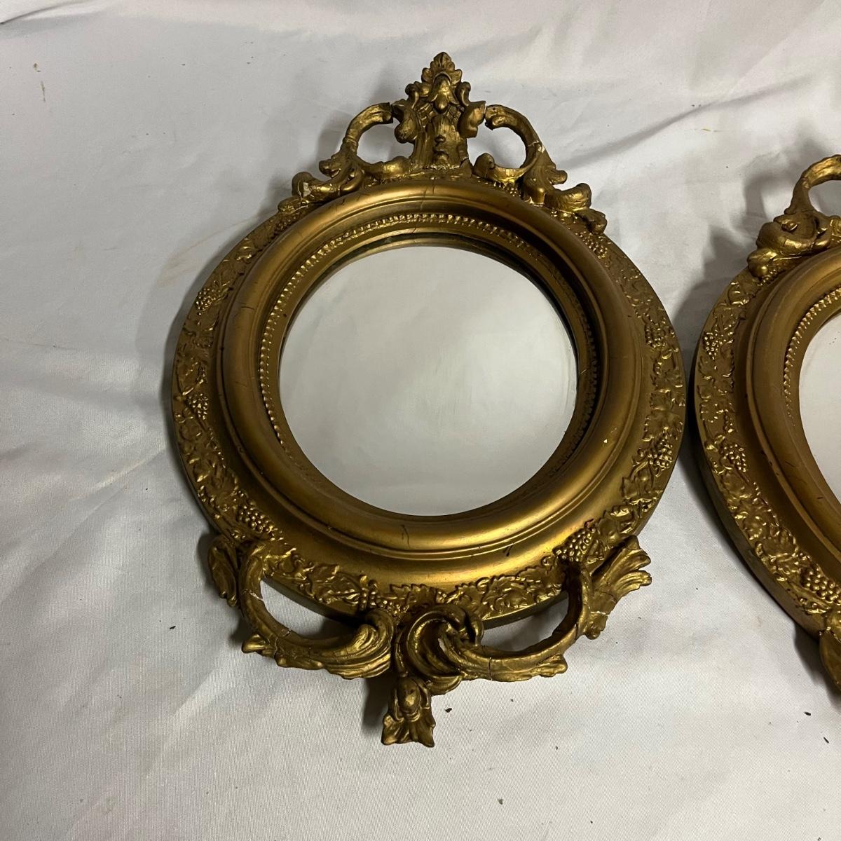 Lot includes a pair of mirrors and one similar mirror. All mirror frames are wood with what appears to be plaster over them. Frames have breaks and cracks, see pictures. Largest mirror measures 9.5” x 26” x 1.5”.