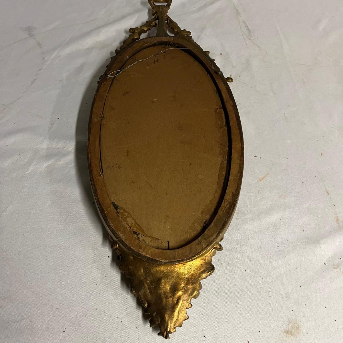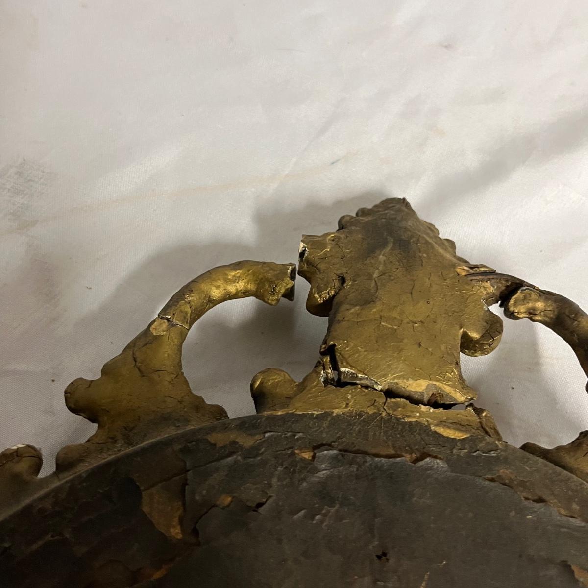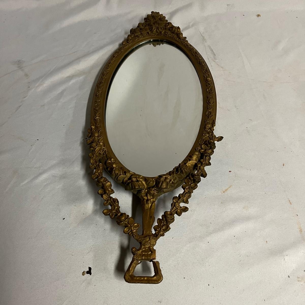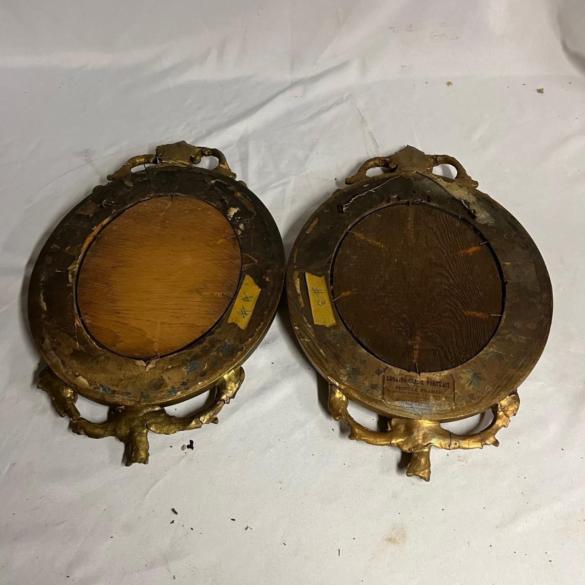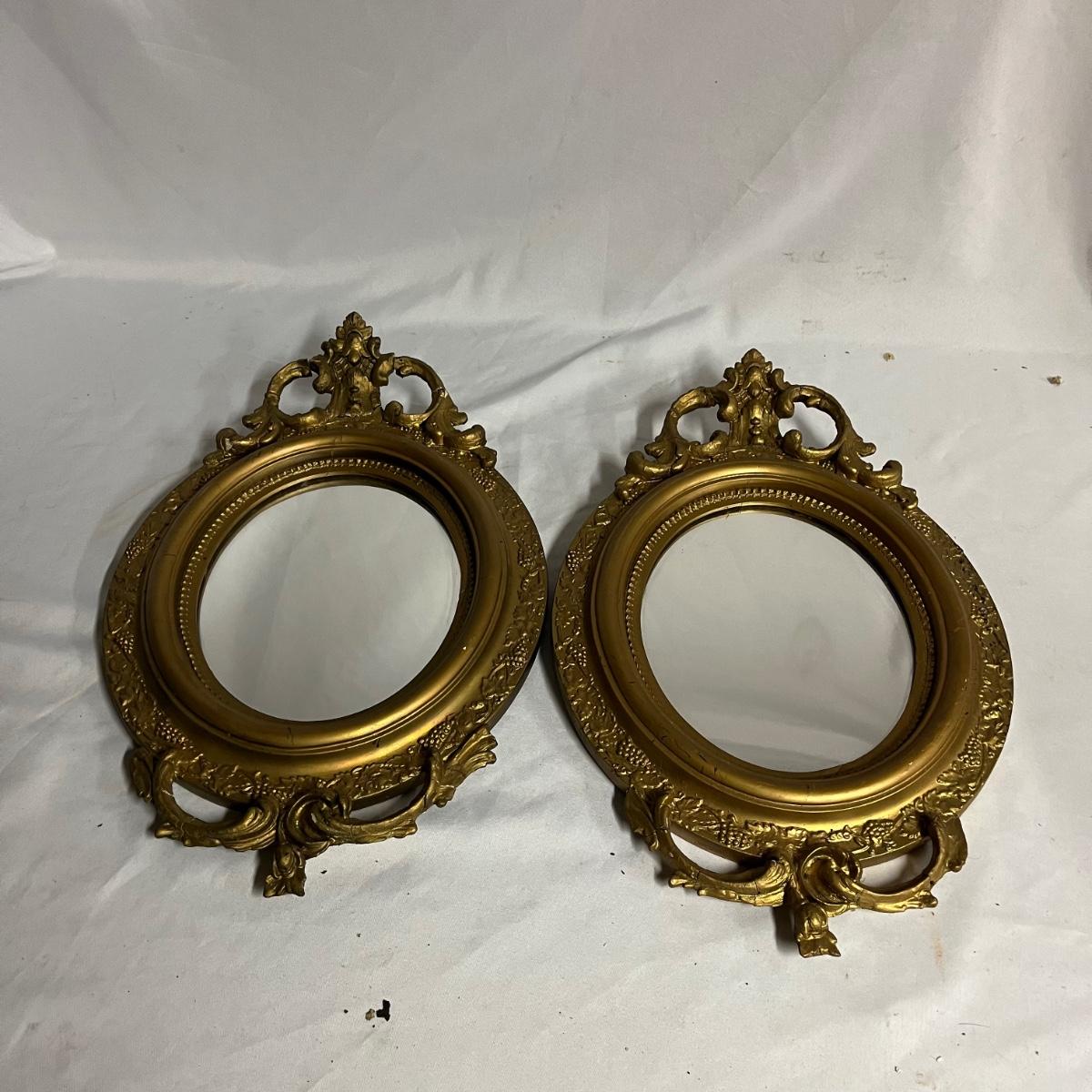 Lot includes a pair of mirrors and one similar mirror. All mirror frames are wood with what appears to be plaster over them. Frames have breaks and cracks, see pictures. Largest mirror measures 9.5” x 26” x 1.5”.