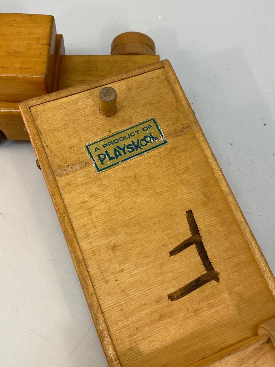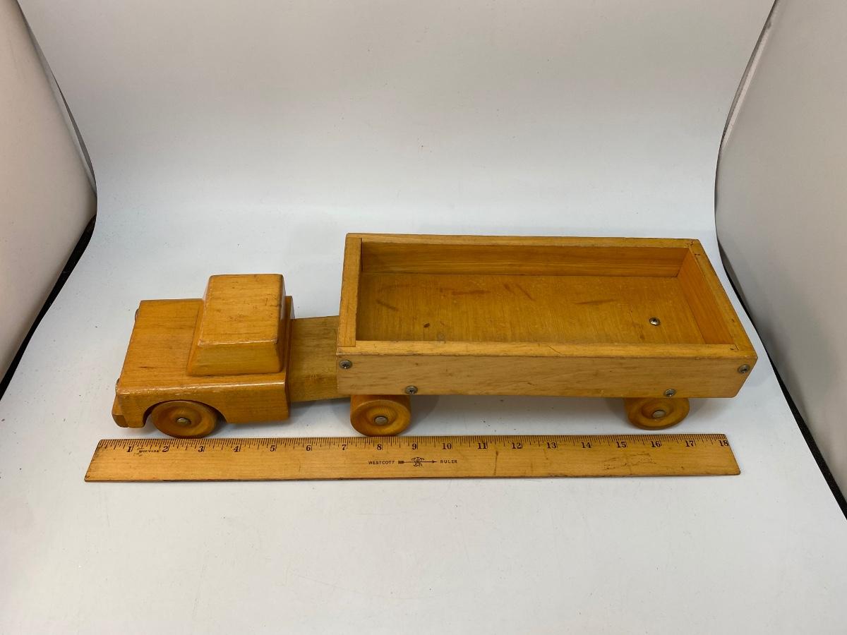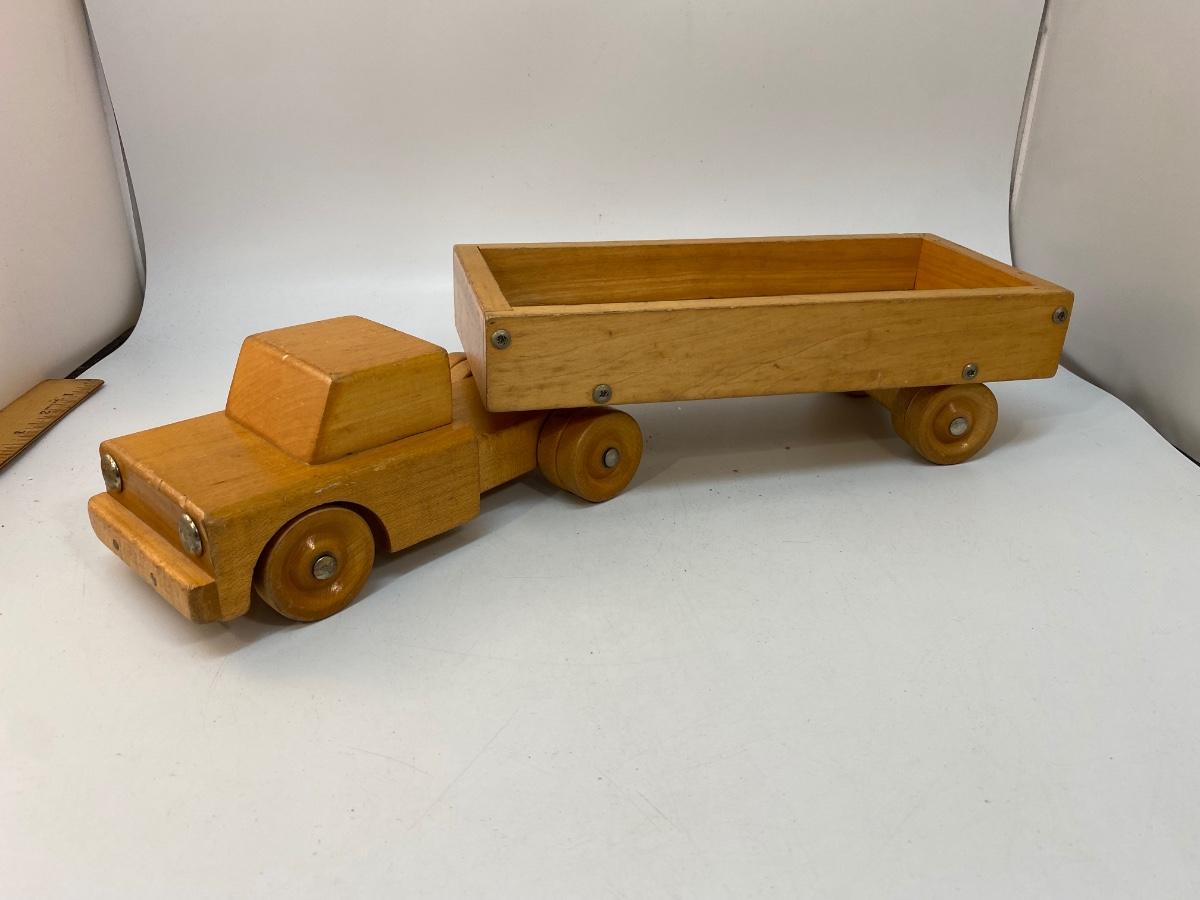 Vintage Wood Playskool Truck & Trailer. May have come with wood blocks originally. Other than the "F" written underneath it is in good condition.