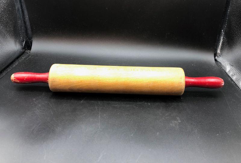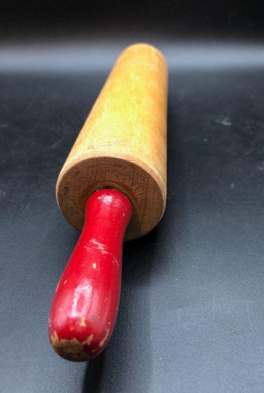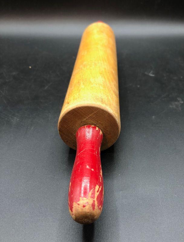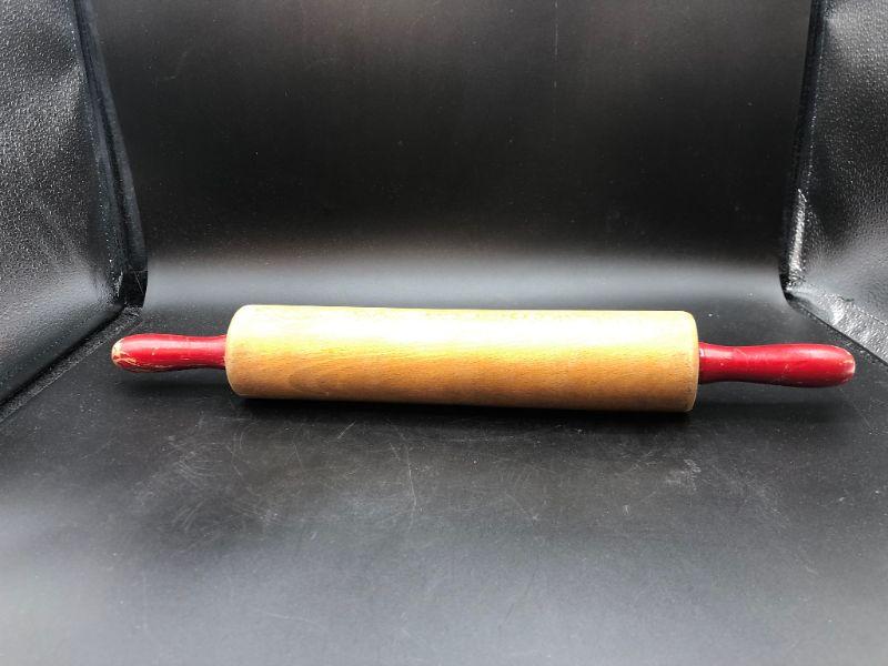 Vintage wood rolling pin. Red painted handles. Good used condition. Made in Denmark.