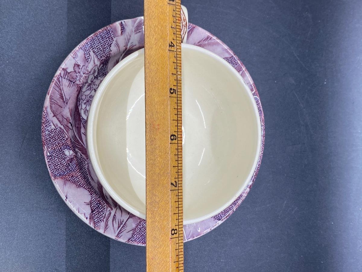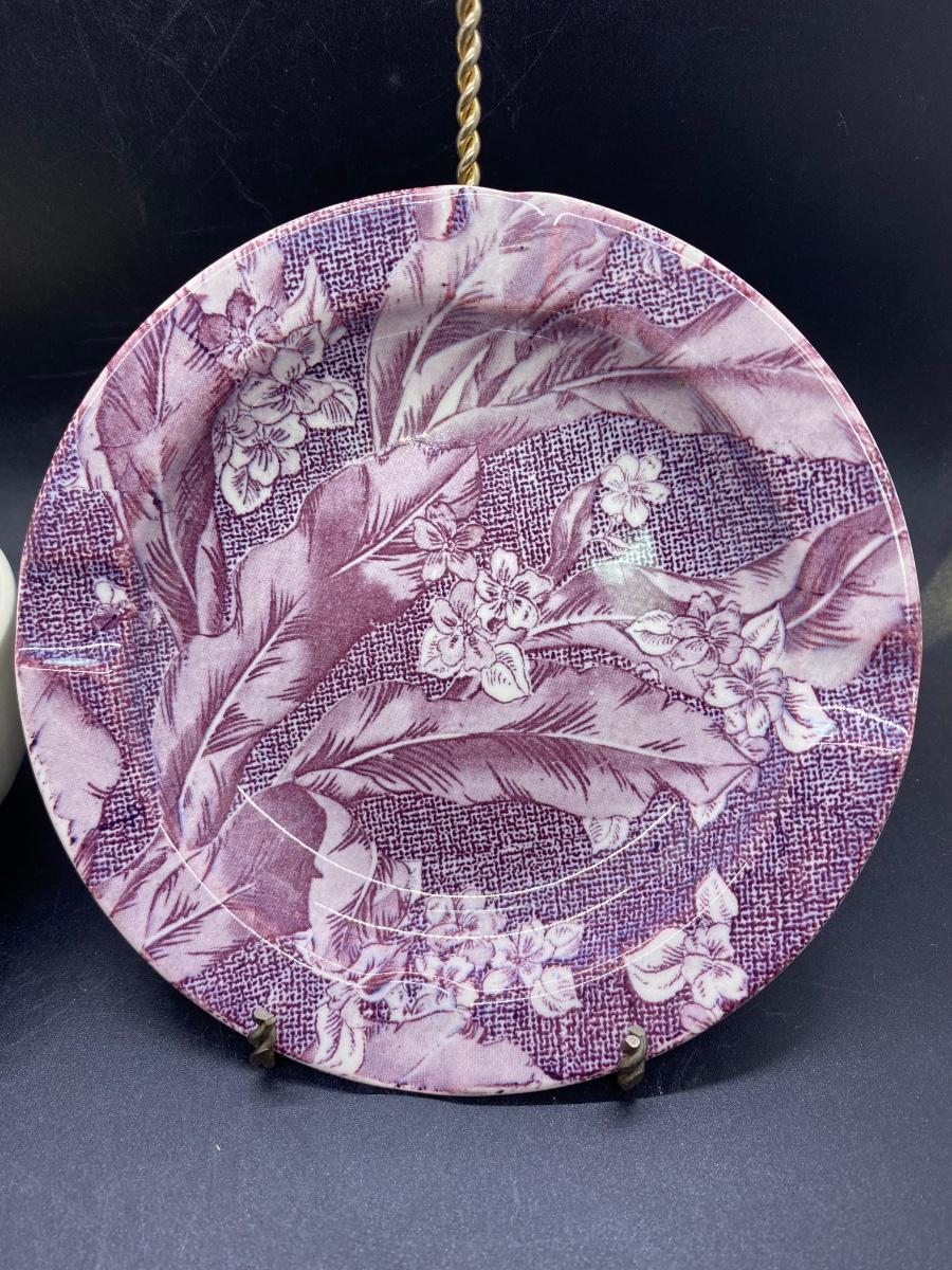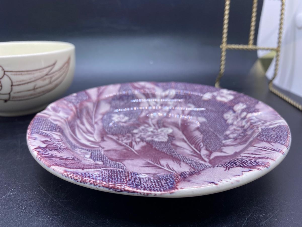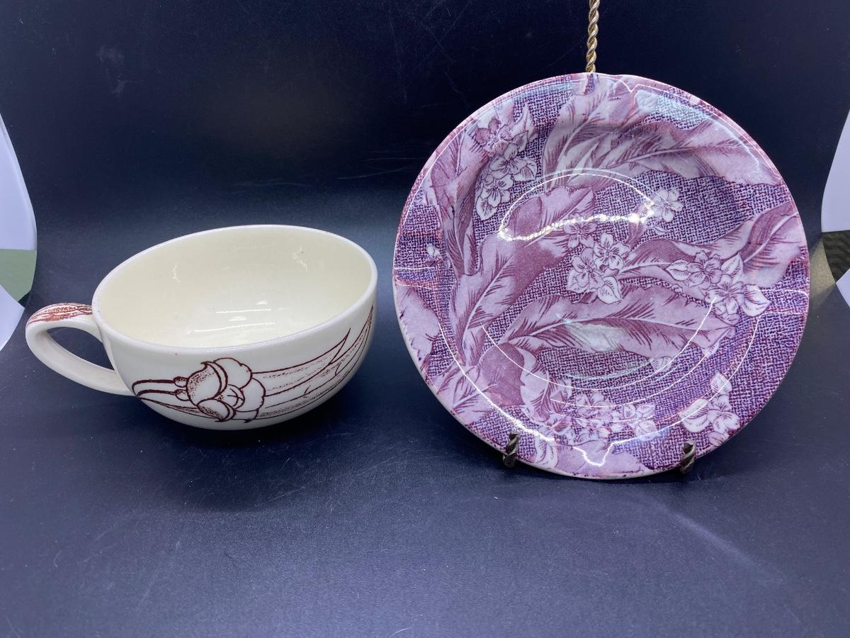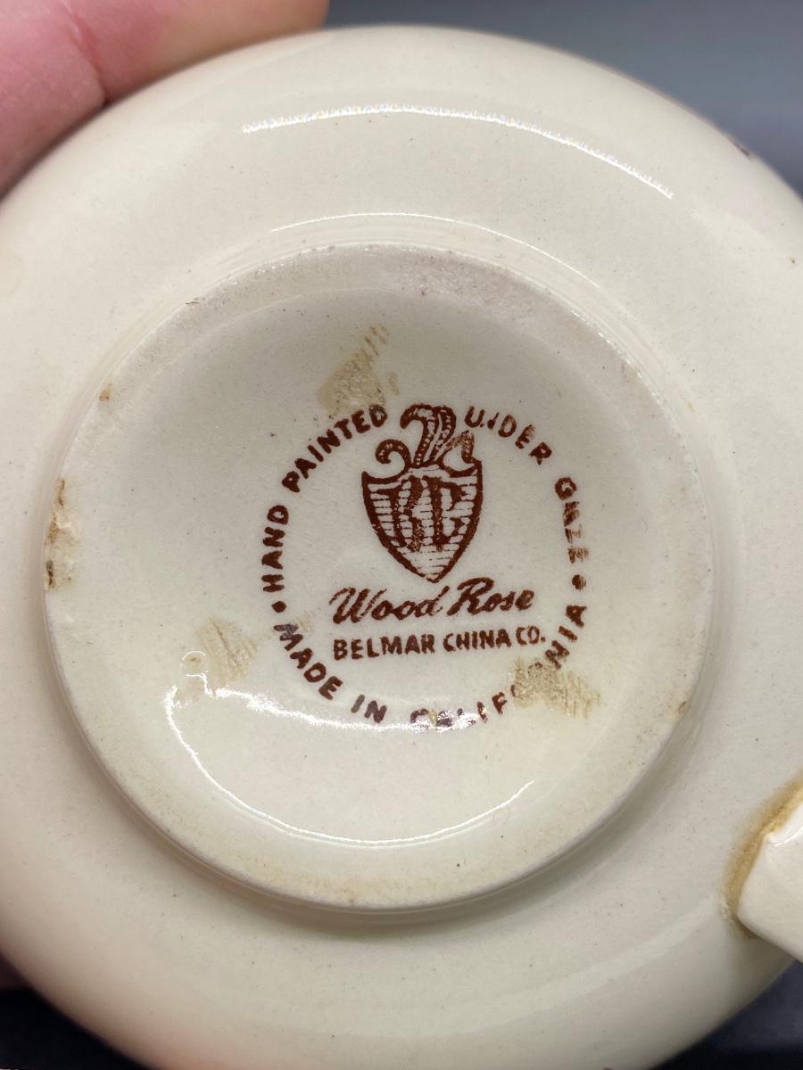 Two vintage pieces of California pottery. Coffee cup is Wood Rose pattern from Belmont China Co.. The ashtray is unmarked, possibly from Vernon Kilns, it has a purple floral pattern to it. Both are in good vintage condition.