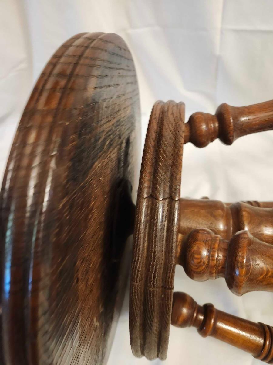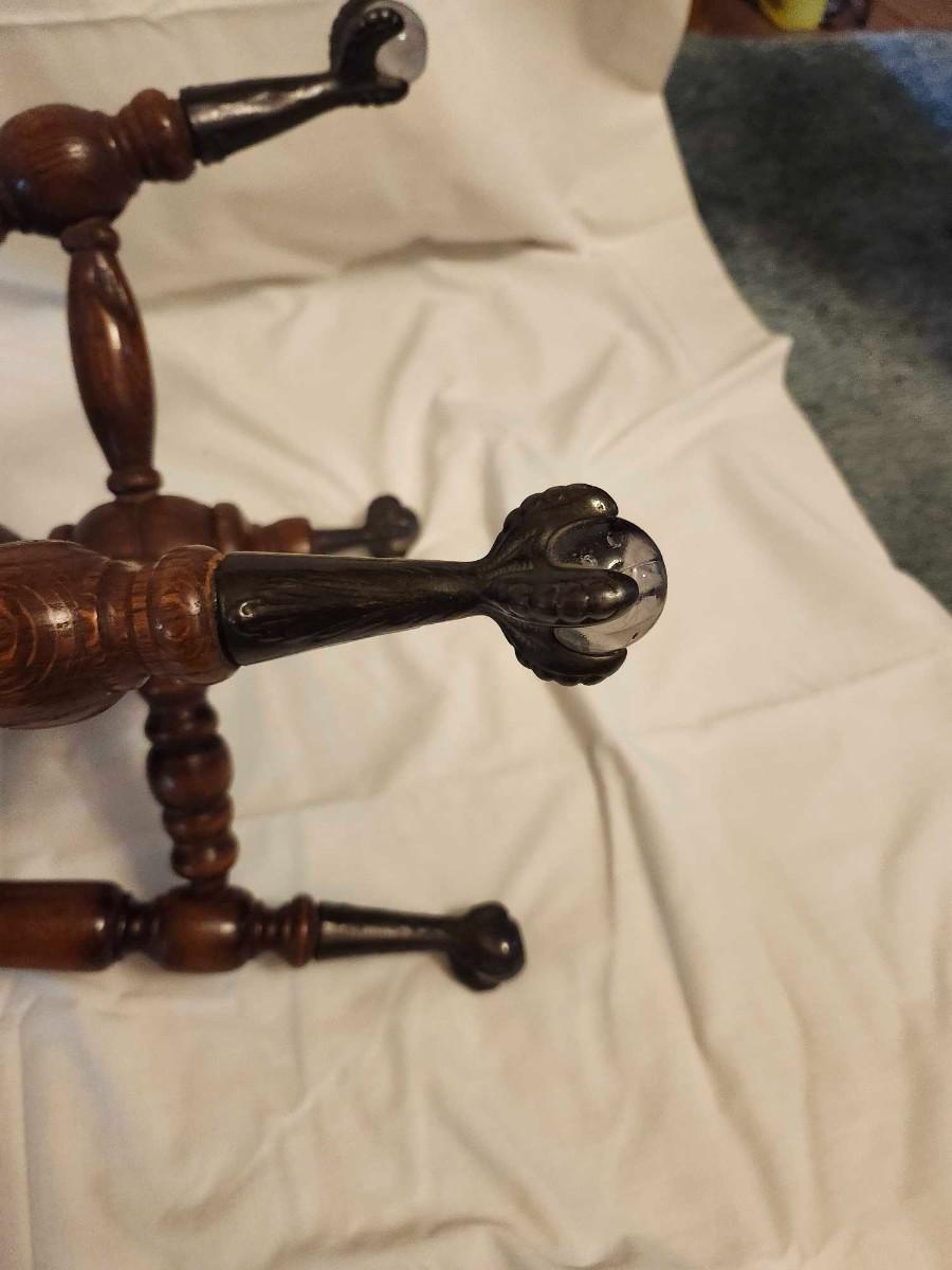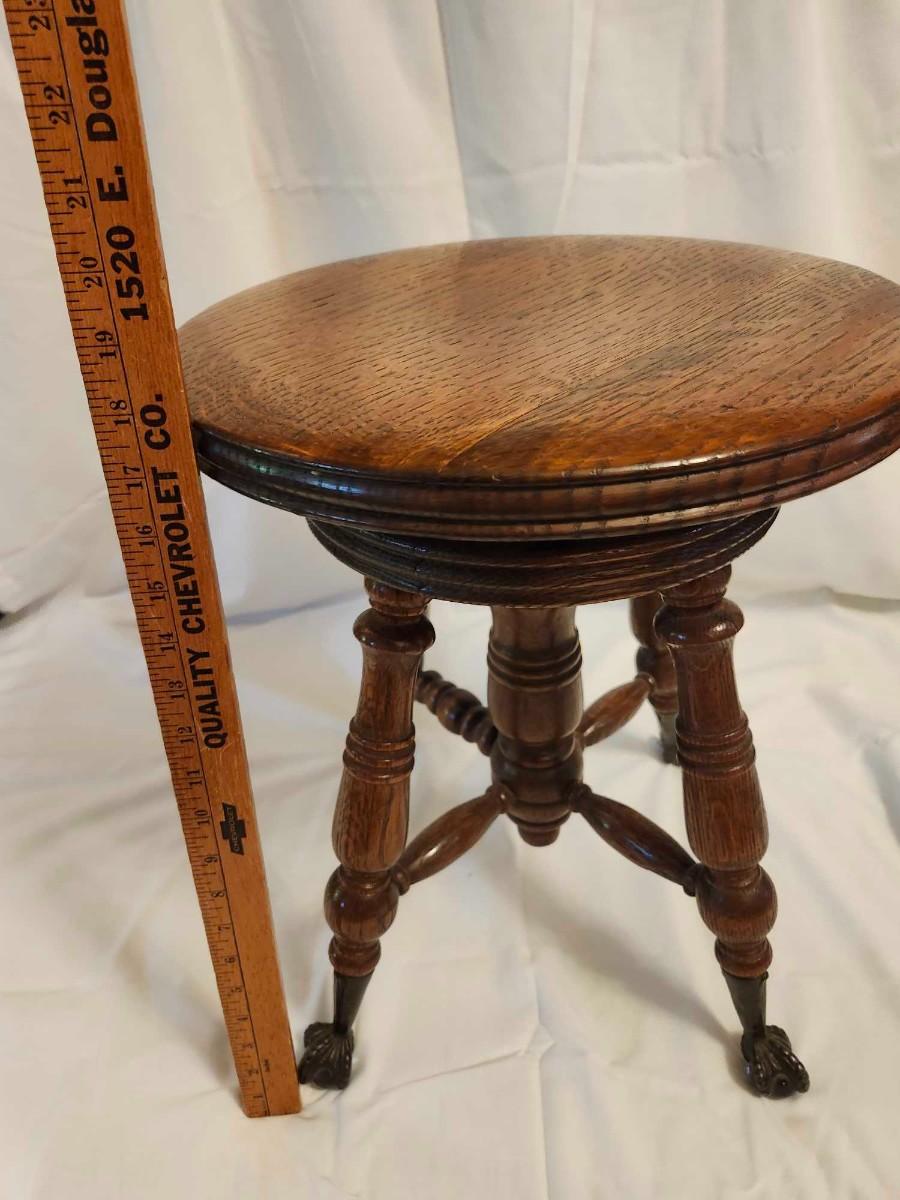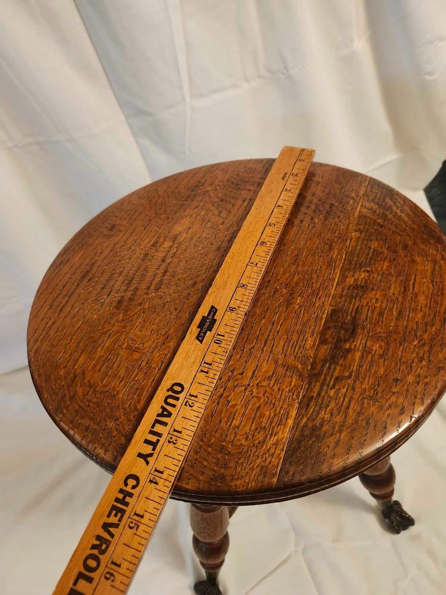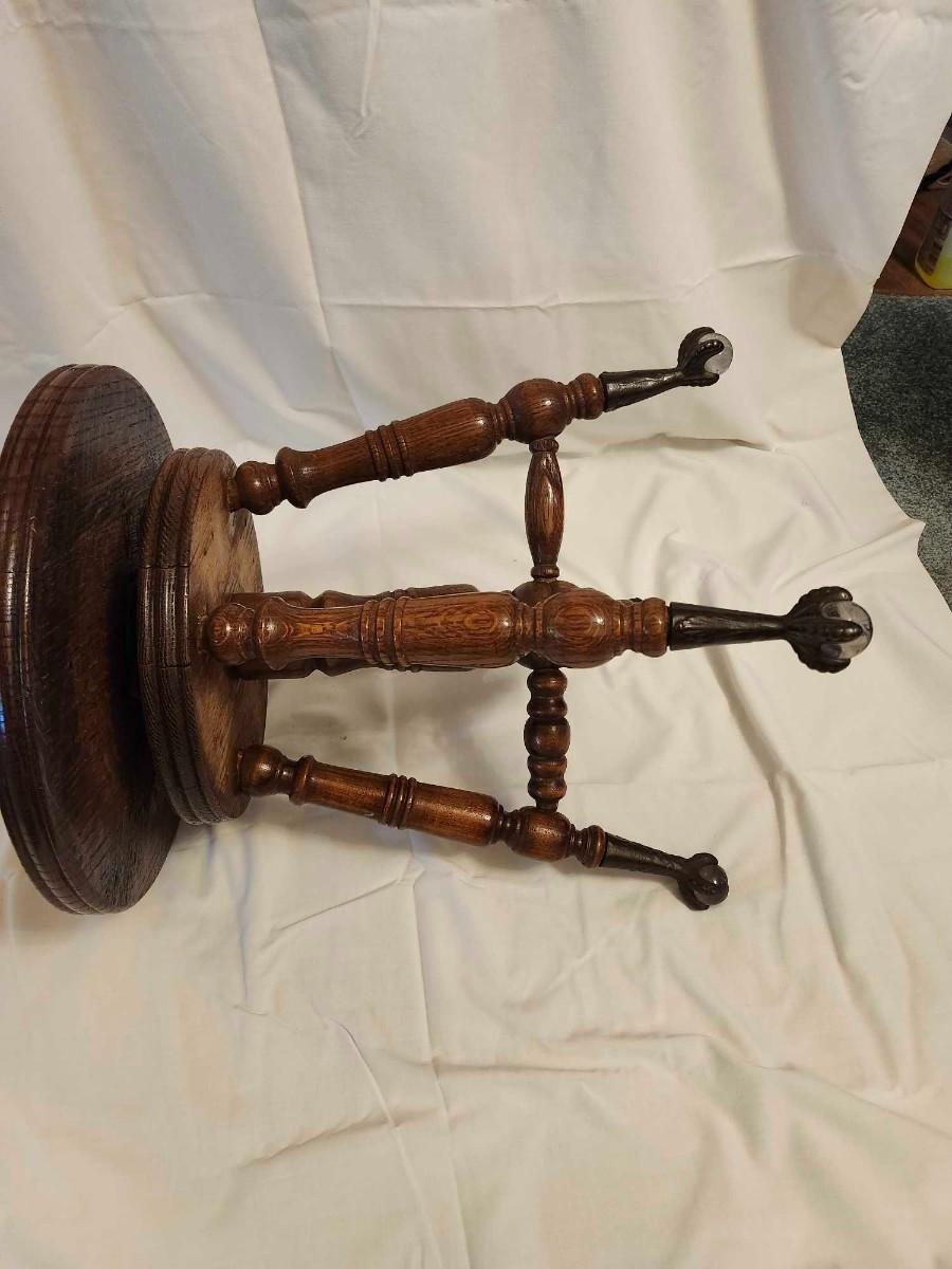 It has glass ball/claw feet, a top that swivels and may have once been adjustable. It weighs approximately 14 lbs and measures approximately 18 1/2" tall with a 14 1/2" diameter round top.