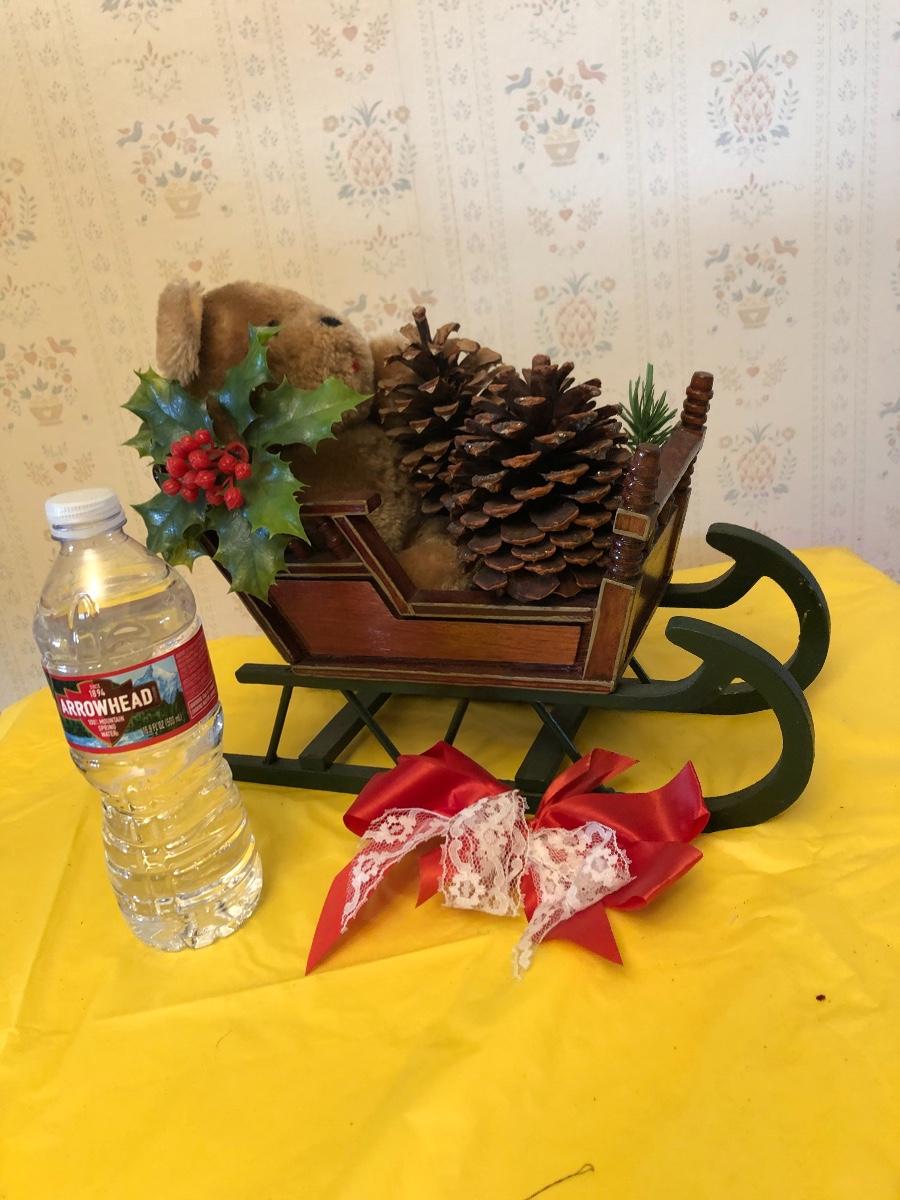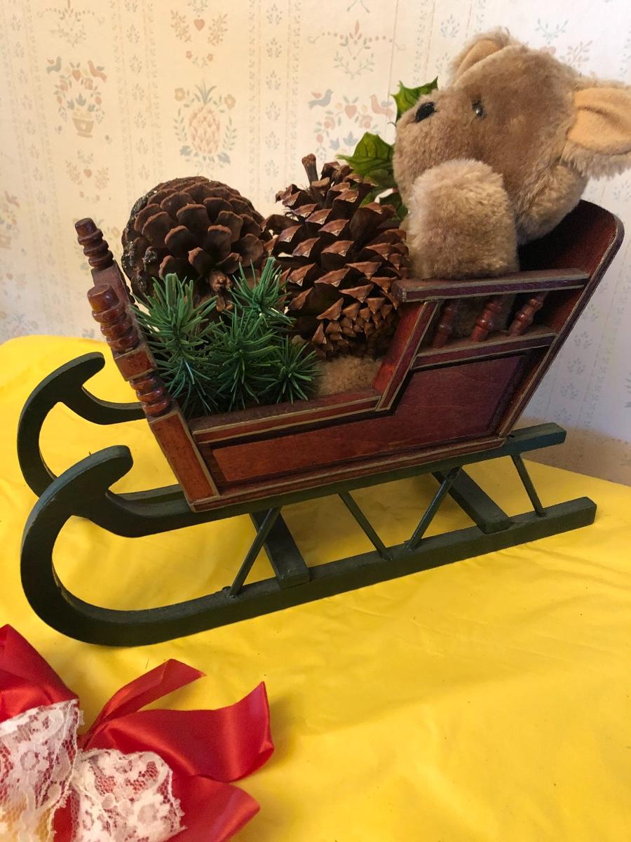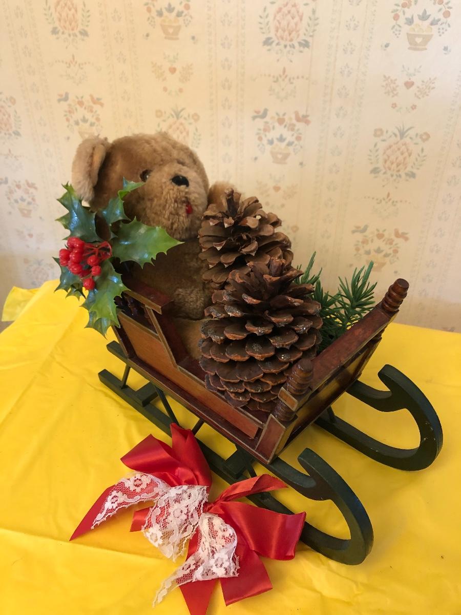 Vintage Christmas Winter Holiday wood sleigh with vintage stuffed bear