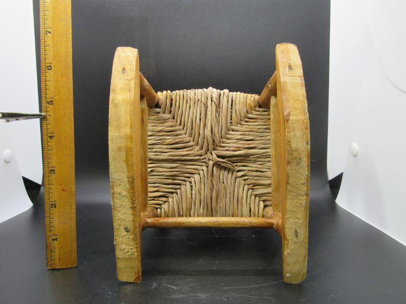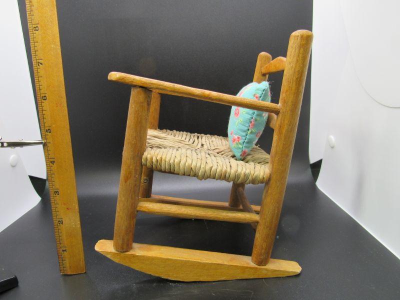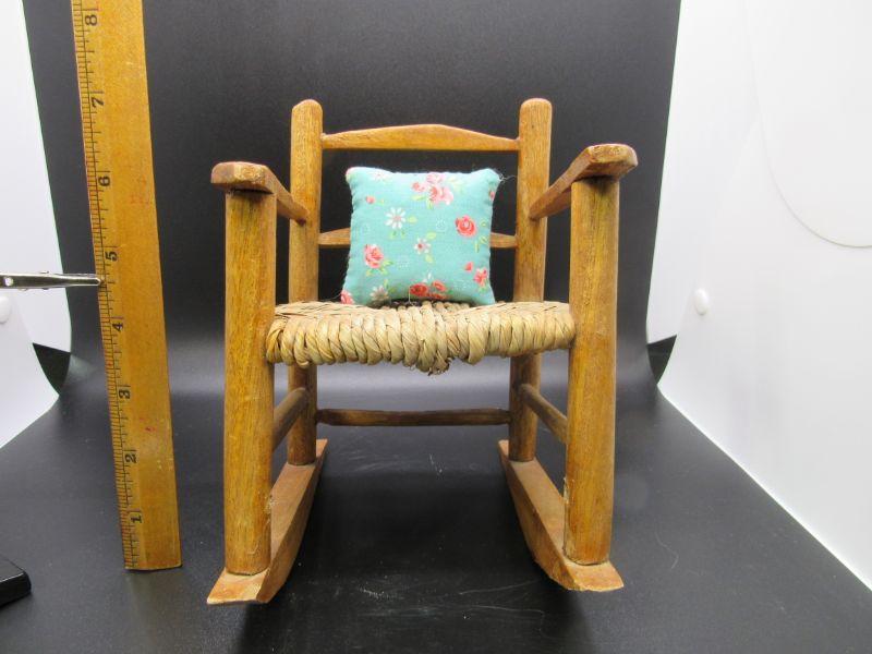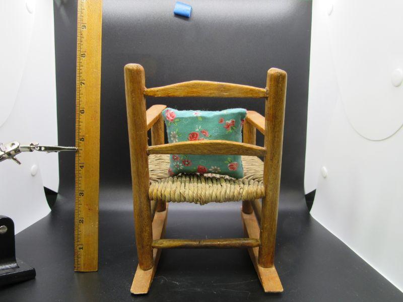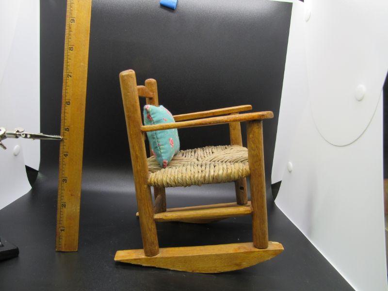 Wood doll size rocking chair. Rattan seat. About 7" total height.
