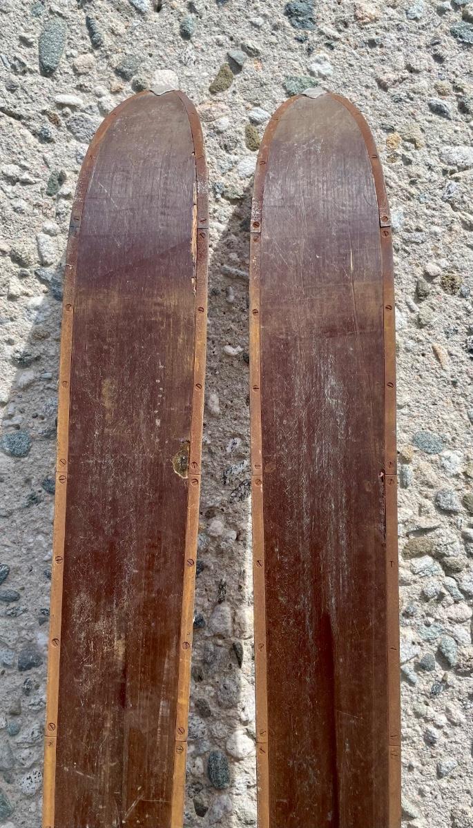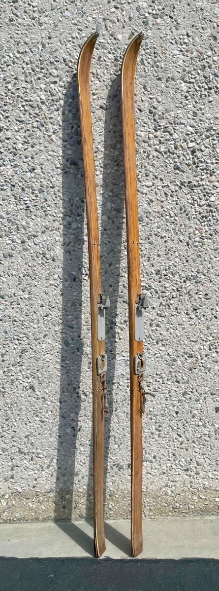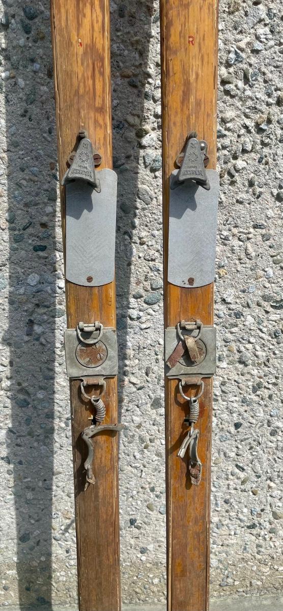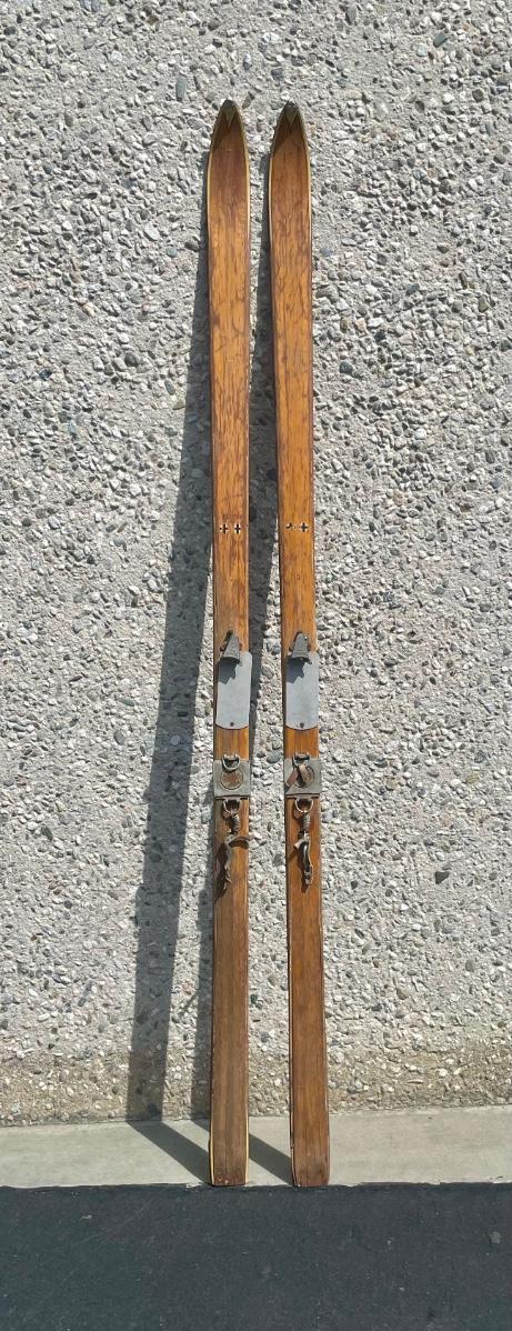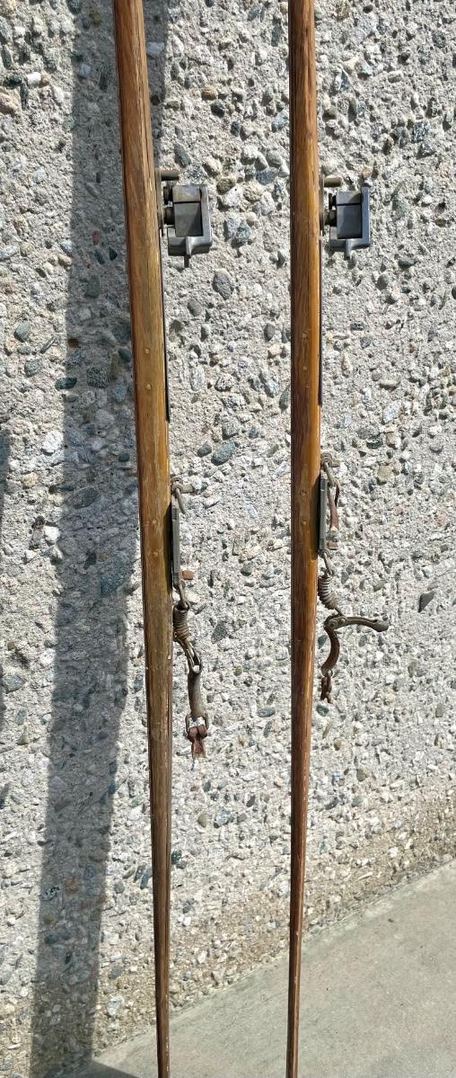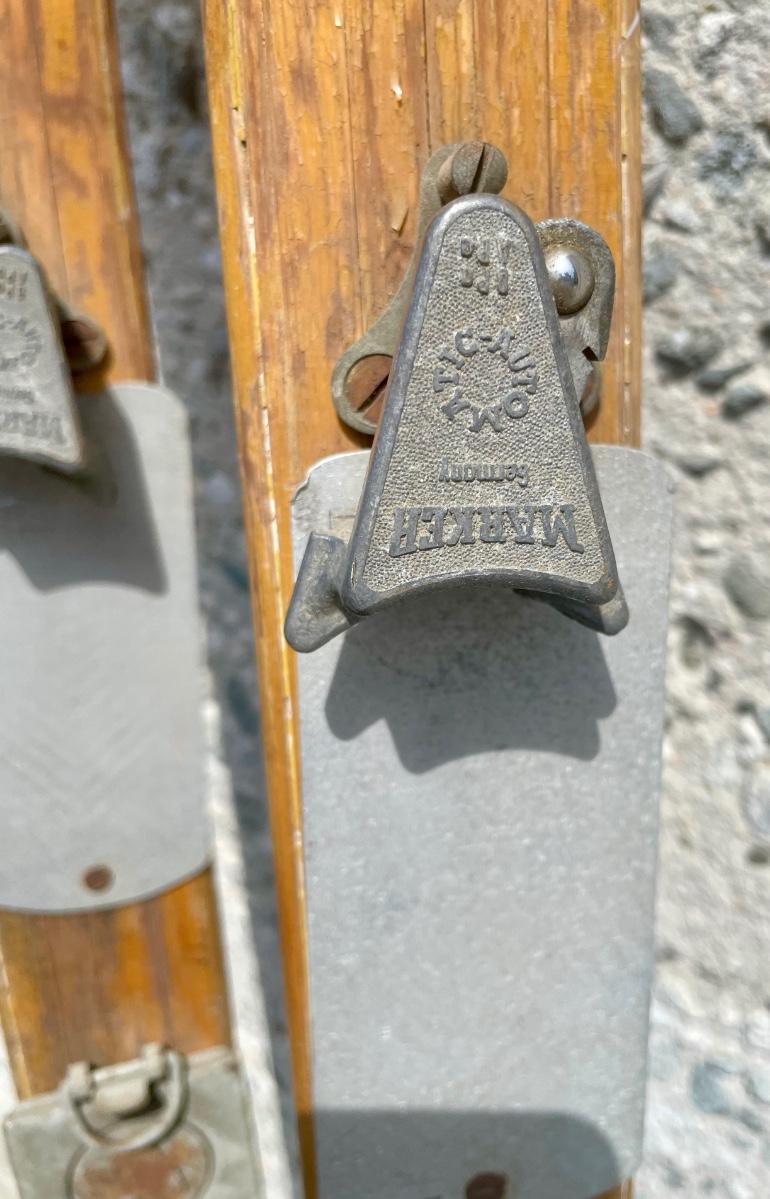 Metal bindings are stamped "Marker Automatic Germany". Skis have what appears to be a number of black and white German crosses, suggesting the origin is Germany. Age of skis and bindings is unknown. Bindings were first made by Marker in 1956. Skis are in poor condition, most likely only good for display or used as decor.