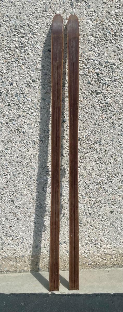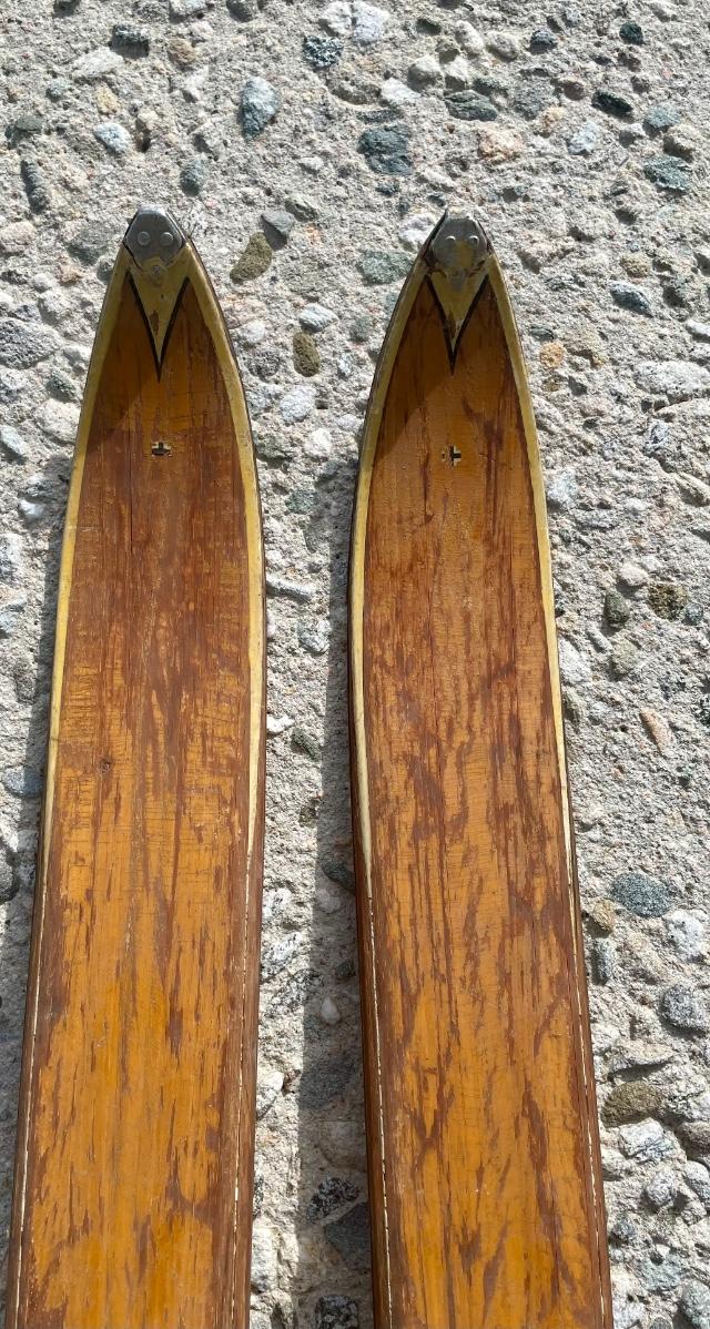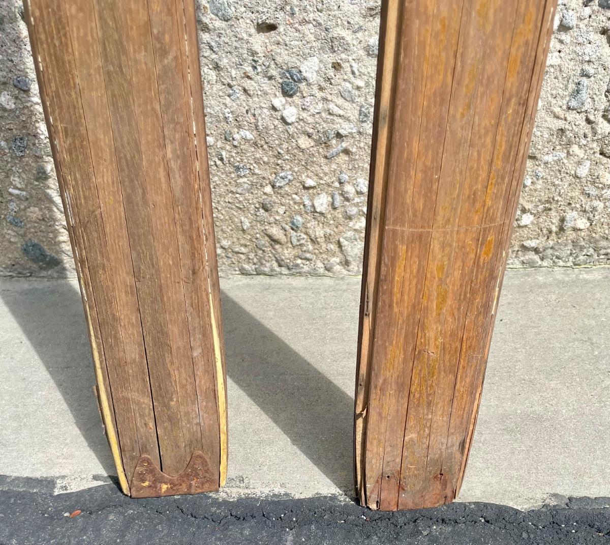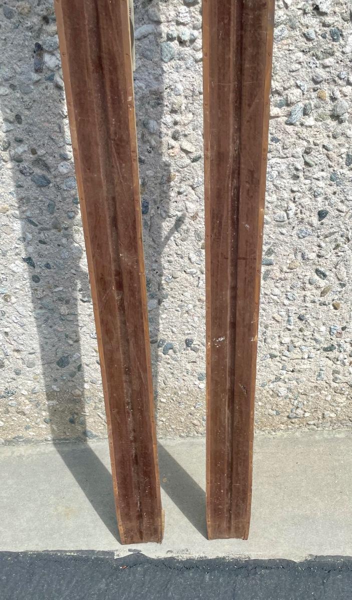 Metal bindings are stamped "Marker Automatic Germany". Skis have what appears to be a number of black and white German crosses, suggesting the origin is Germany. Age of skis and bindings is unknown. Bindings were first made by Marker in 1956. Skis are in poor condition, most likely only good for display or used as decor.
