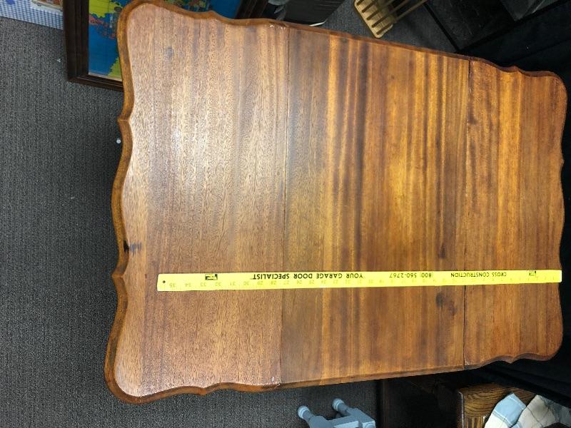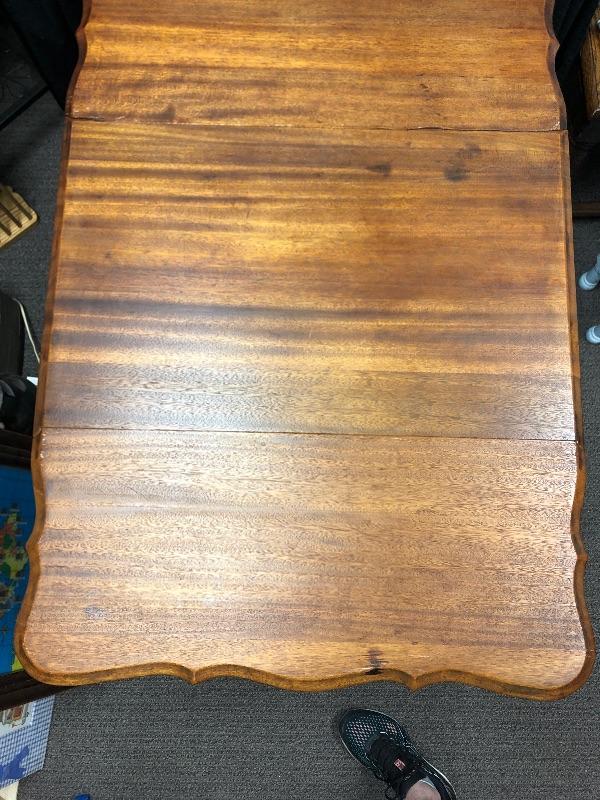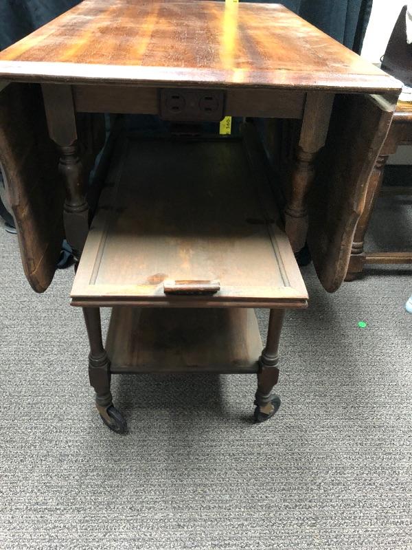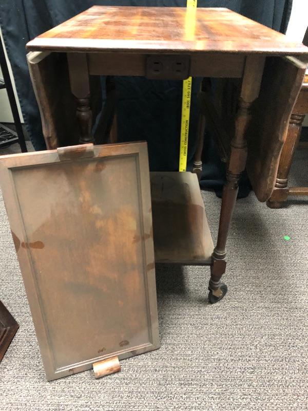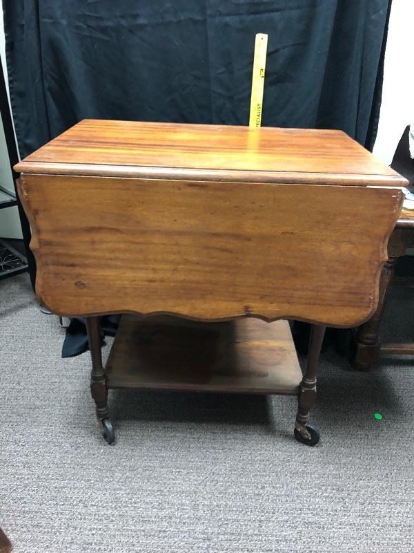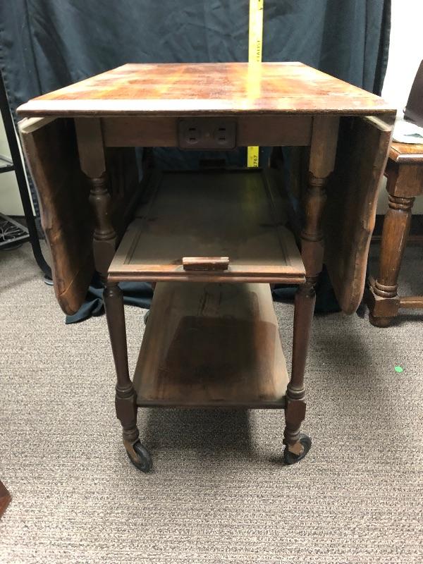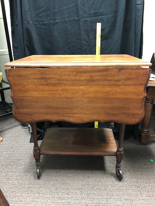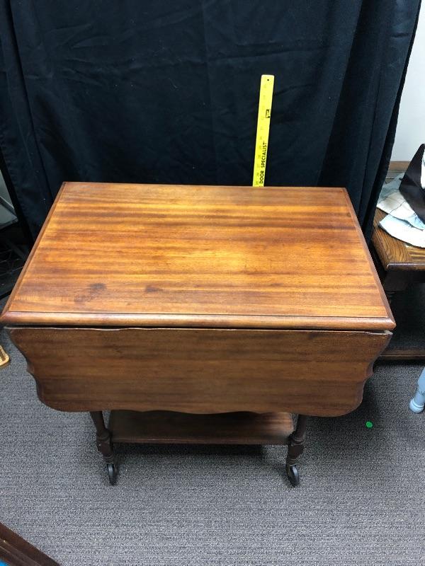 Vintage tea serving cart. Medium finish wood. Drop leaf sides. Has a removeable lower tray. Good Vintage Condition. Could use a little furniture oil and a cleaning. About 38" across with both side up. Metal support brackets.
