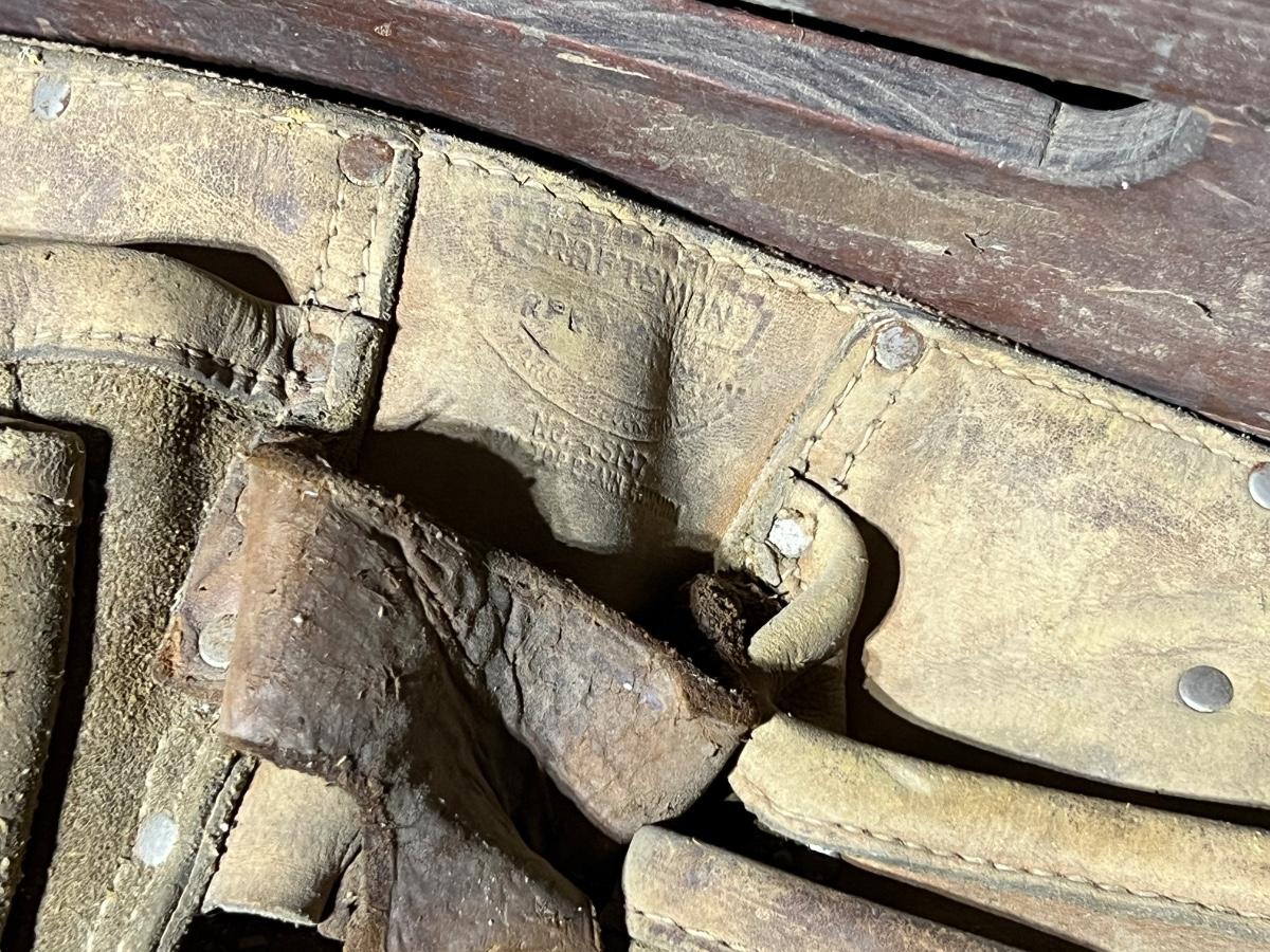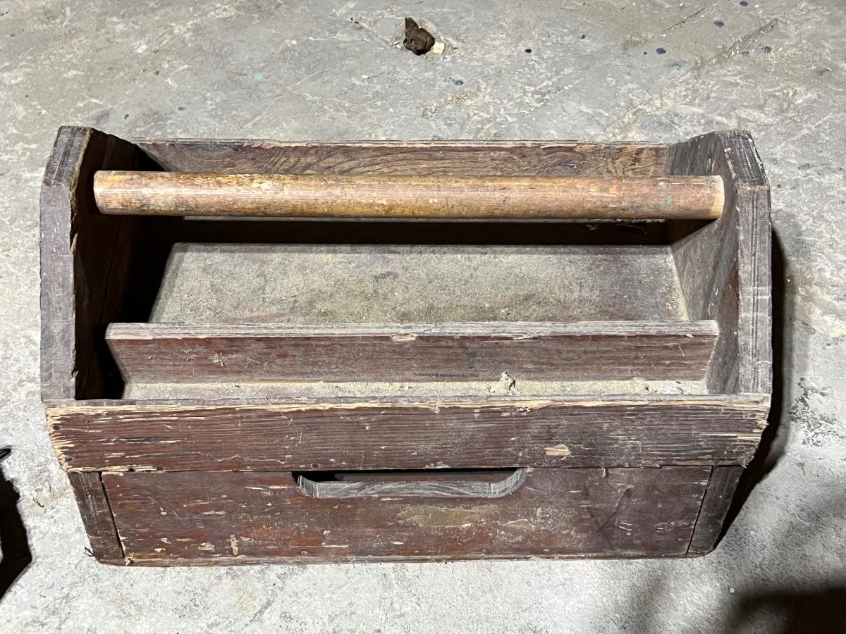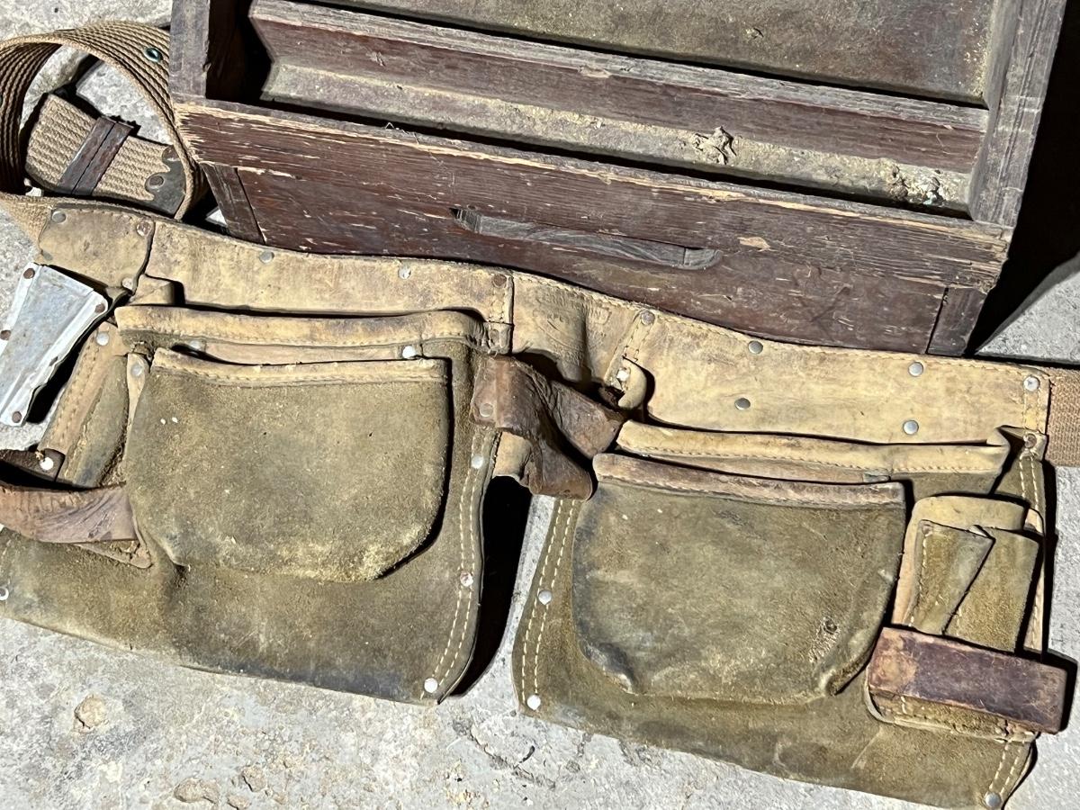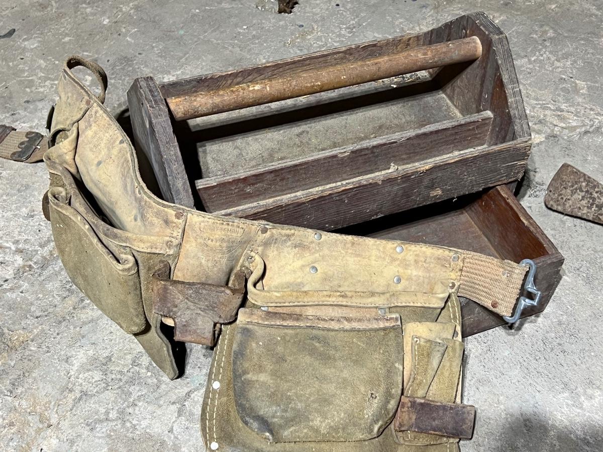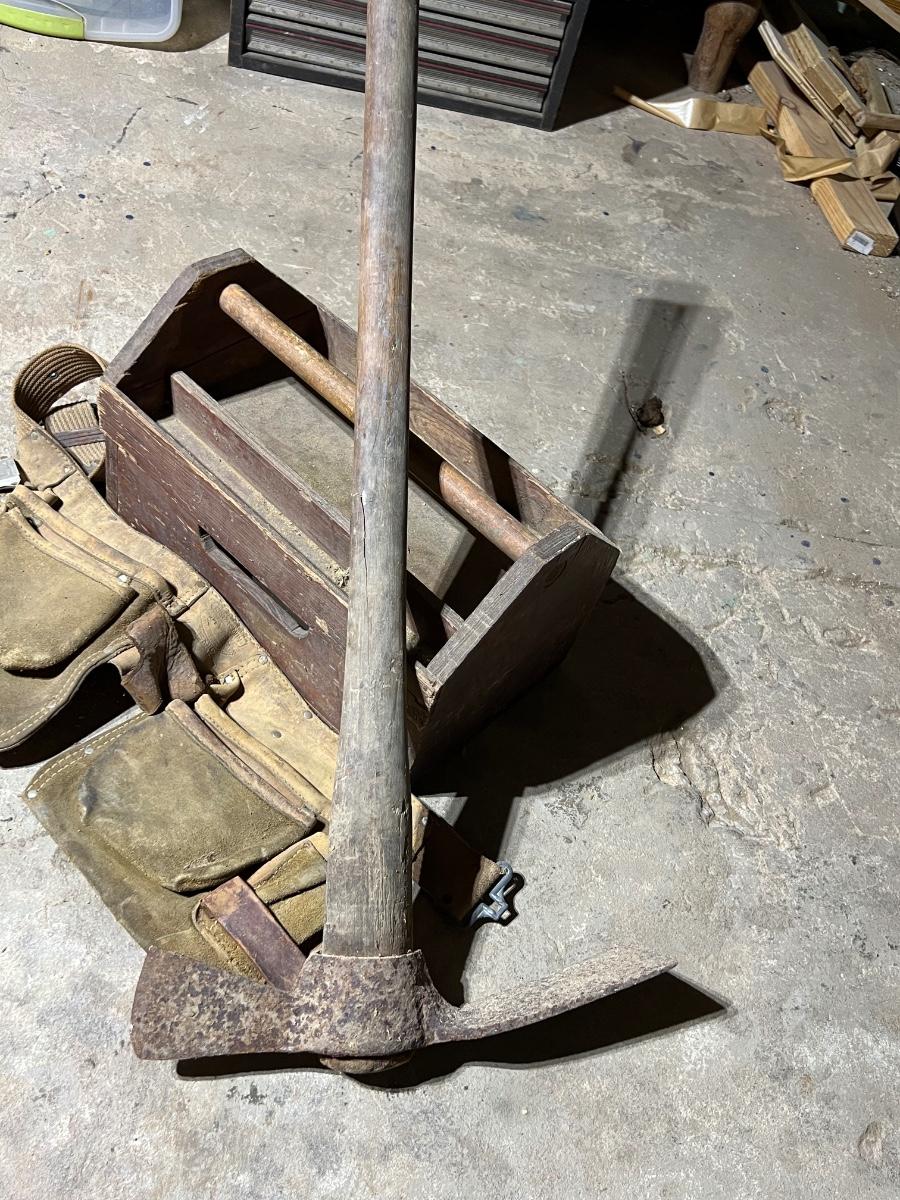 Vintage Wood Tool Caddy, Craftsman Tool Belt, and Pick Axe (basement)