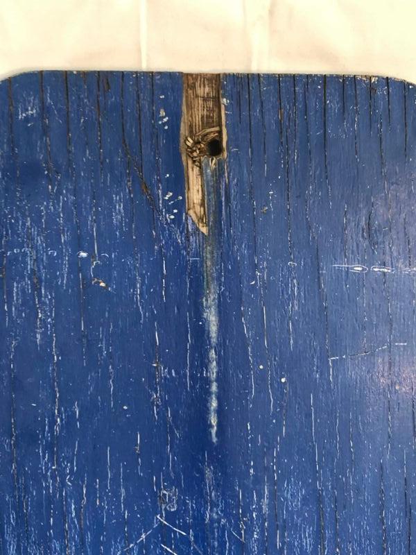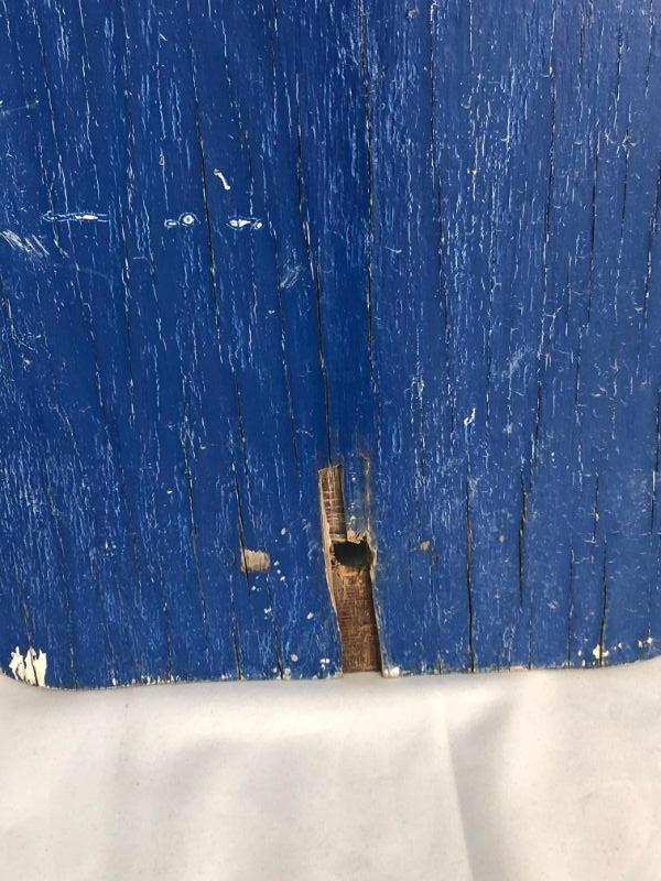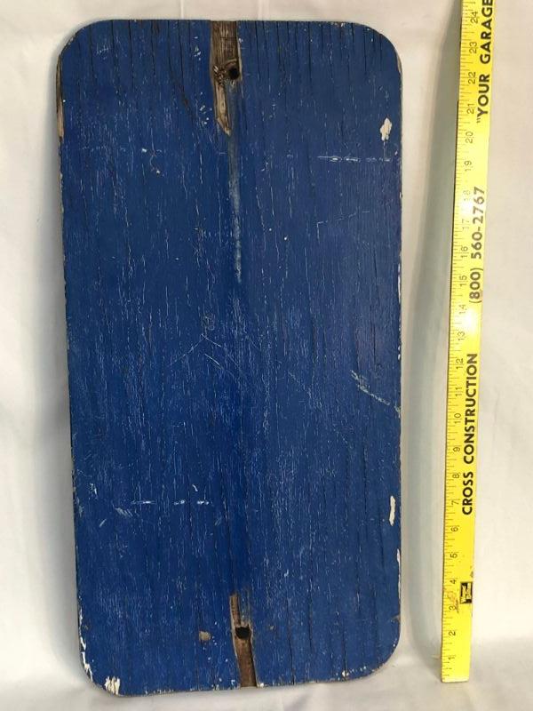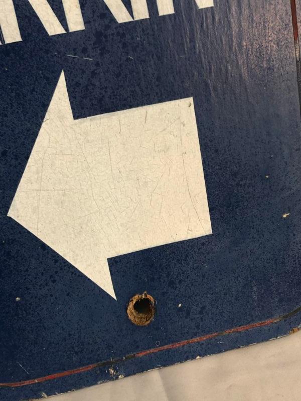 Wood Valet Parking Sign. Painted blue wood with white lettering and a white arrow pointing to the left. Has a few scratches. and chipped up wood. About 24" tall.