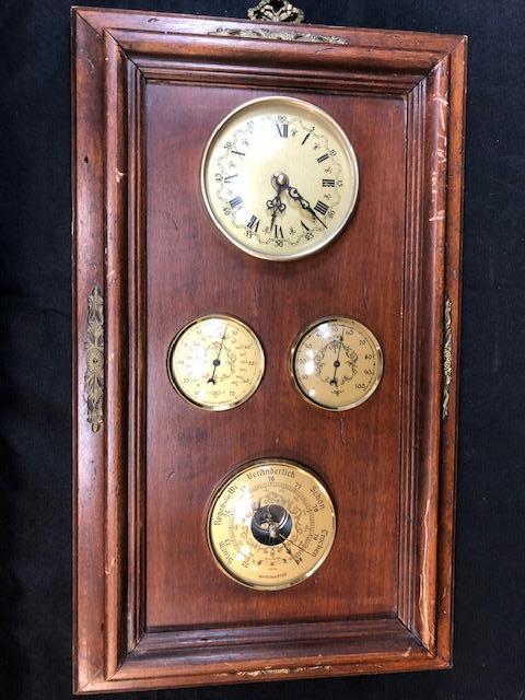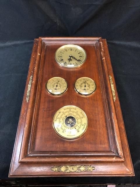 Vintage wall clock barometer thermometer combination. Wood wall hanging. Battery operated clock.