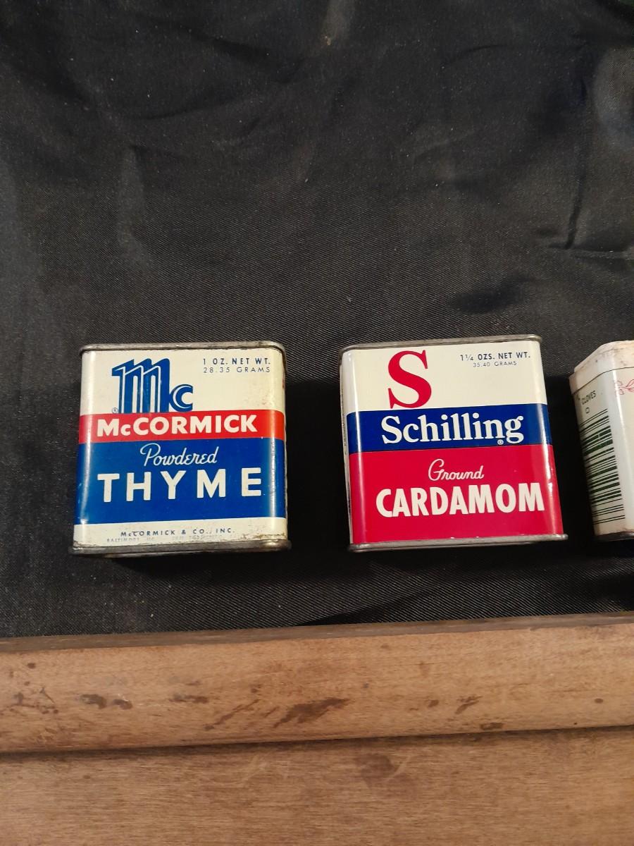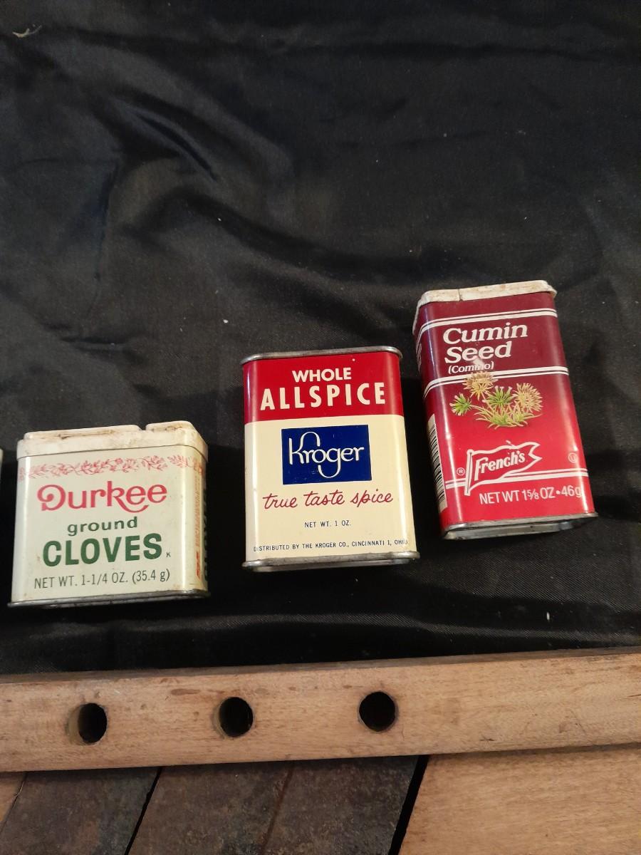 VINTAGE WOODEN 3 BLADE CABBAGE / KRAUT CUTTER AND SEVERAL METAL OLDER SPICE CONTAINERS