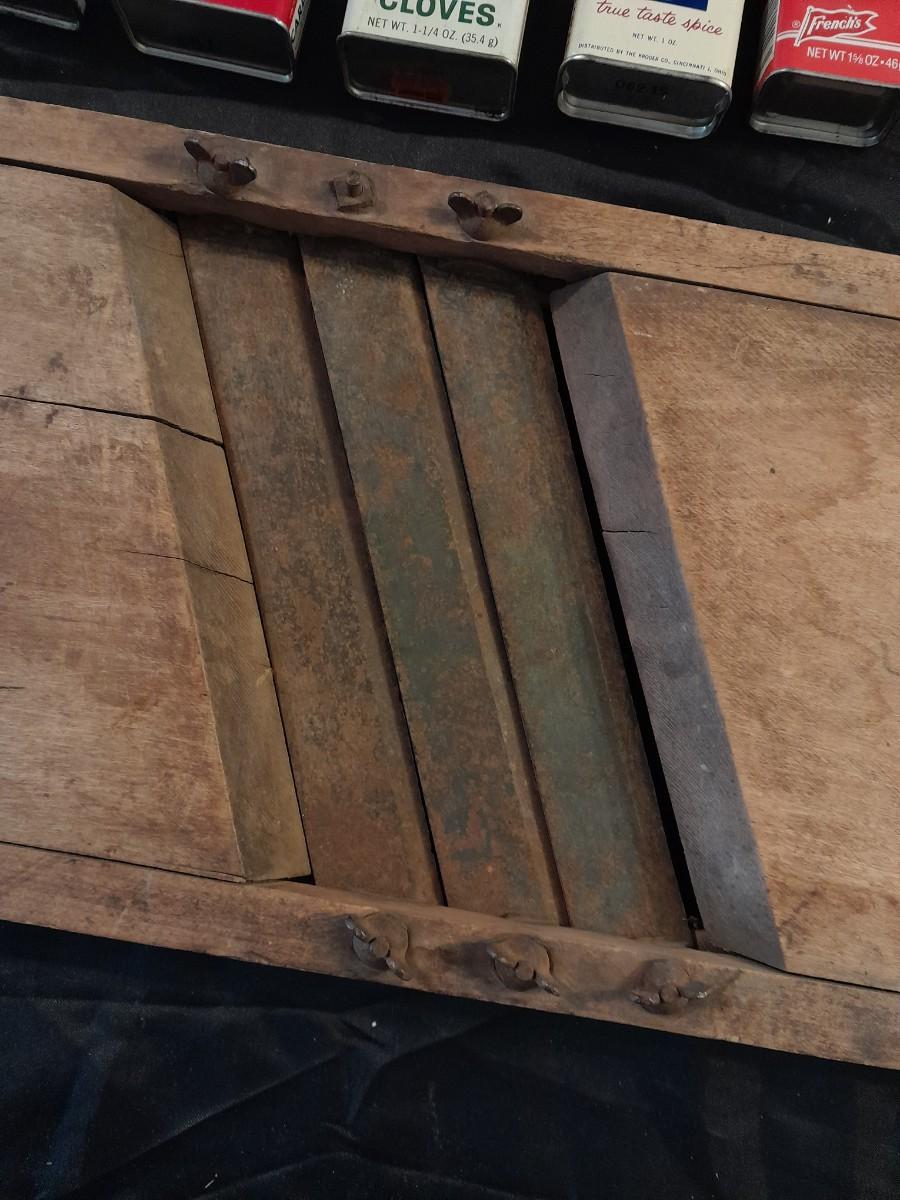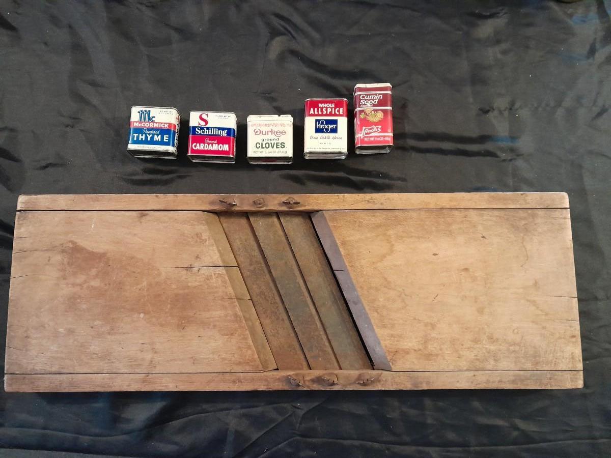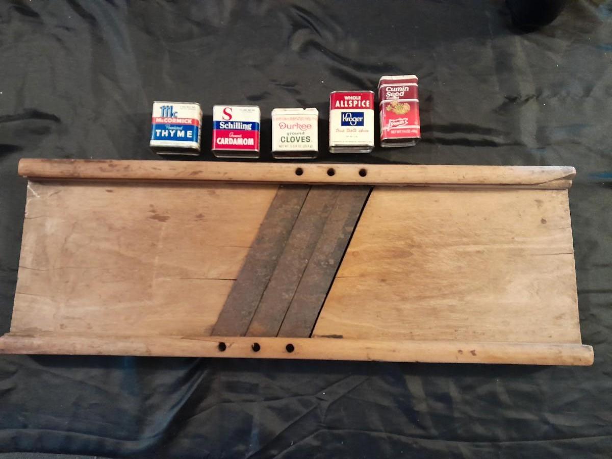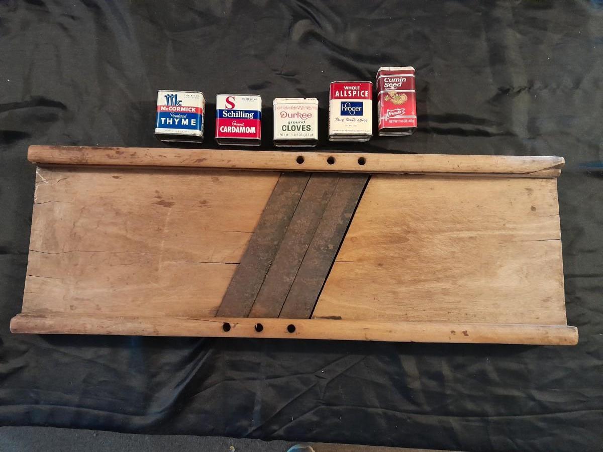 VINTAGE WOODEN 3 BLADE CABBAGE / KRAUT CUTTER AND OLDER SPICE CONTAINERS