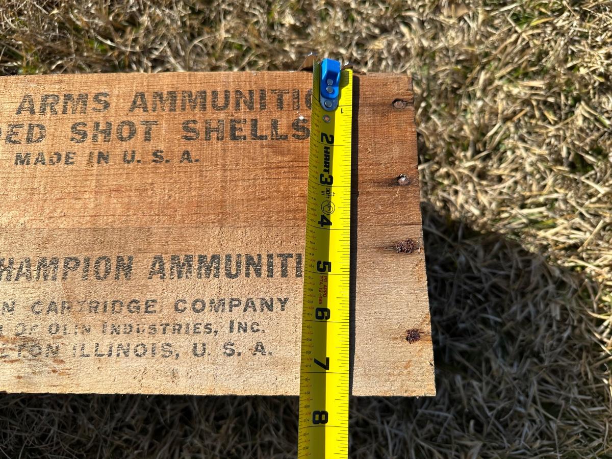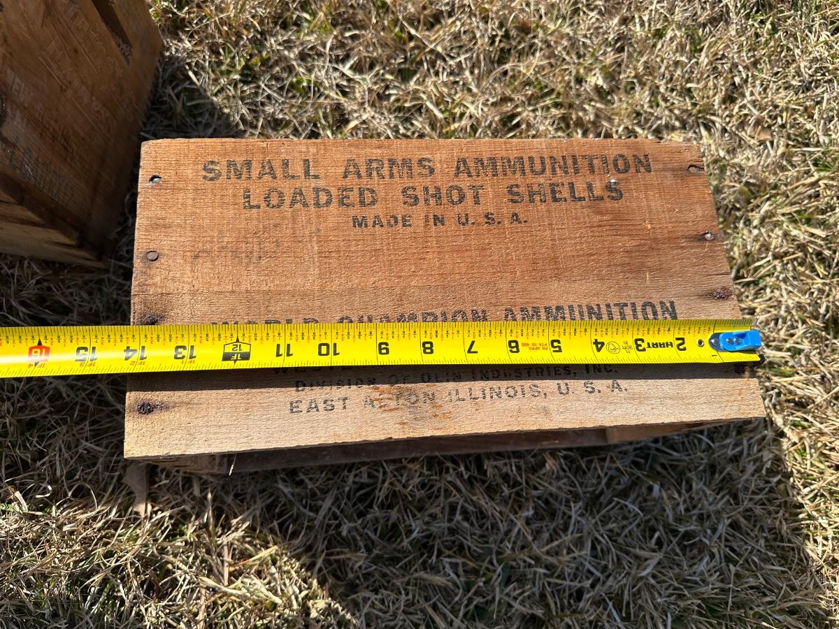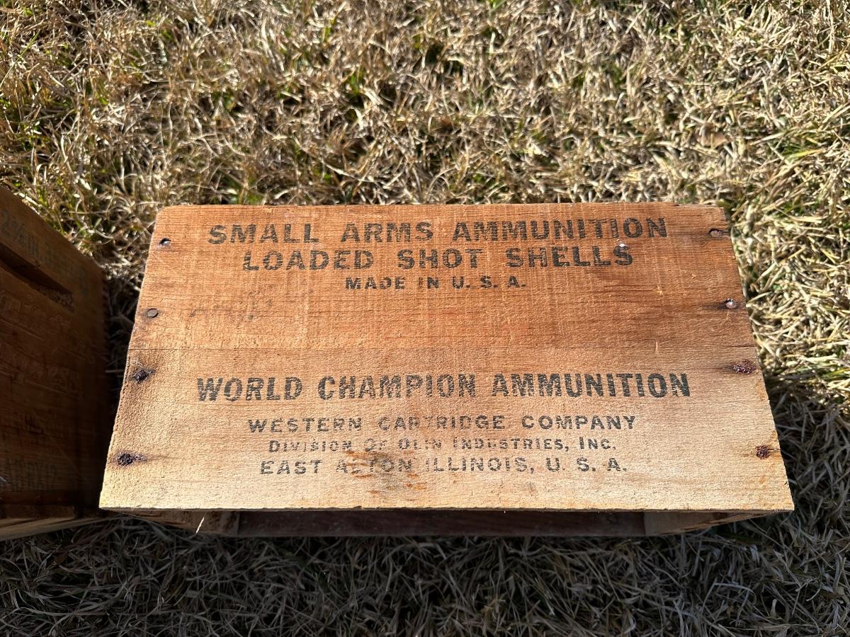 Authentic vintage wooden ammunition crates used for shotgun shell storage and transport. Both feature original factory stenciling, finger-joint construction, and cut-out carry handles. These are original period boxes, not reproductions.