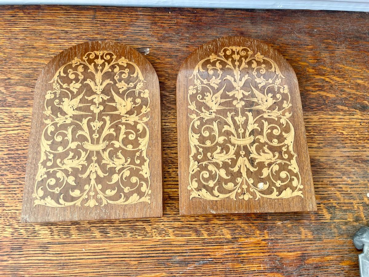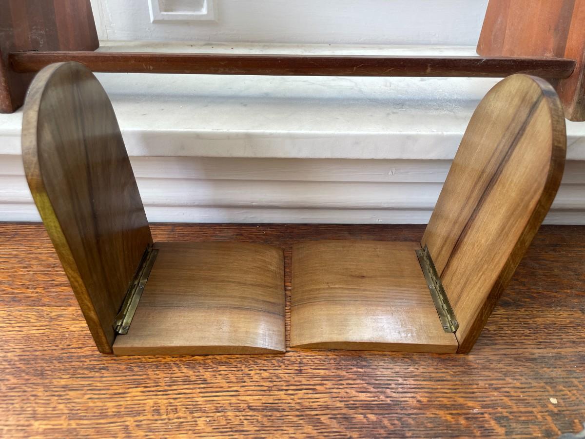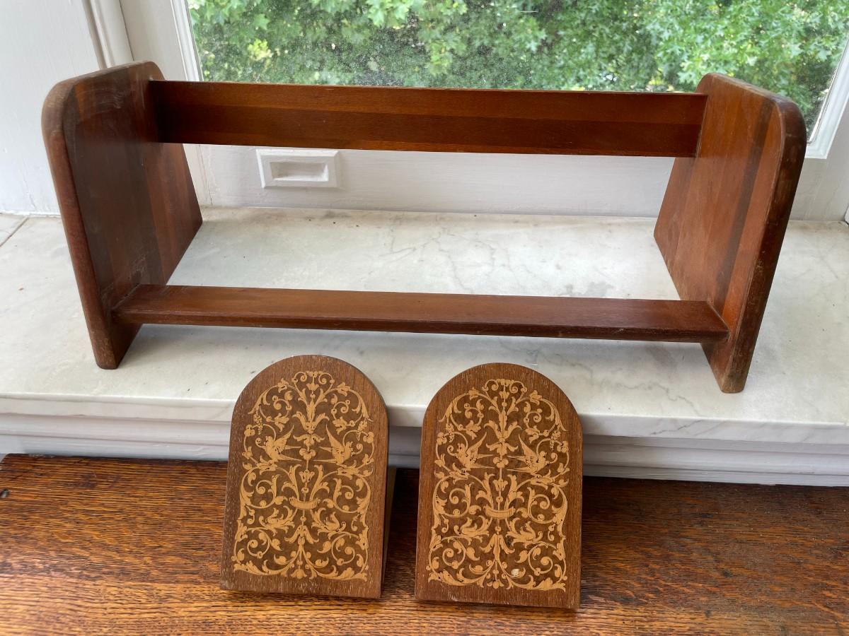 Vintage wooden book rack and set of inlay folding book ends