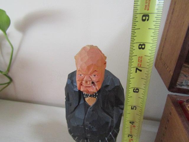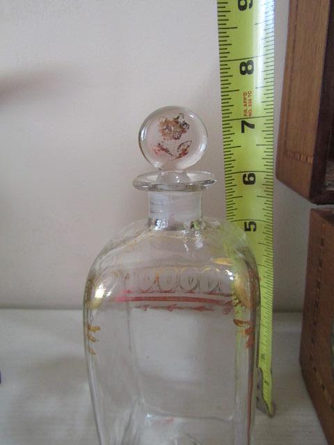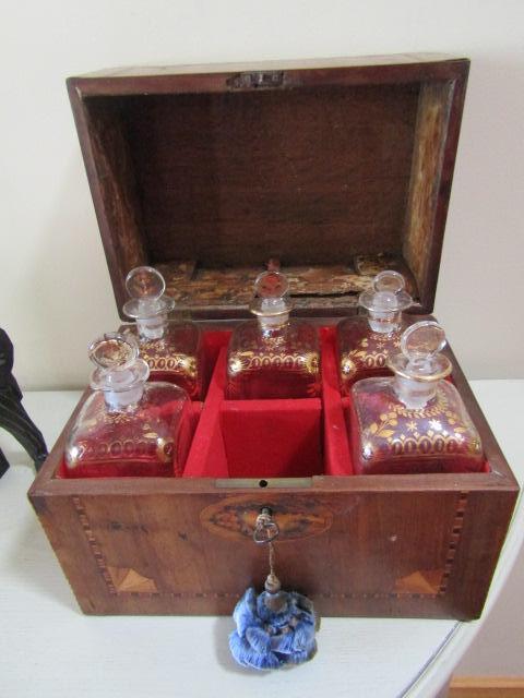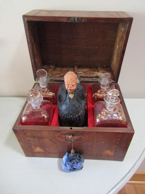 Vintage Wooden Box with Glass Decanters and 'Winston Churchill' Drinking Buddy