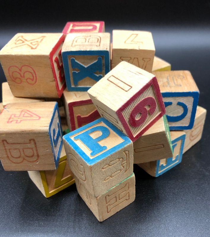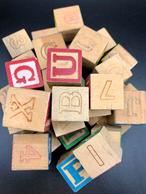 Vintage wooden Building Blocks, ABC's, 123,s, shapes, colors Learning Aid 37 blocks