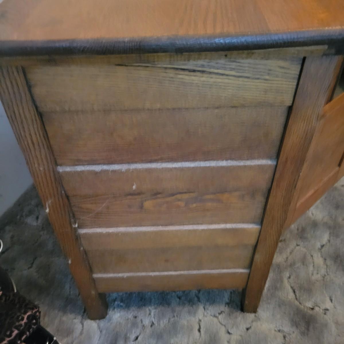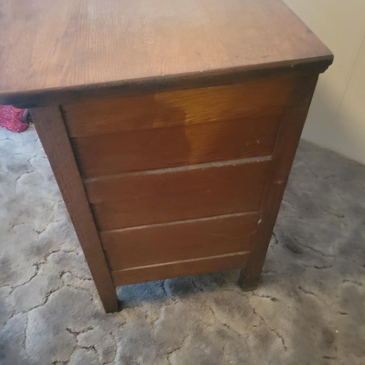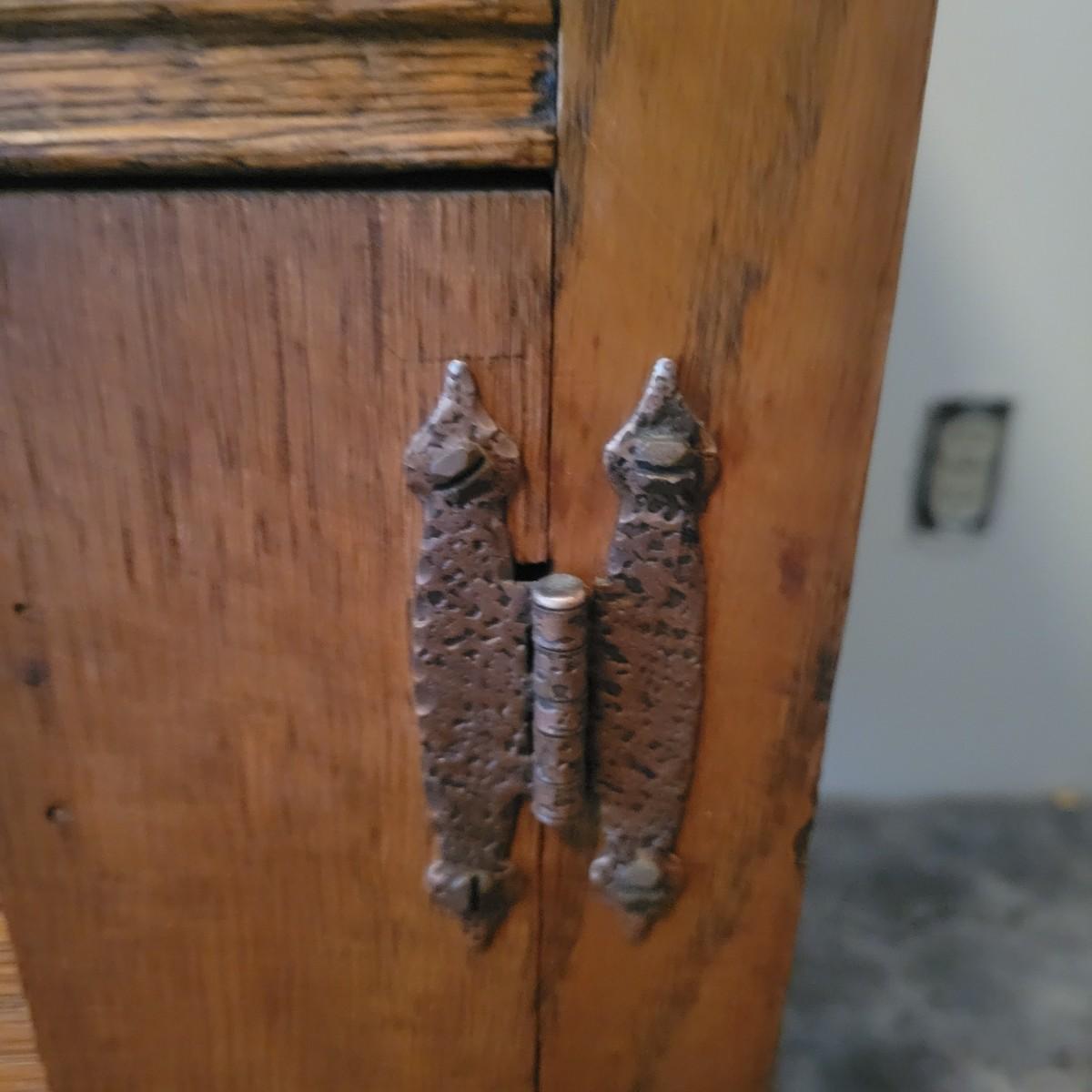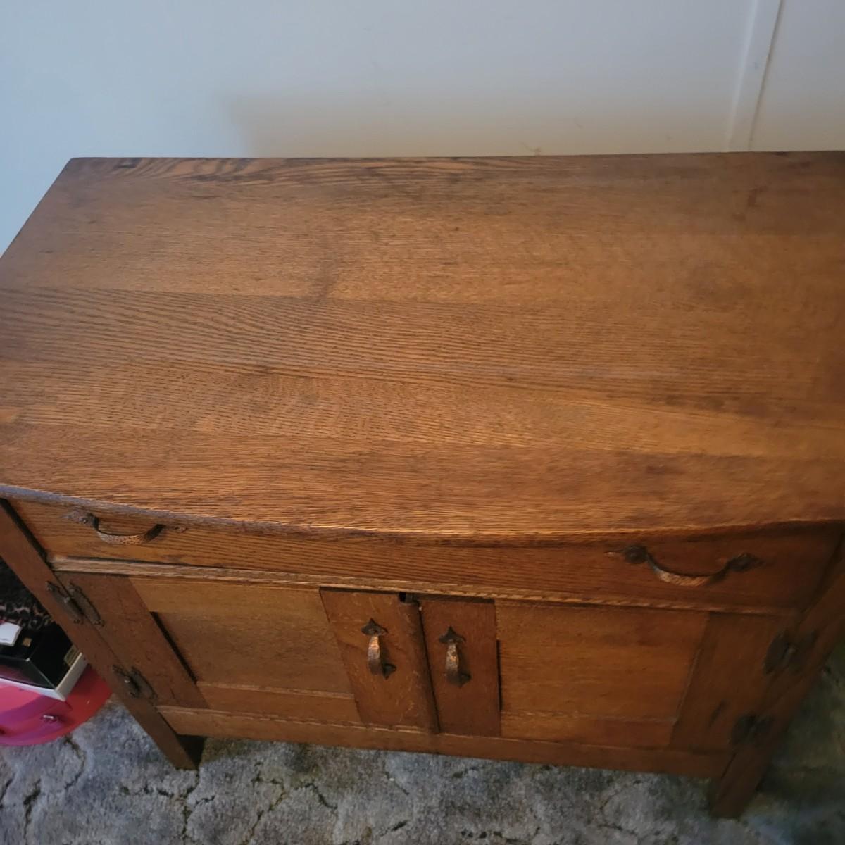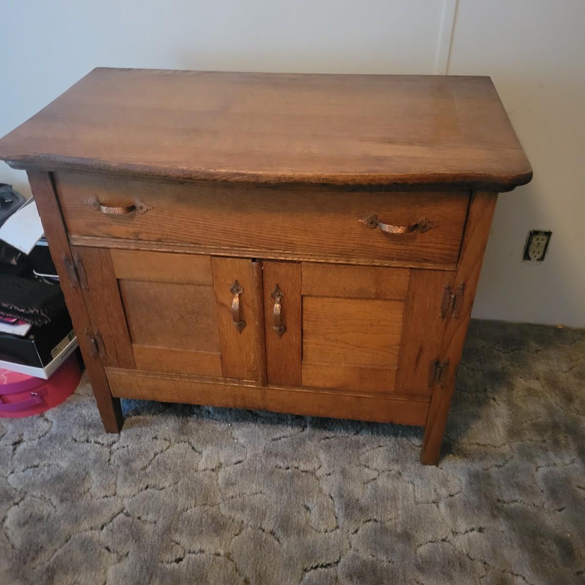 A small antique, solid wood cabinet with one drawer in good condition with no notable damage. Cabinet features dovetailed drawers and copper looking hardware. Made by Waynesville Furniture Co. Cabinet doors don't secure completely. Measures approximately 33" x 19" x 28" Local pickup only