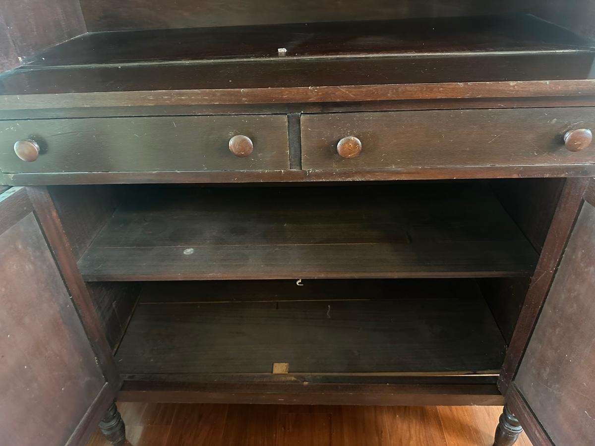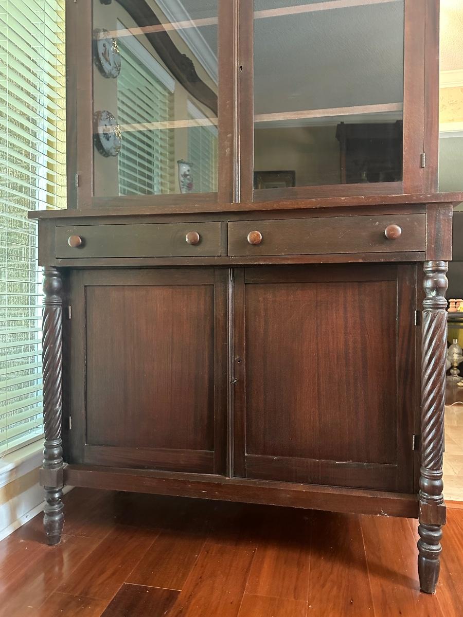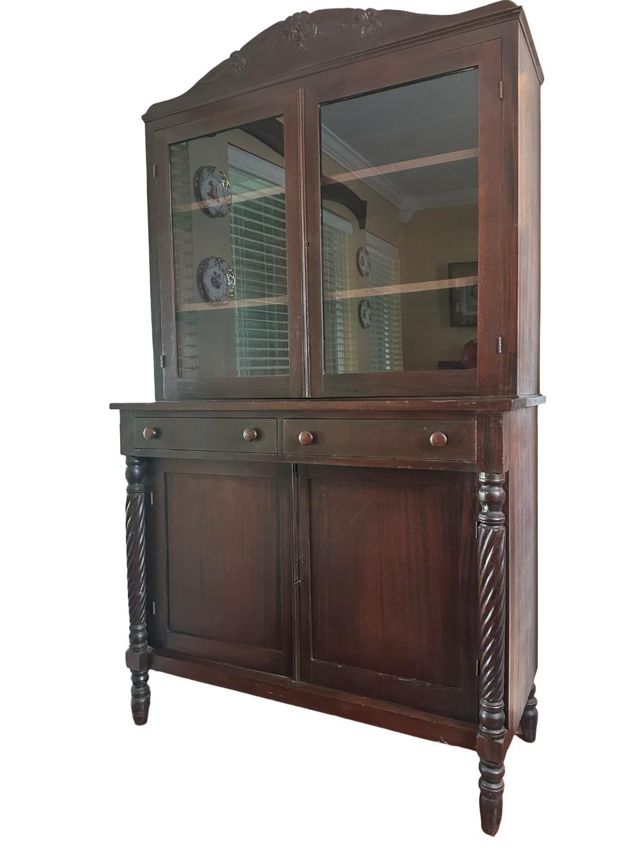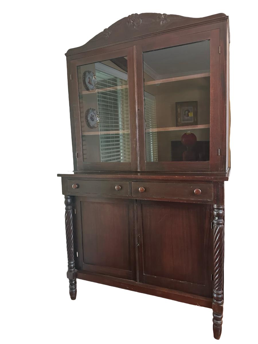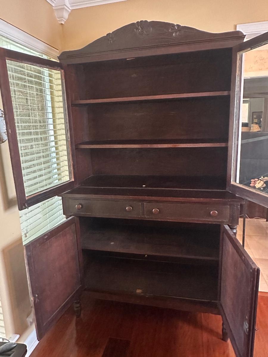 Vintage wooden china cabinet with glass-front display doors, interior shelving, drawers, and lower cabinet storage. Shows surface wear and finish loss consistent with age and use, including damage to one lower leg; see photos for condition.