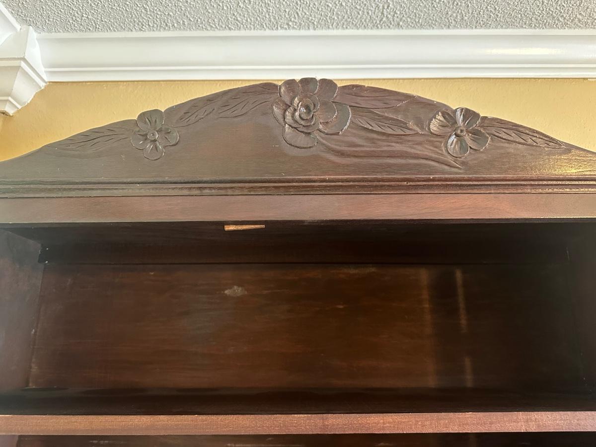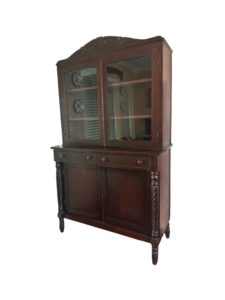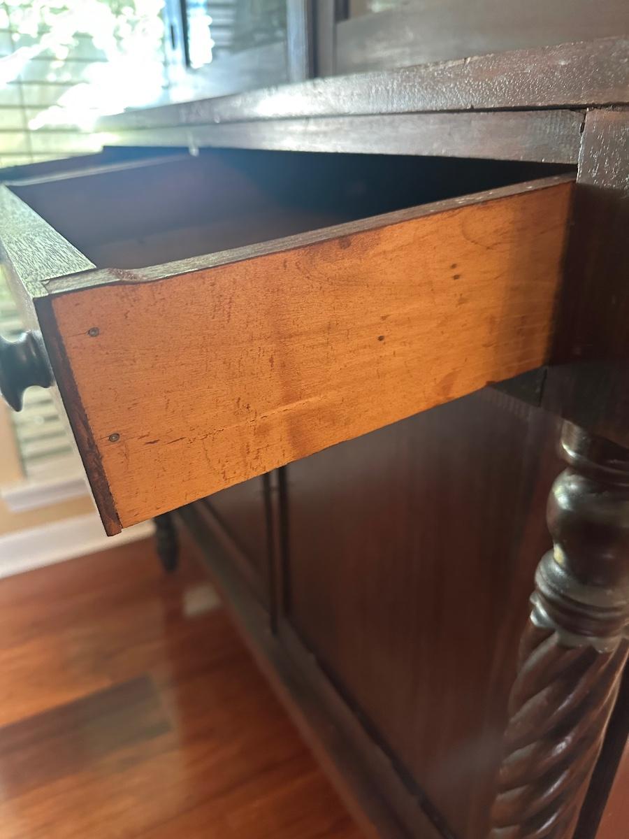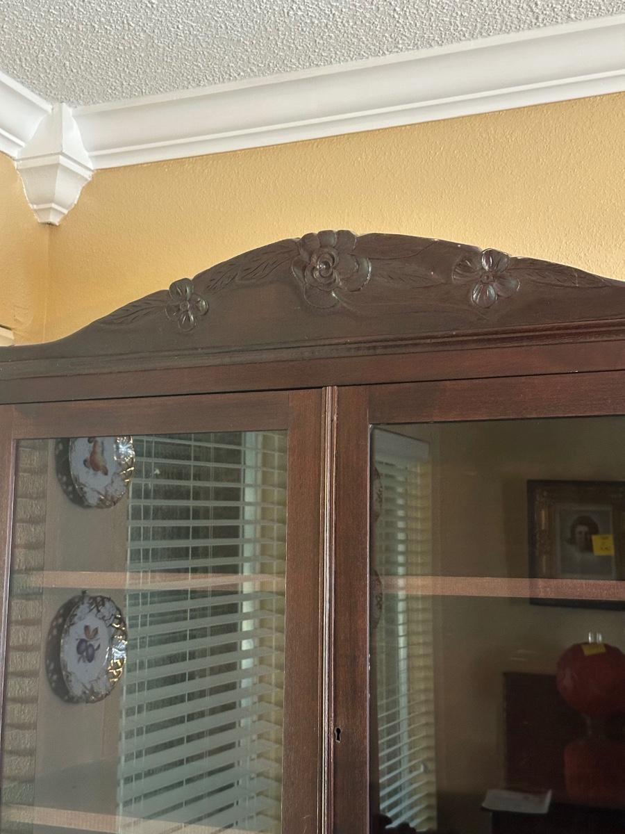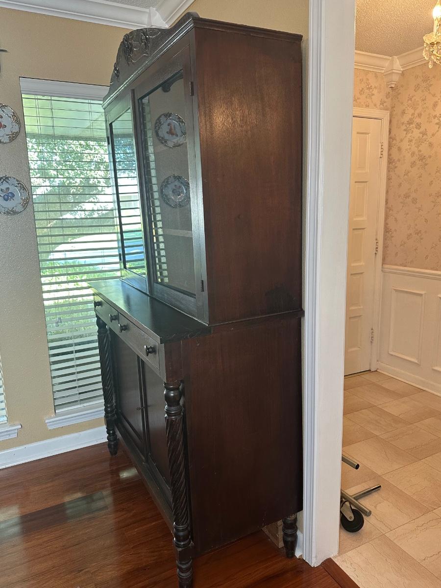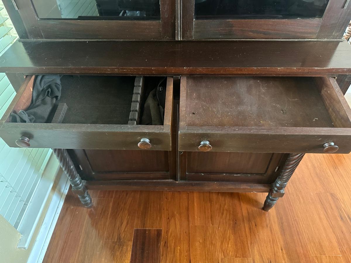 Vintage wooden china cabinet with glass-front display doors, interior shelving, drawers, and lower cabinet storage. Shows surface wear and finish loss consistent with age and use, including damage to one lower leg; see photos for condition.