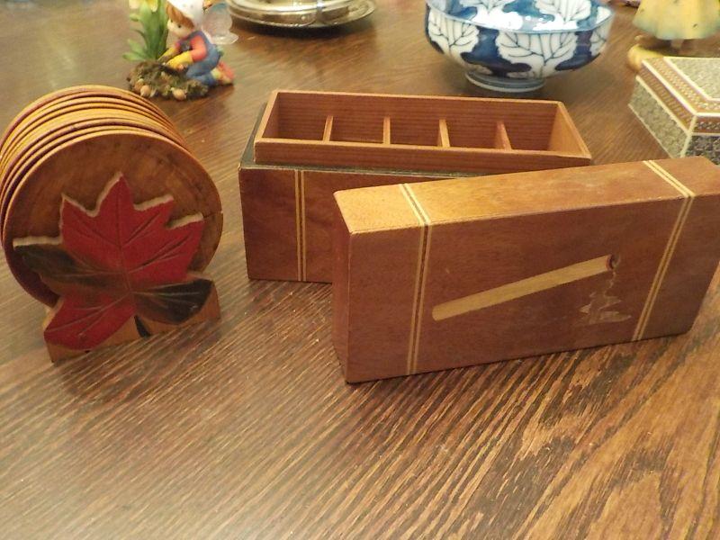 Hand made wood box for smoking and 8 drink casters hand made of wood.