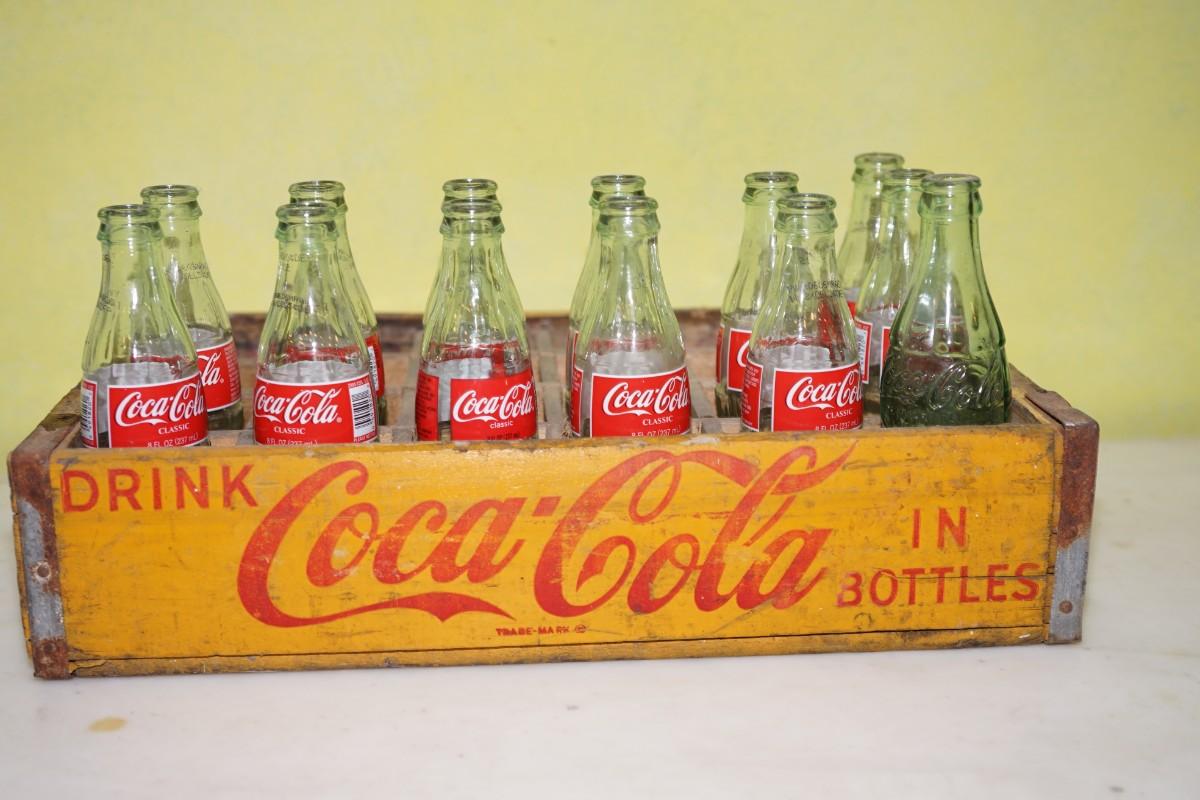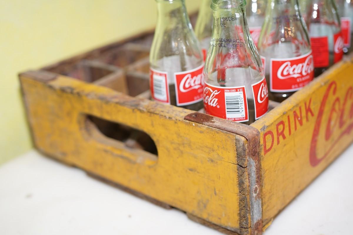 VINTAGE WOODEN COKE CRATE / NICE PAINT/ W VINTAGE COKE BOTTLES