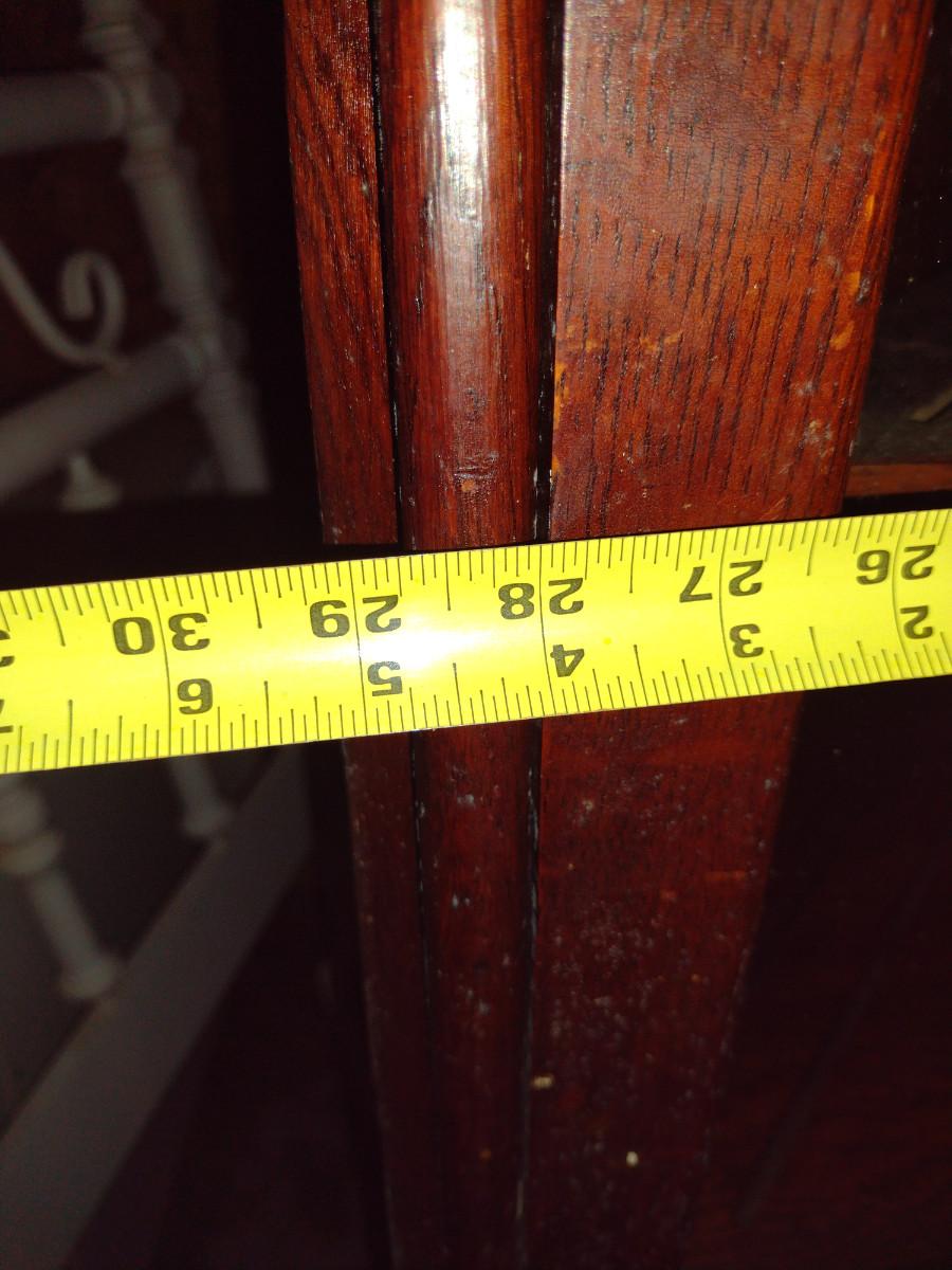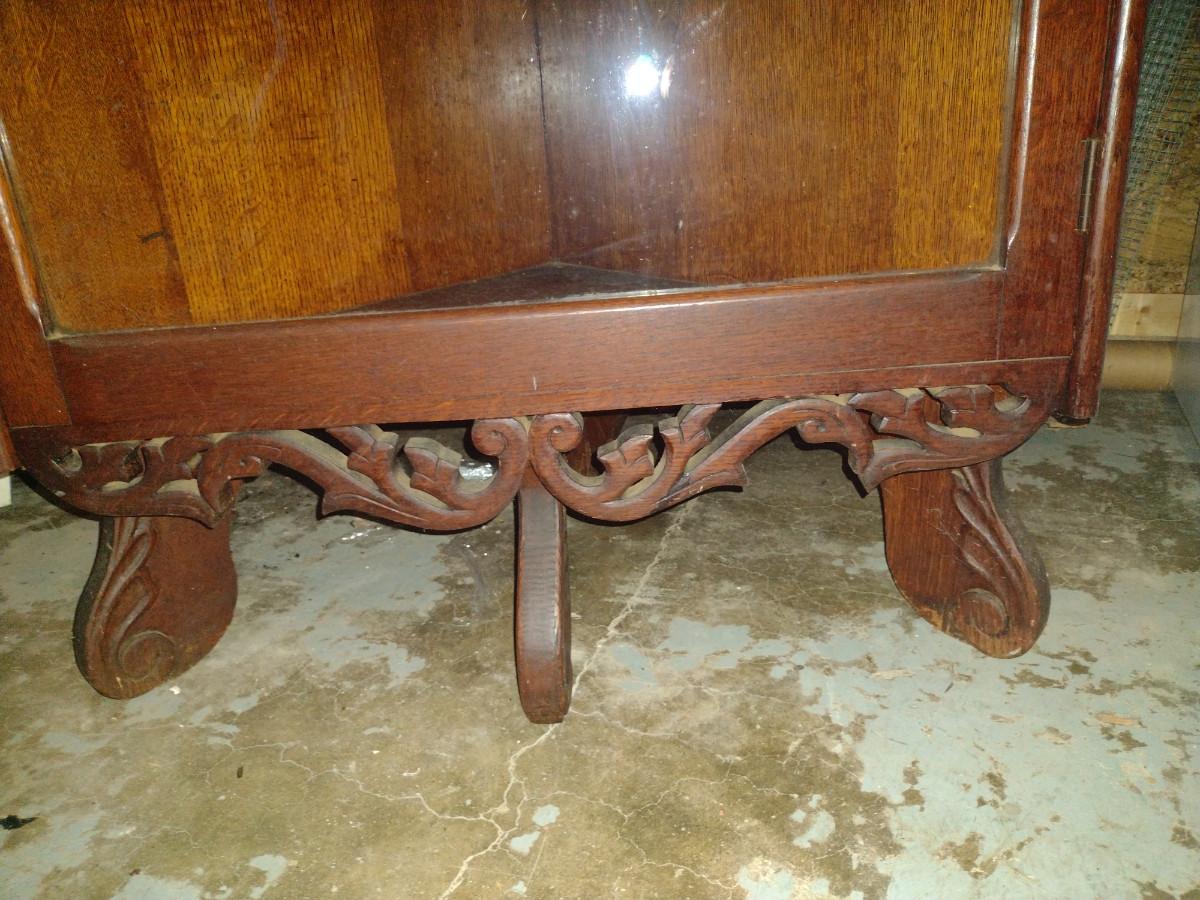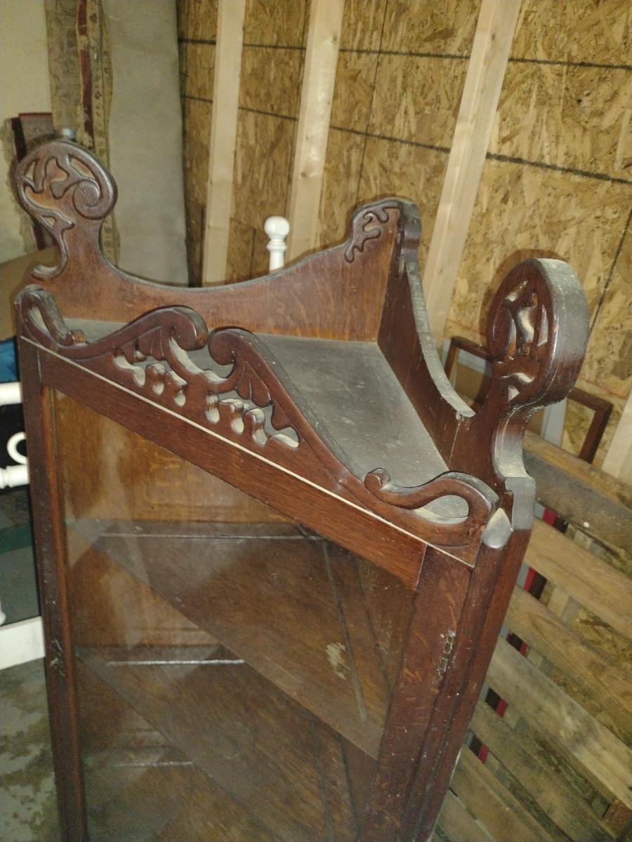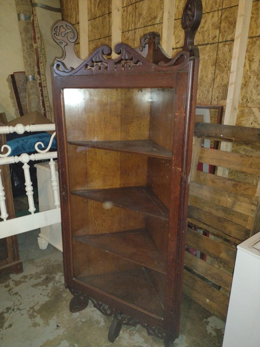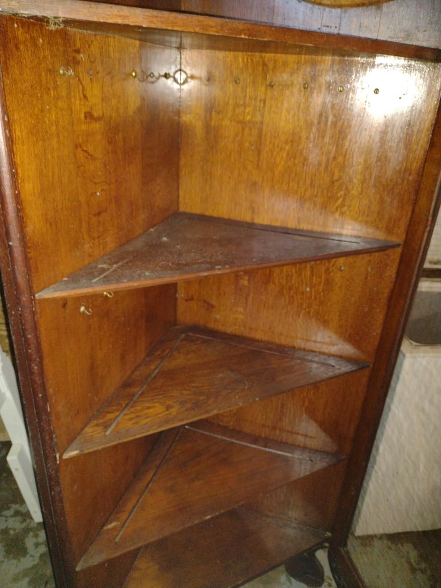 Vintage Wooden Corner Hutch. Measures approx 29" wide, 17" deep, 67" tall.