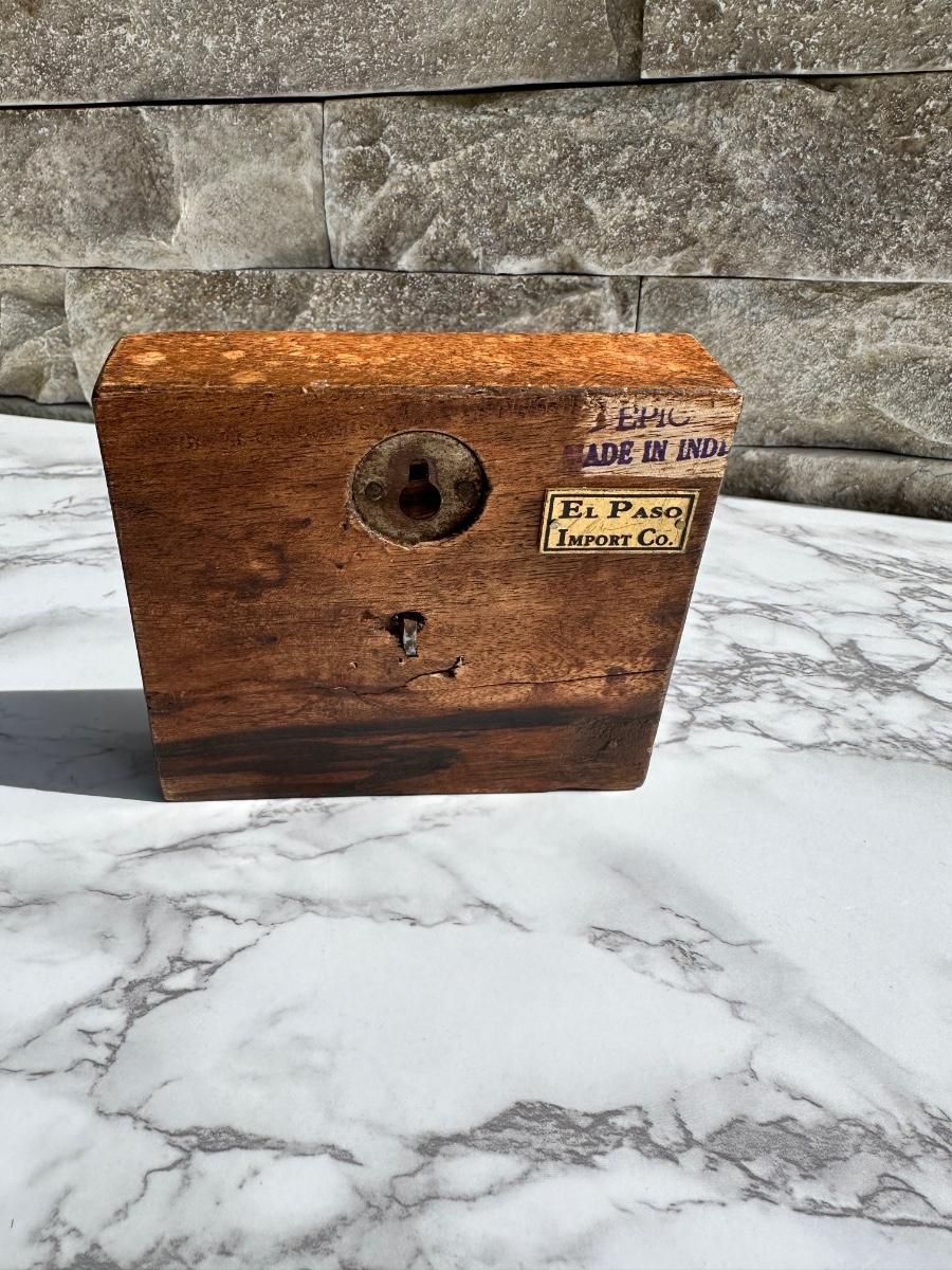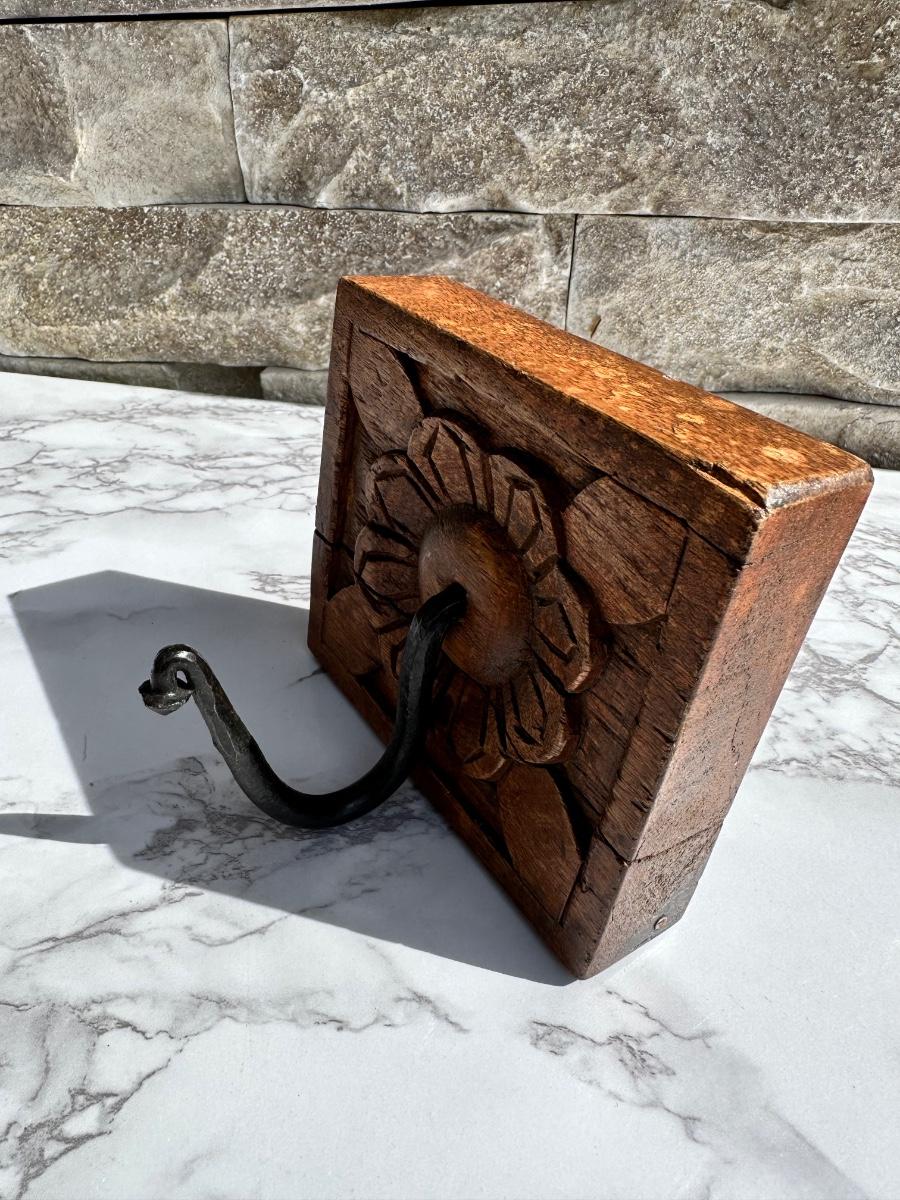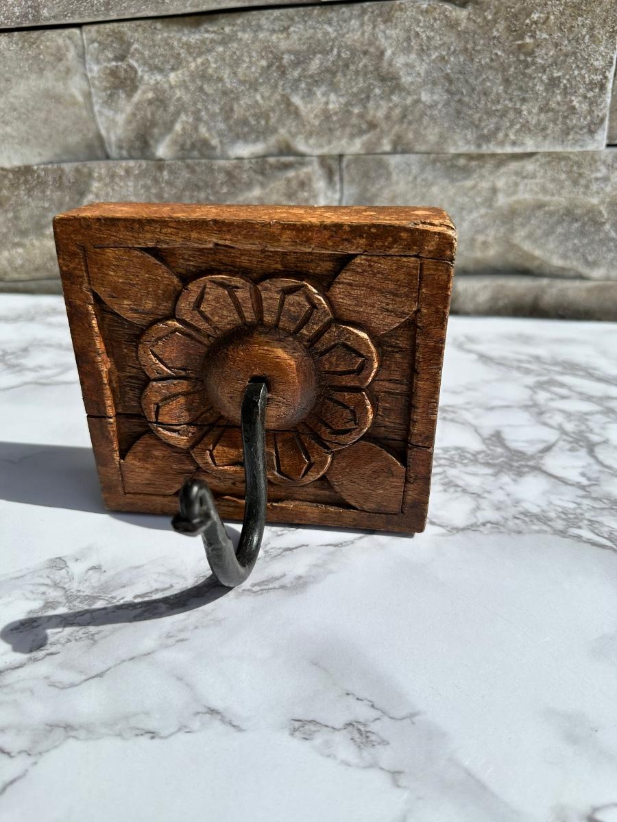 Vintage wooden floral carved block with heavy duty metal hanger or hook. Has flush metal hanger on back for wall mount. 4.5" square block. 2" thick. Wood is in varying shades of brown due to age. Still on good shape. See pictures.