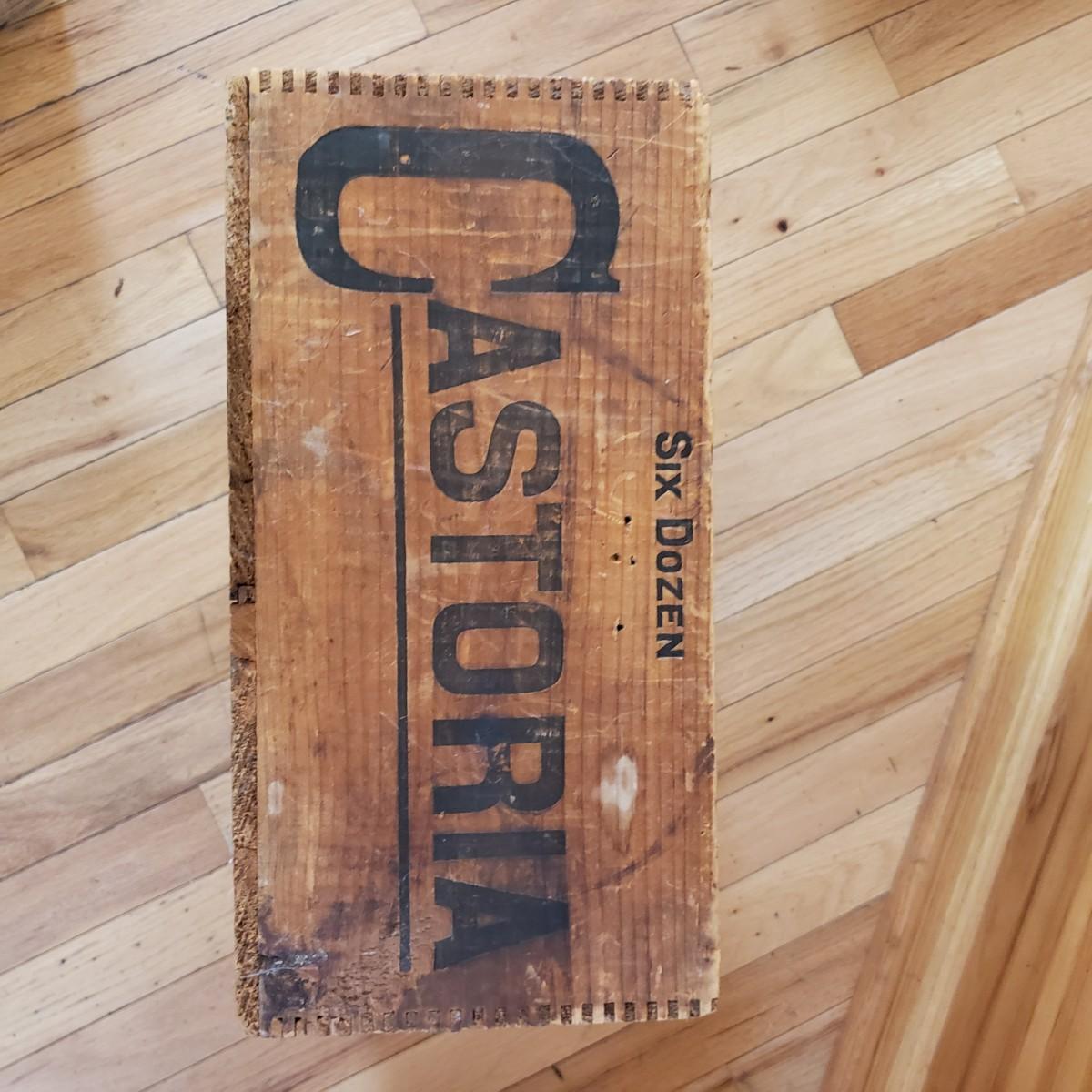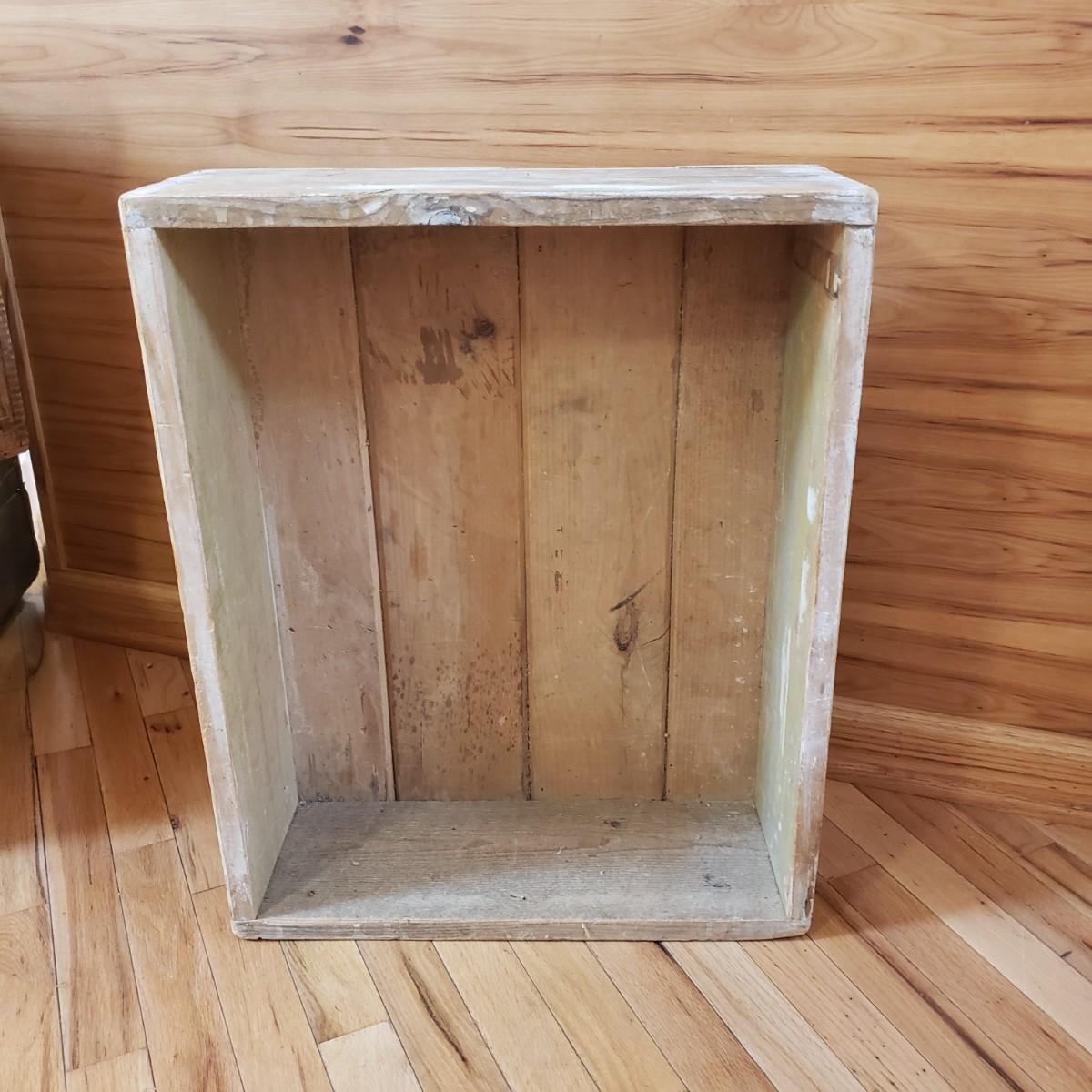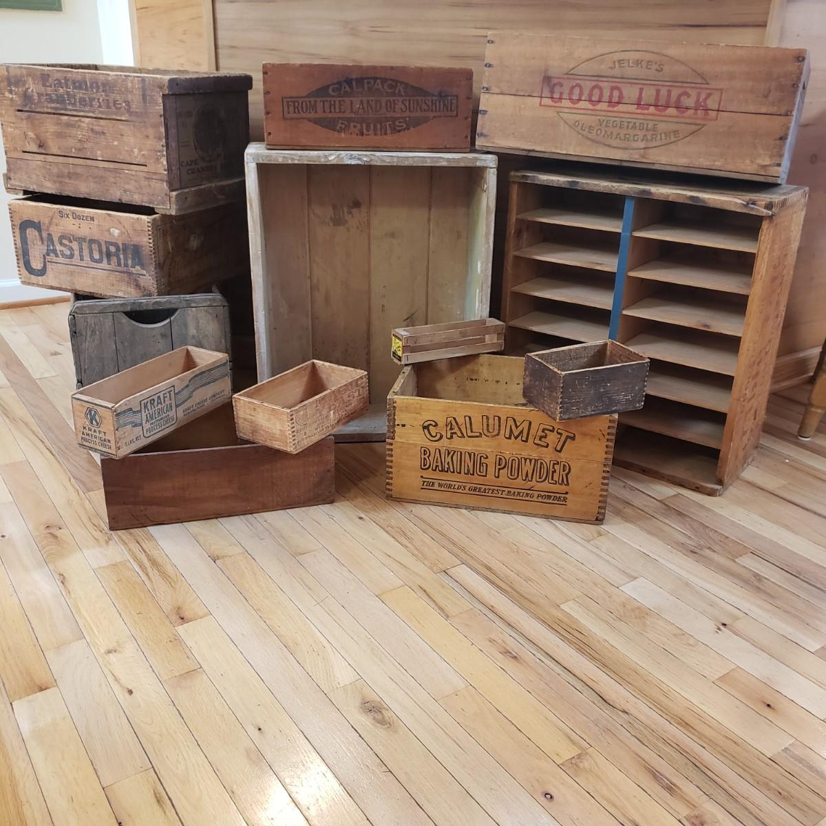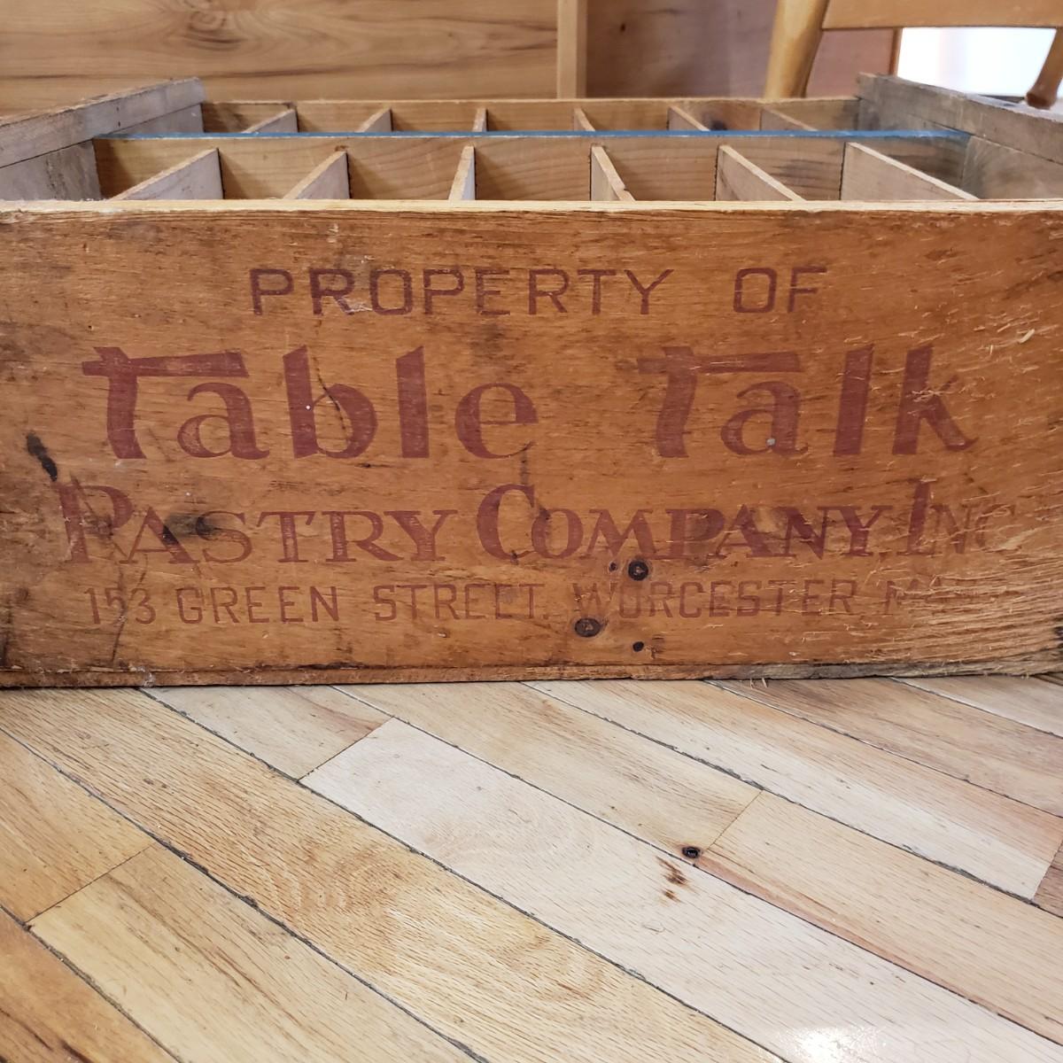 This lot features 13 wooden crates, most are stamped with their company name and product. The Table Talk crate with dividers/shelves measures 22" x 21" x 10" H. The Castoria crate is 14" x 15" x 7" H. See pictures for brands and products.