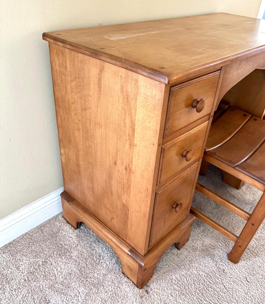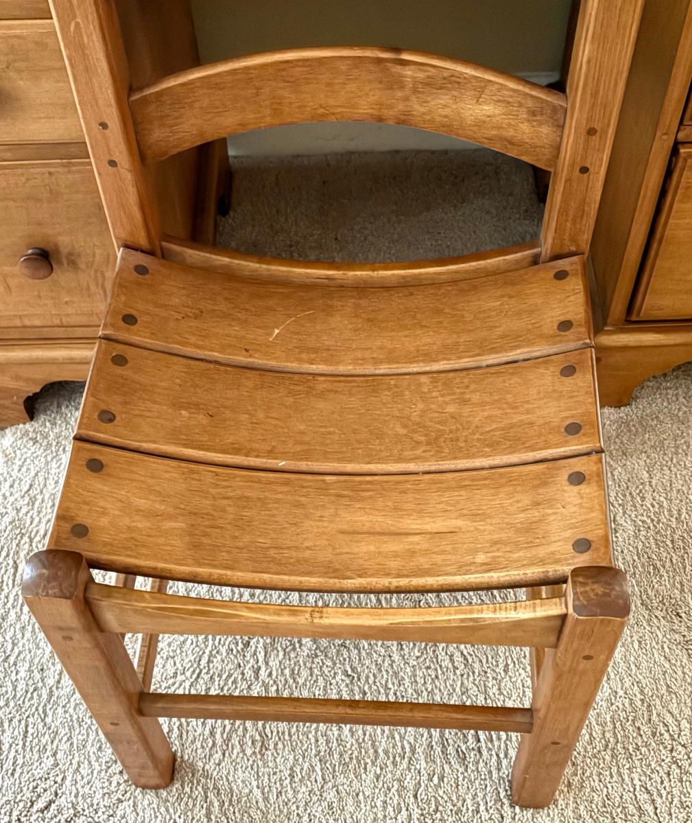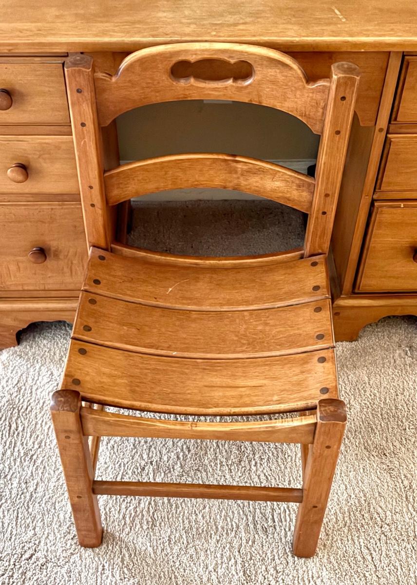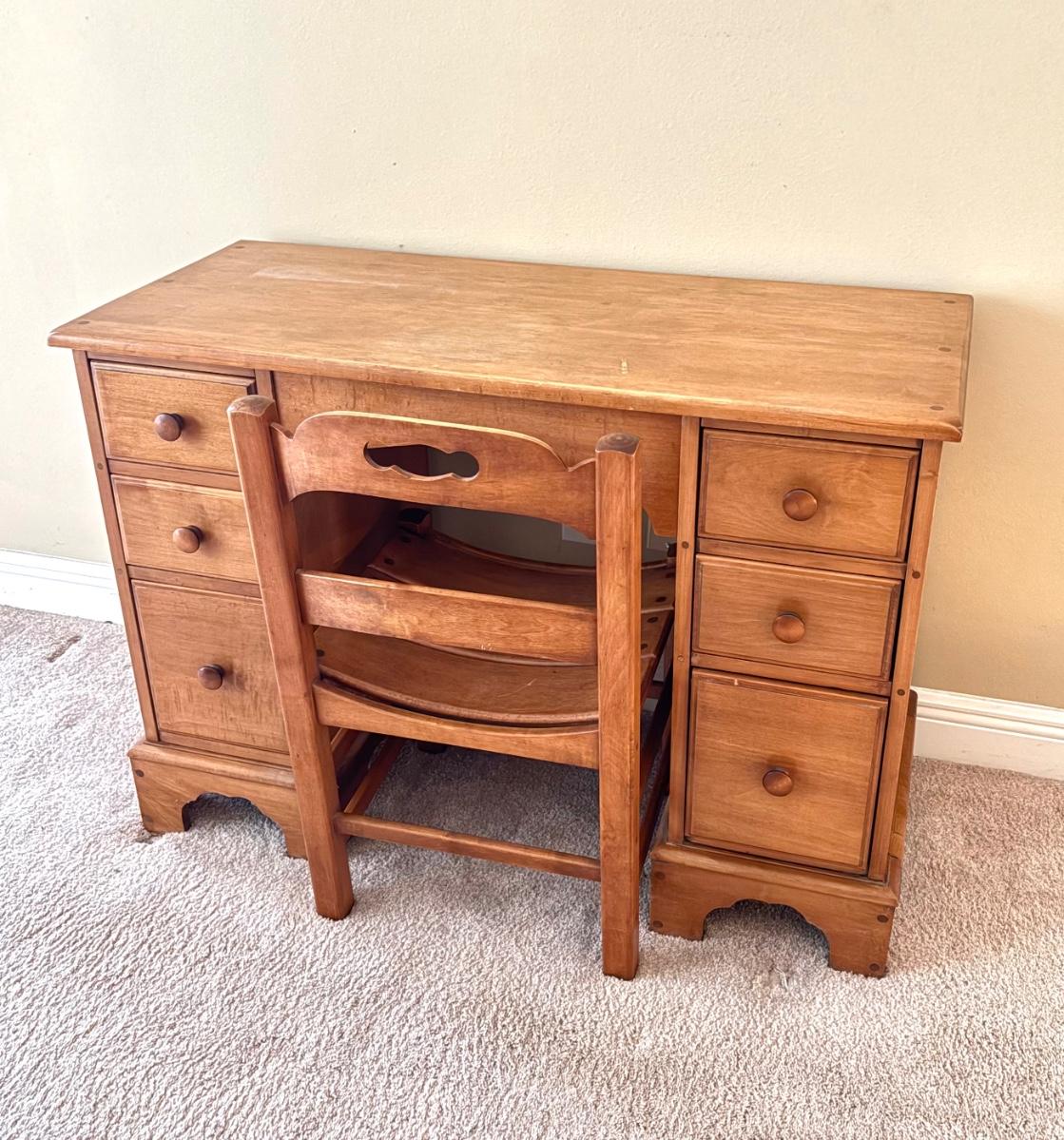 Desk is 30” tall x 41-3/4” wide x 18” deep. Chair is 29-1/2” tall to back of chair, 17-1/4 tall to seat. Seat is 16-3/4” wide x 15-1/4” deep.