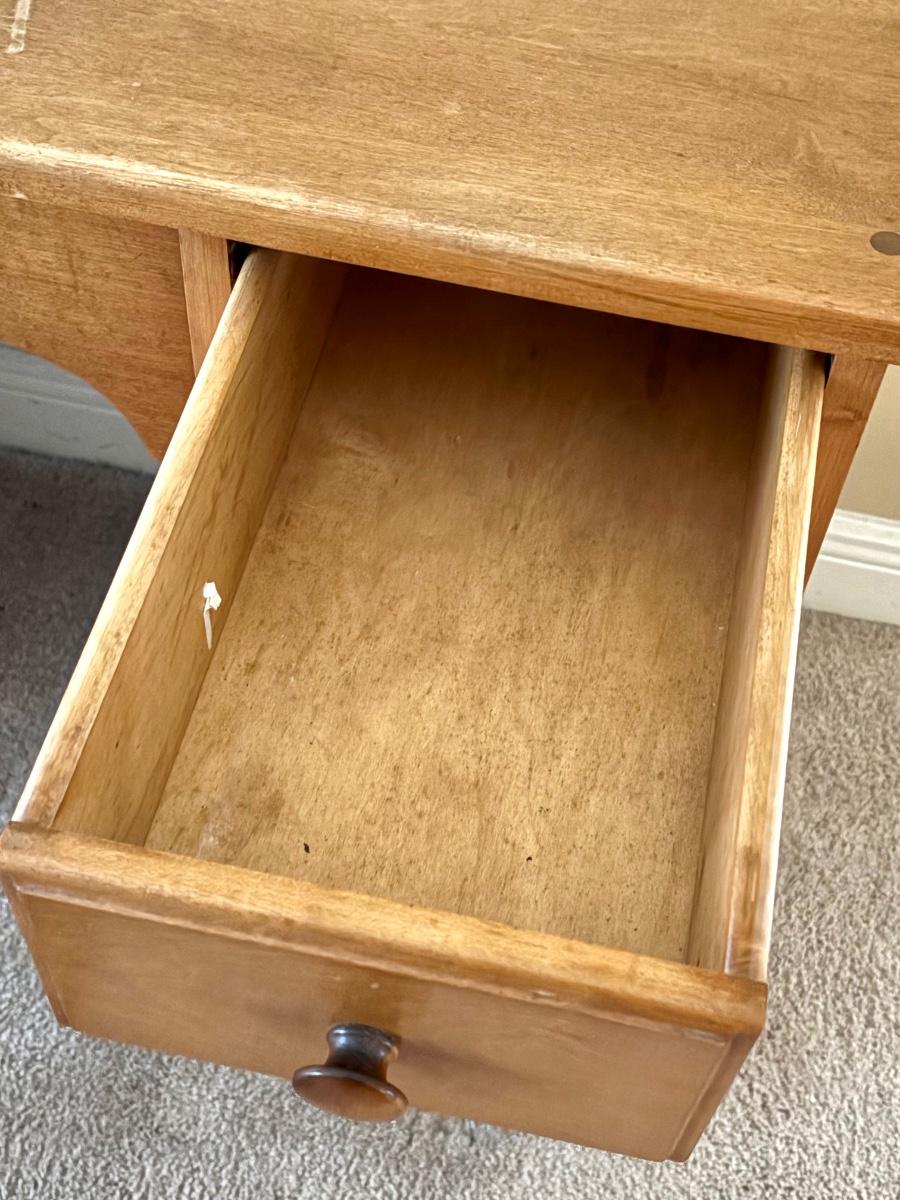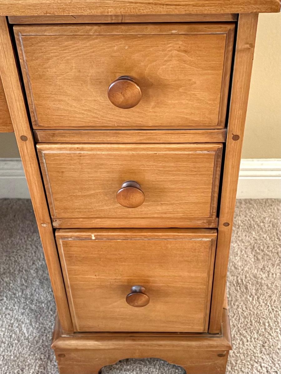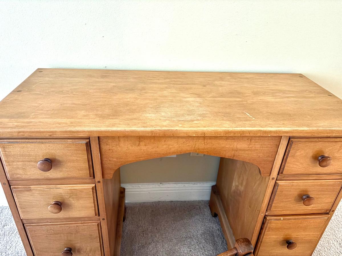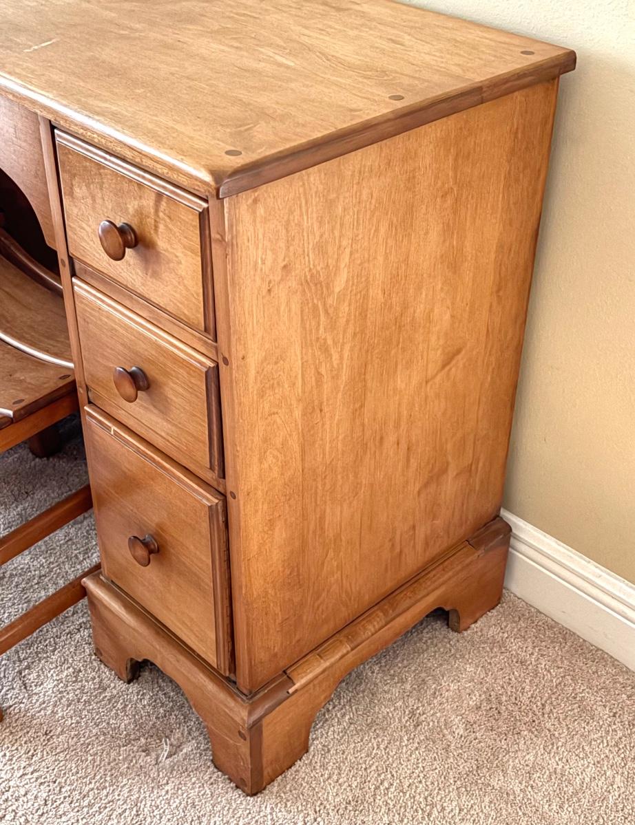 Desk is 30” tall x 41-3/4” wide x 18” deep. Chair is 29-1/2” tall to back of chair, 17-1/4 tall to seat. Seat is 16-3/4” wide x 15-1/4” deep.