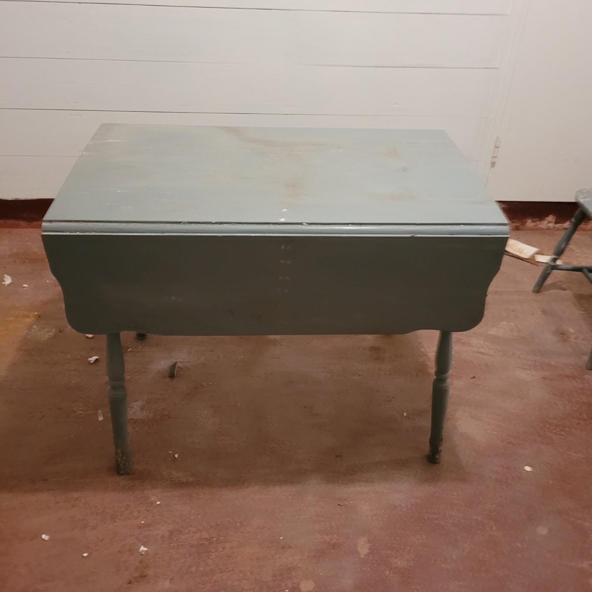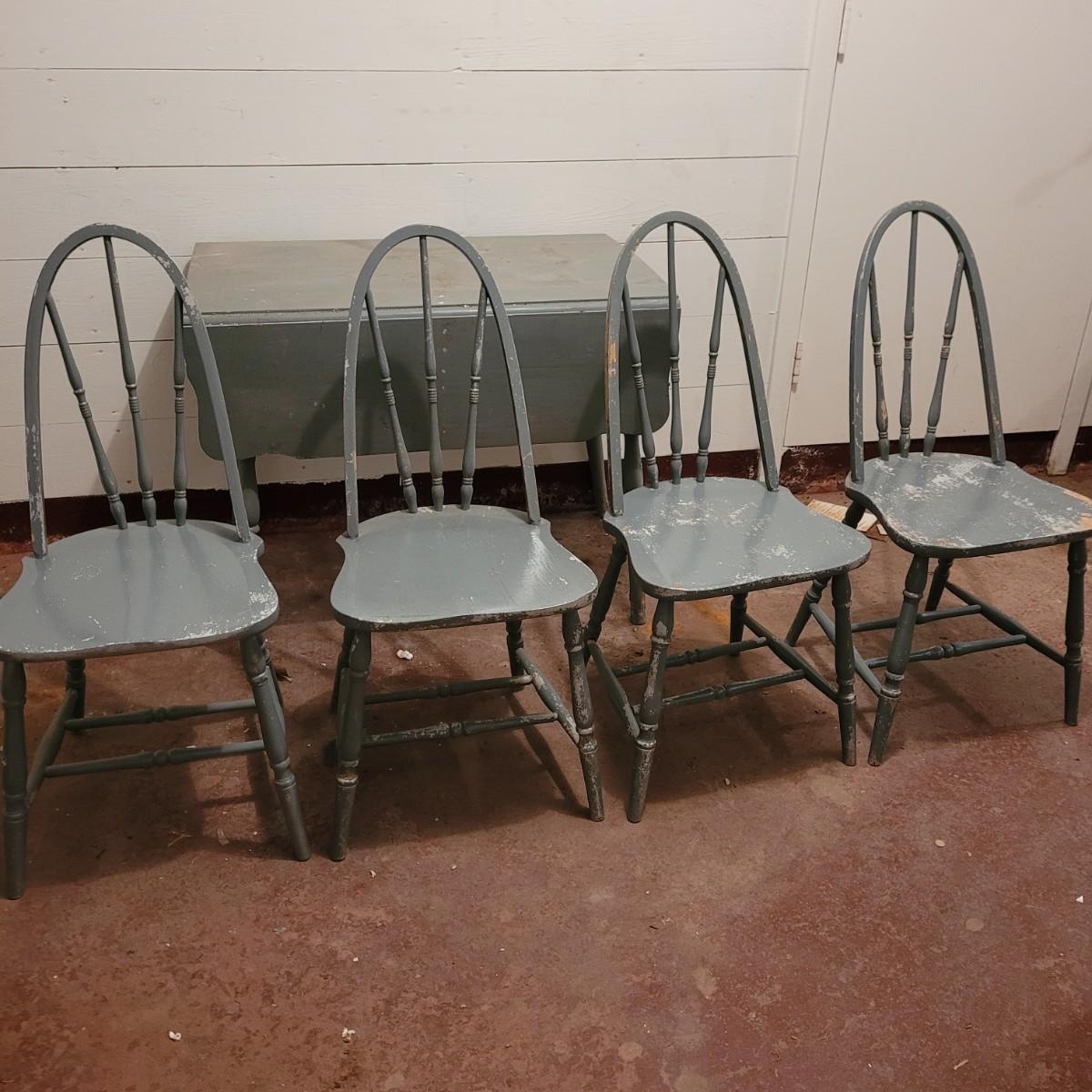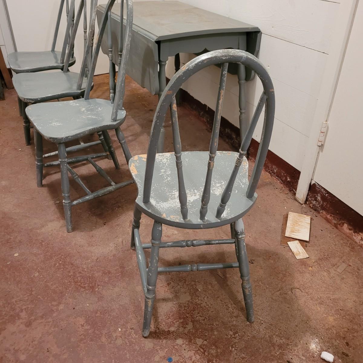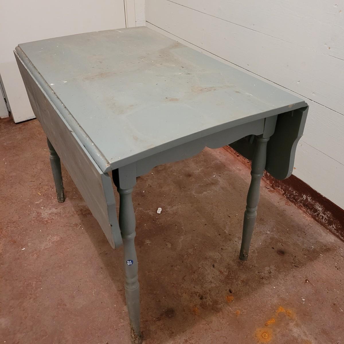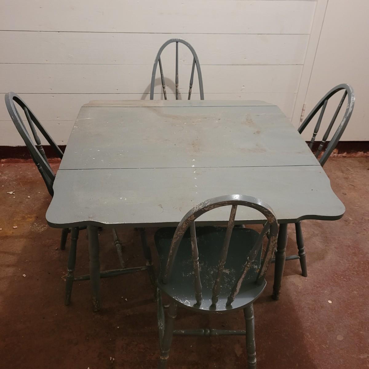 Blue grey painted drop leaf table with four chairs. Items in fair condition. Table legs wobbly, may be able to be more securely attached. Drop leaf mechanism does not support a fully straight open position, leaves hang down slightly. Two of four chairs have loose legs with detached connecting base pieces. Paint chipping throughout. Table fully extended measures approximately 42.5"L x36"W x29.5"H. Folded length 23"L. Chairs measure approximately 16.5"L x16"W x36.5"H. Seat height 17.5"H. Local pick up only.