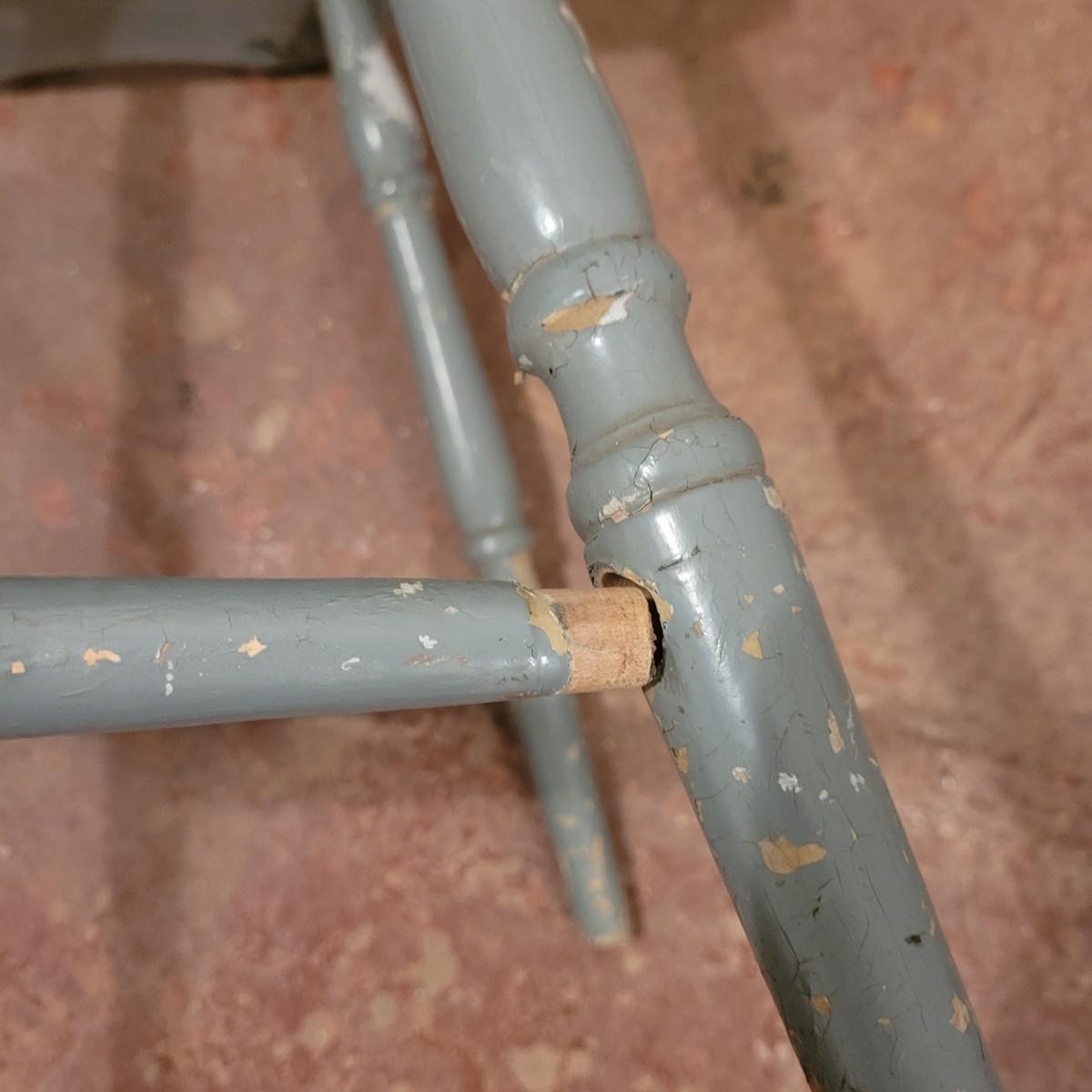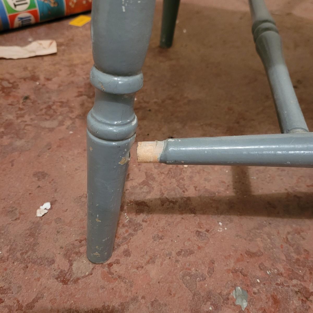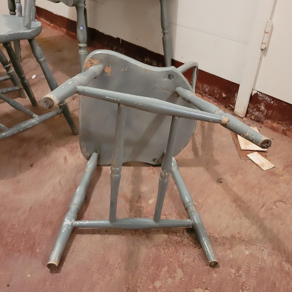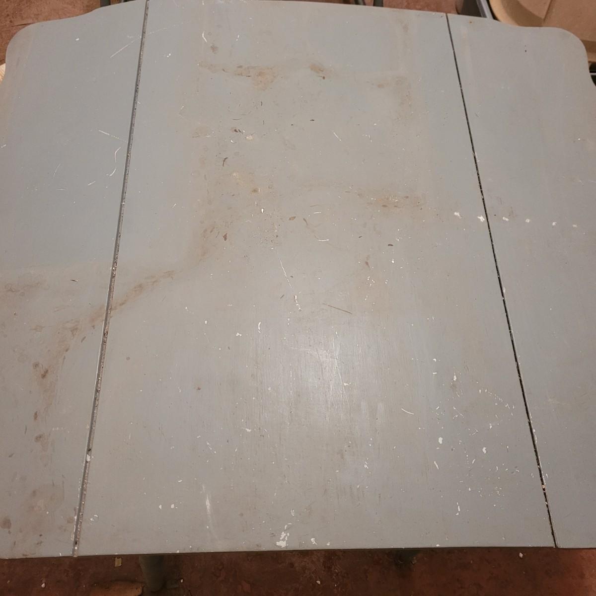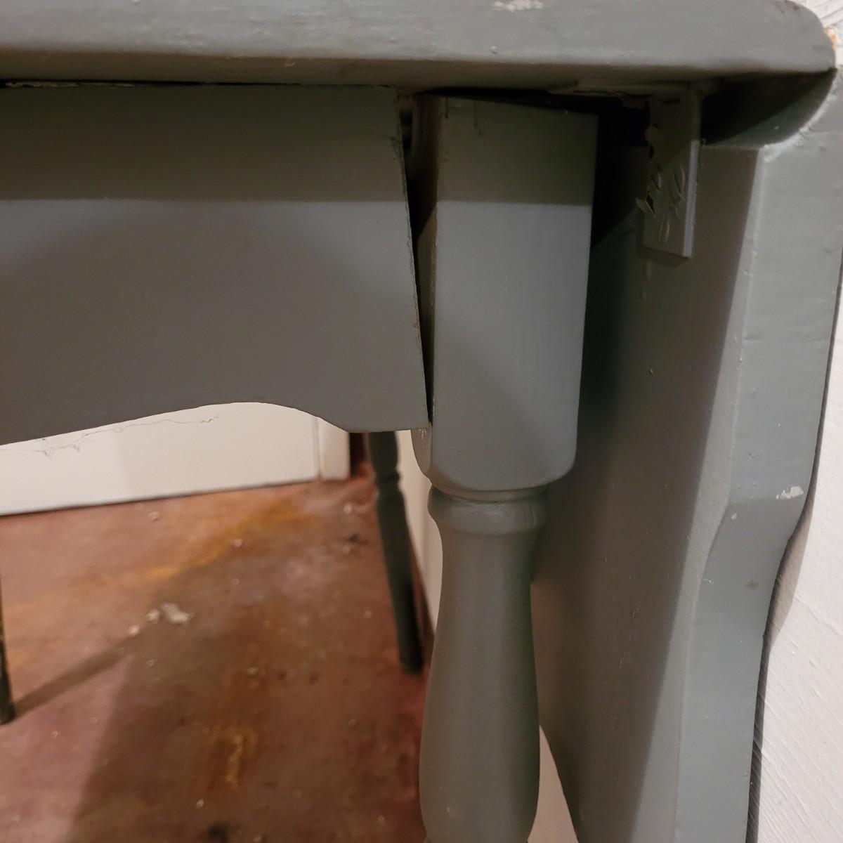 Blue grey painted drop leaf table with four chairs. Items in fair condition. Table legs wobbly, may be able to be more securely attached. Drop leaf mechanism does not support a fully straight open position, leaves hang down slightly. Two of four chairs have loose legs with detached connecting base pieces. Paint chipping throughout. Table fully extended measures approximately 42.5"L x36"W x29.5"H. Folded length 23"L. Chairs measure approximately 16.5"L x16"W x36.5"H. Seat height 17.5"H. Local pick up only.