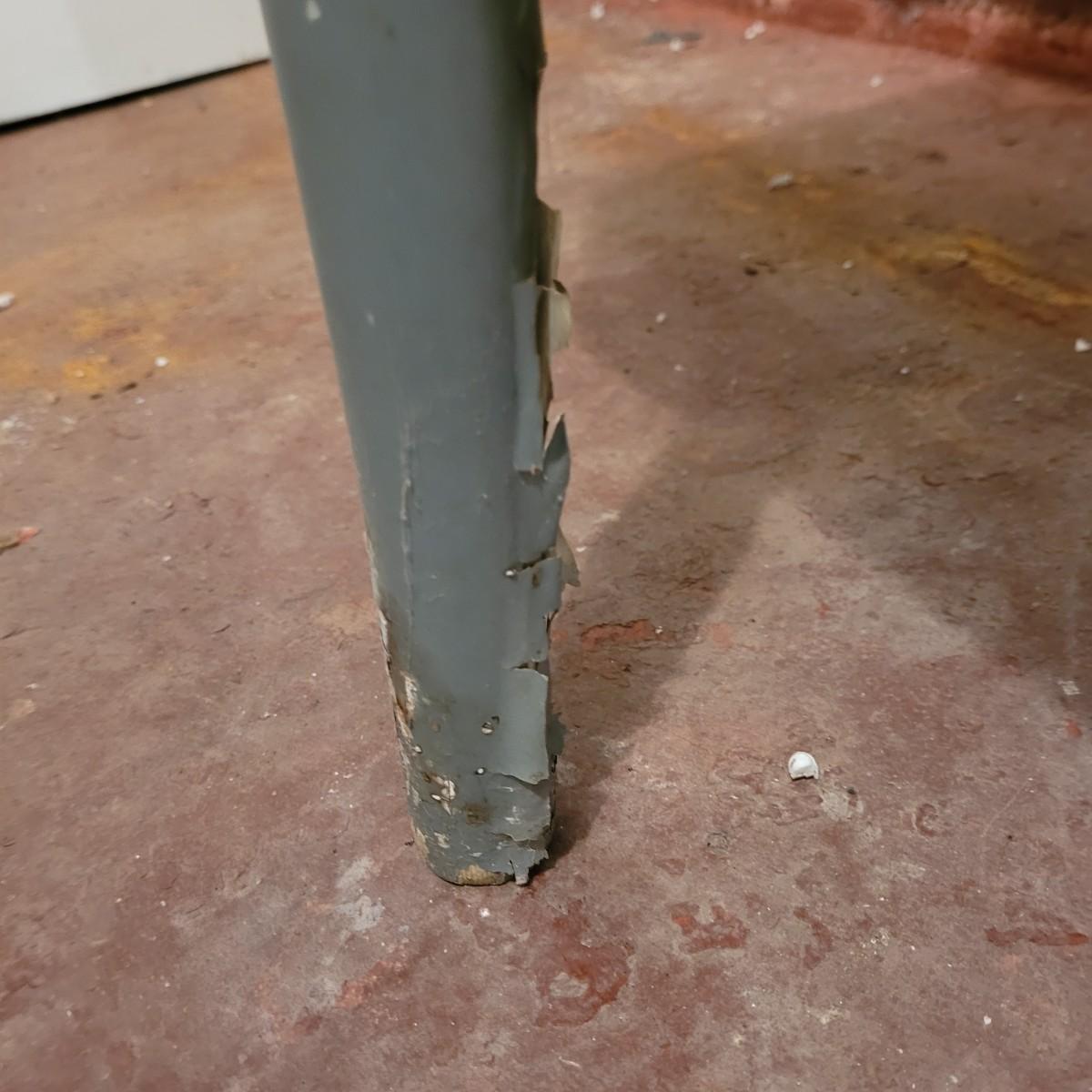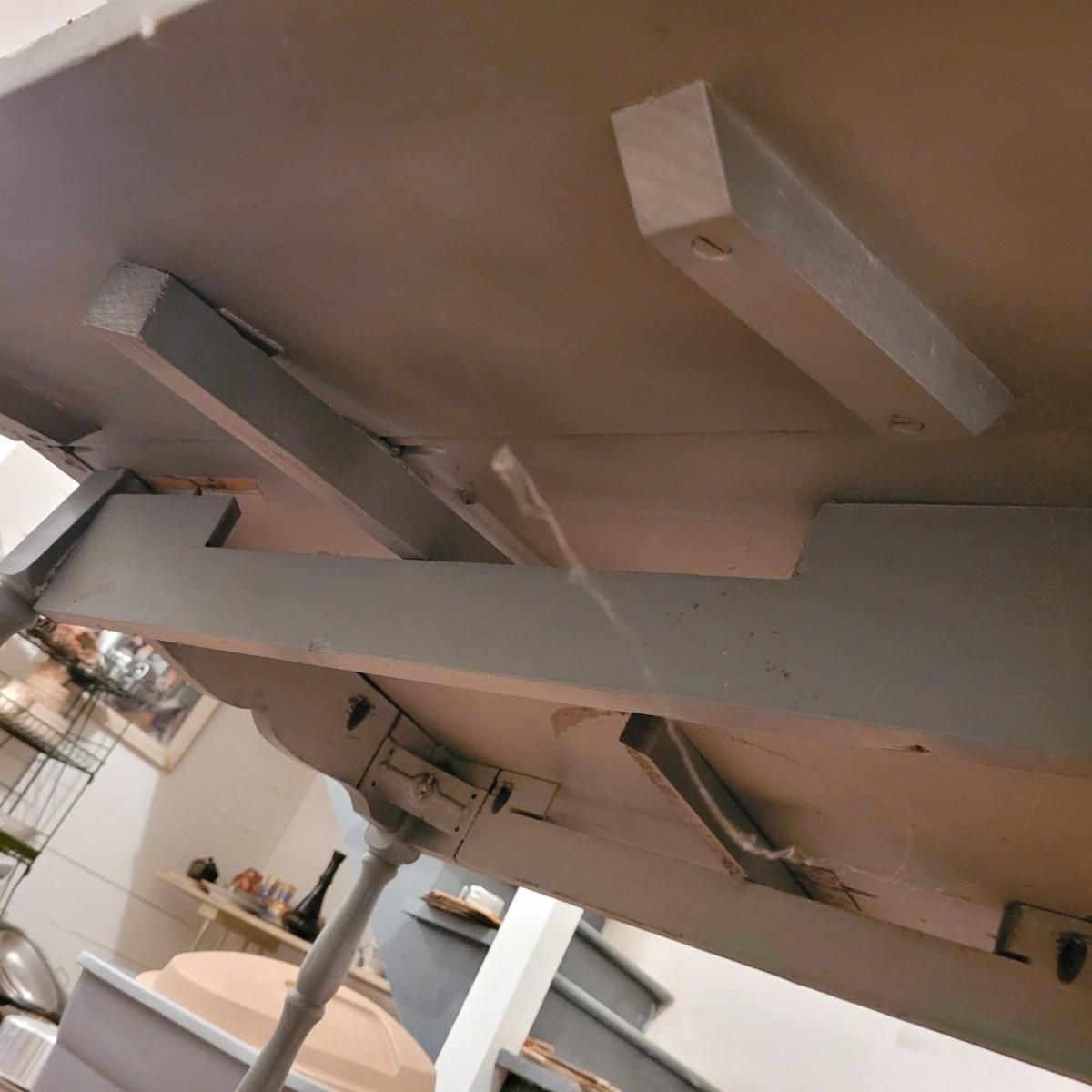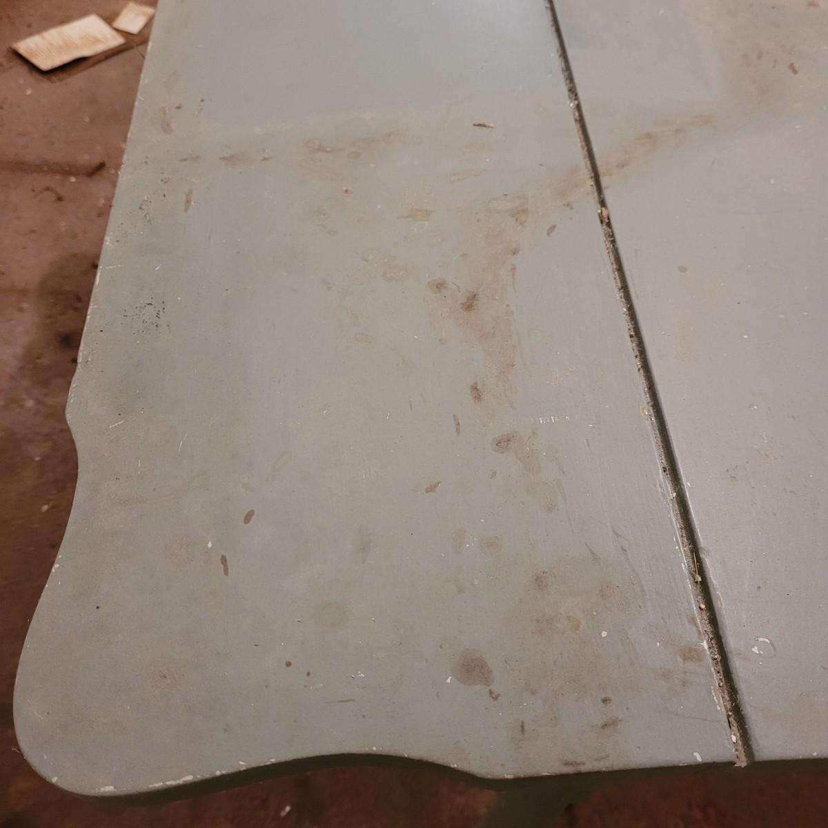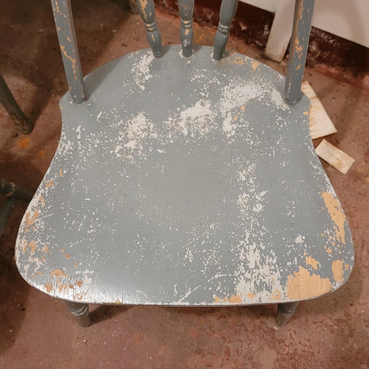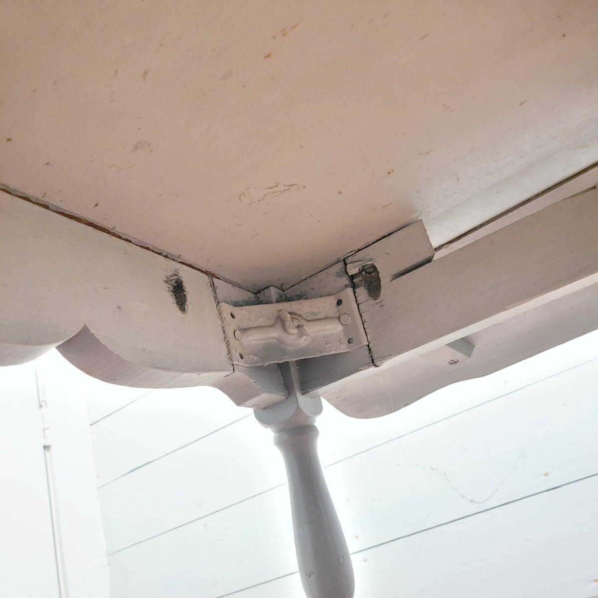 Blue grey painted drop leaf table with four chairs. Items in fair condition. Table legs wobbly, may be able to be more securely attached. Drop leaf mechanism does not support a fully straight open position, leaves hang down slightly. Two of four chairs have loose legs with detached connecting base pieces. Paint chipping throughout. Table fully extended measures approximately 42.5"L x36"W x29.5"H. Folded length 23"L. Chairs measure approximately 16.5"L x16"W x36.5"H. Seat height 17.5"H. Local pick up only.
