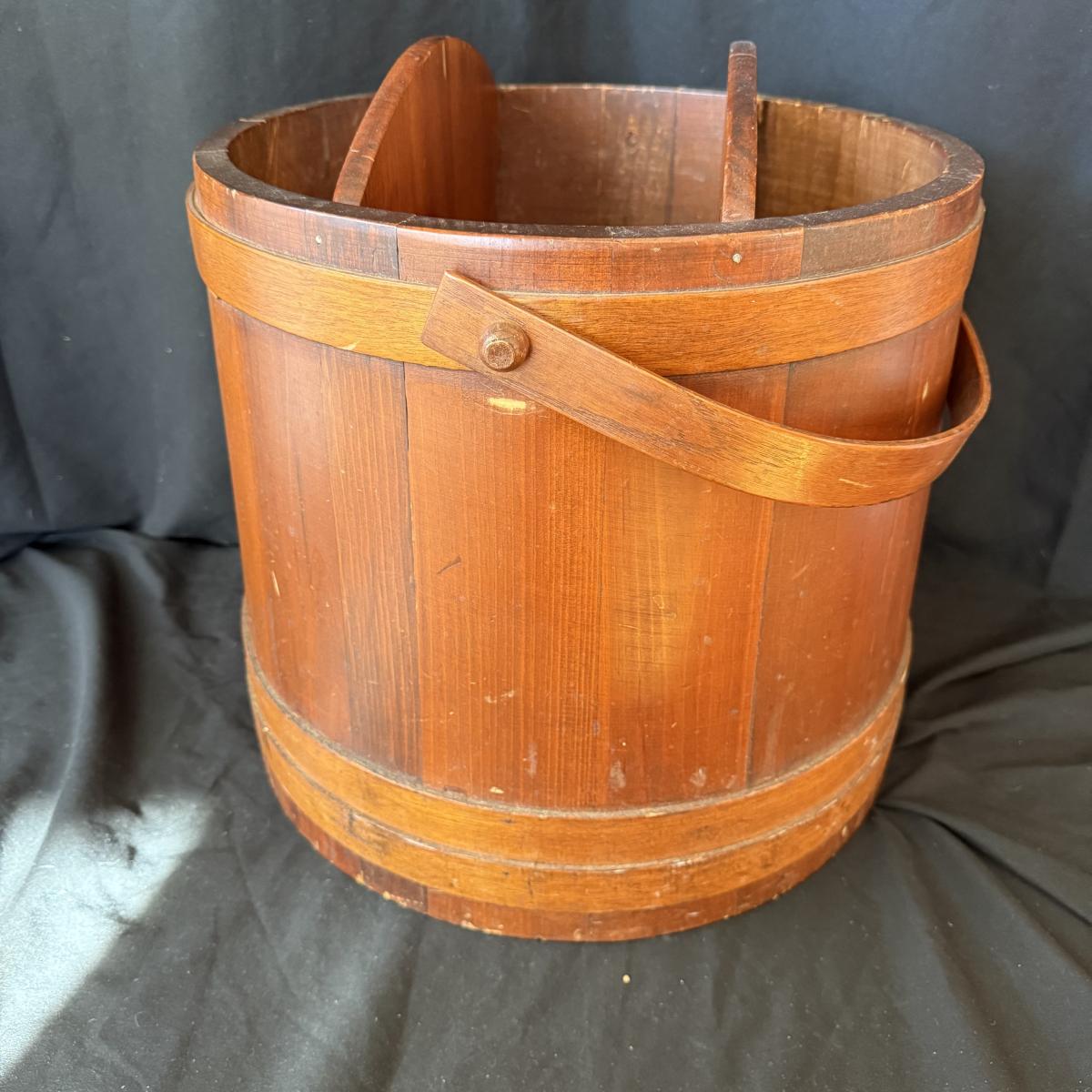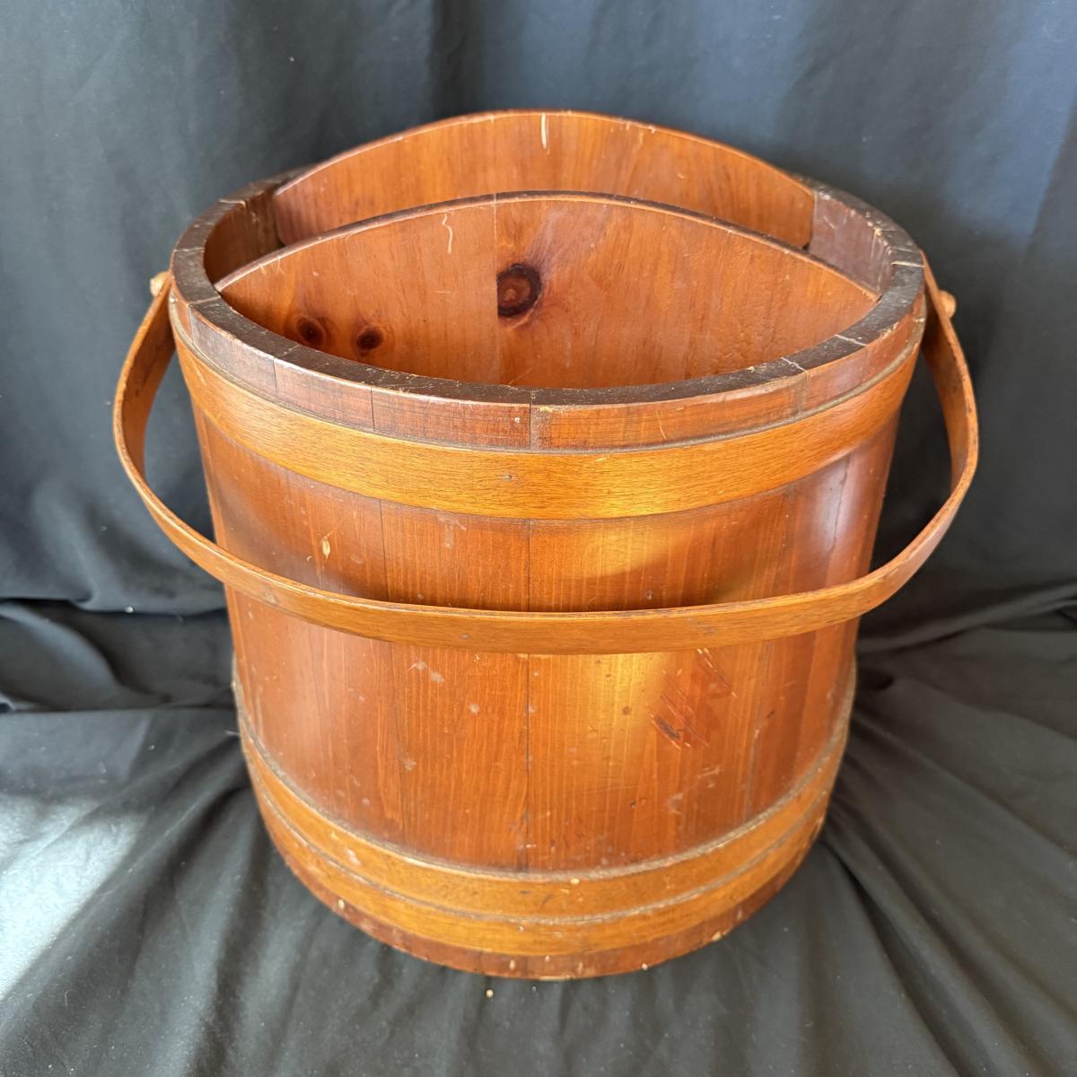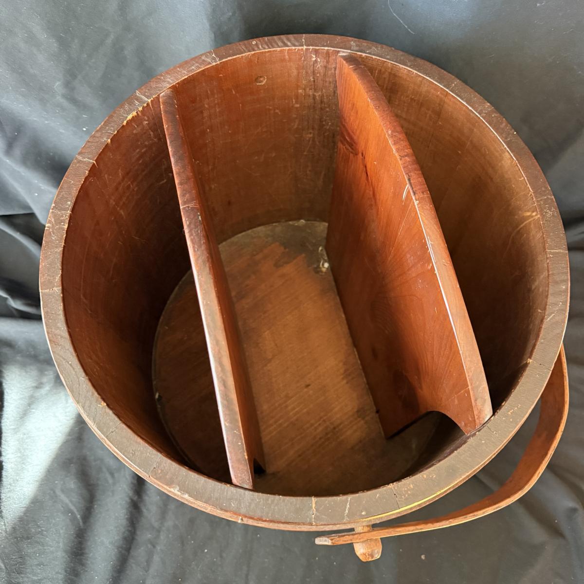 This lot contains a vintage wooden firkin with dividers. It has handles and three sections. This piece measures 14.5”D x 13.5”H. There’s a normal amount of wear to this item. Shipping available.
