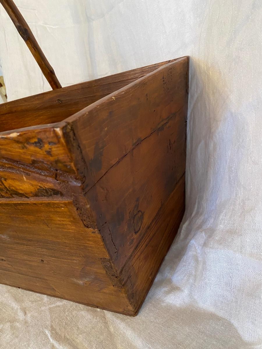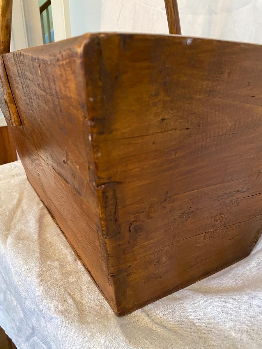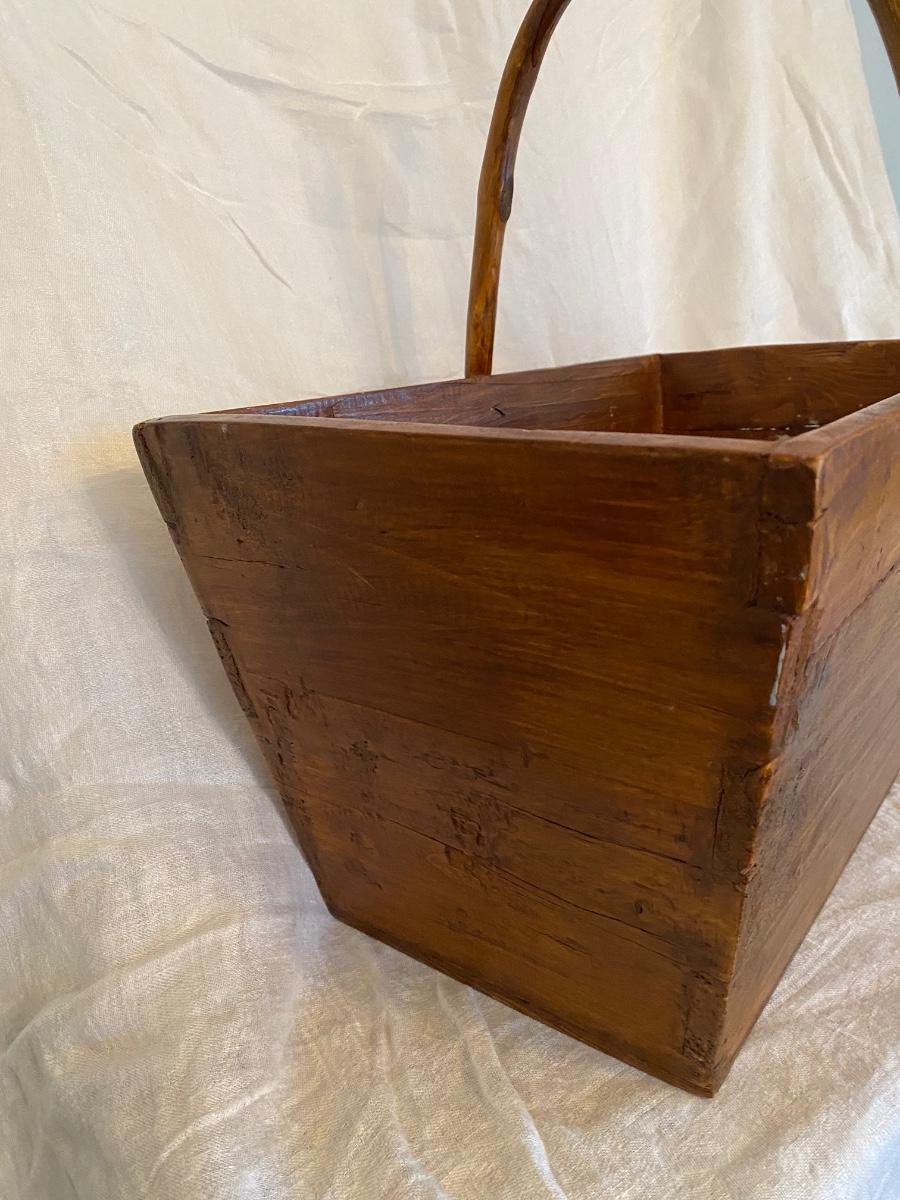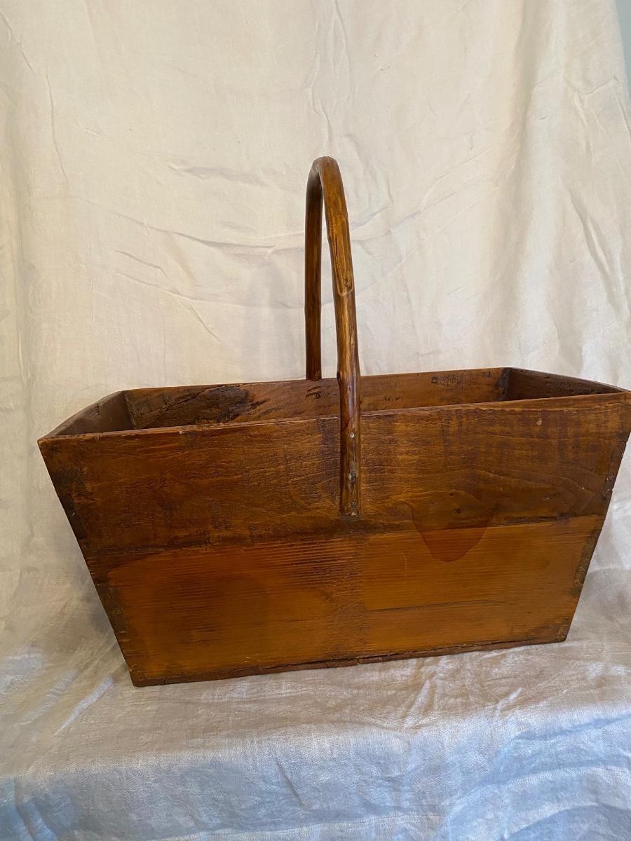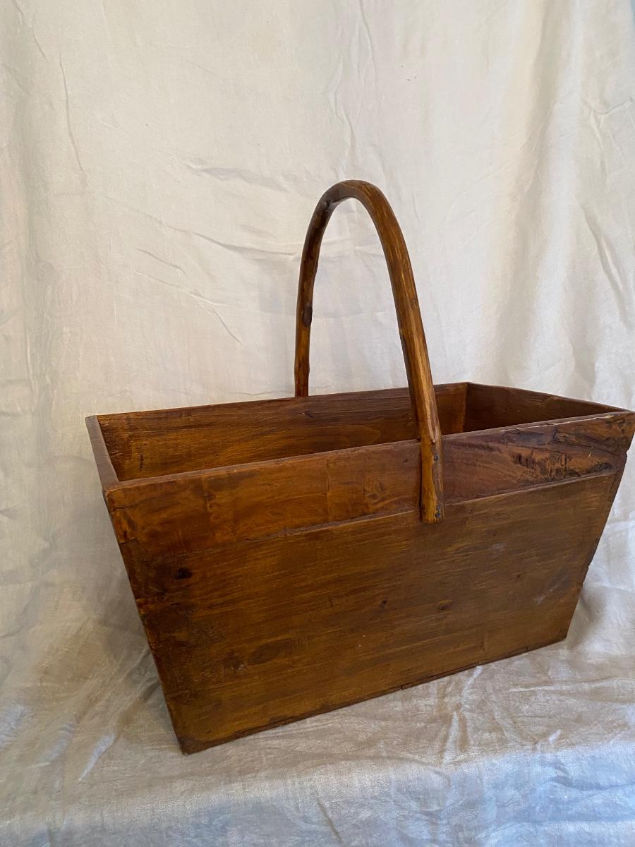 Vintage wooden flower/fruit trug harvest basket, rustic farmhouse, bent wood handle. very good condition, heavy and solid The curved handle is very secure,There is a very fine and not very deep split through the base as shown, with the basket's charm coming through its age and usage related wear. App 20Wx10Hx11.5 with 10" handle.