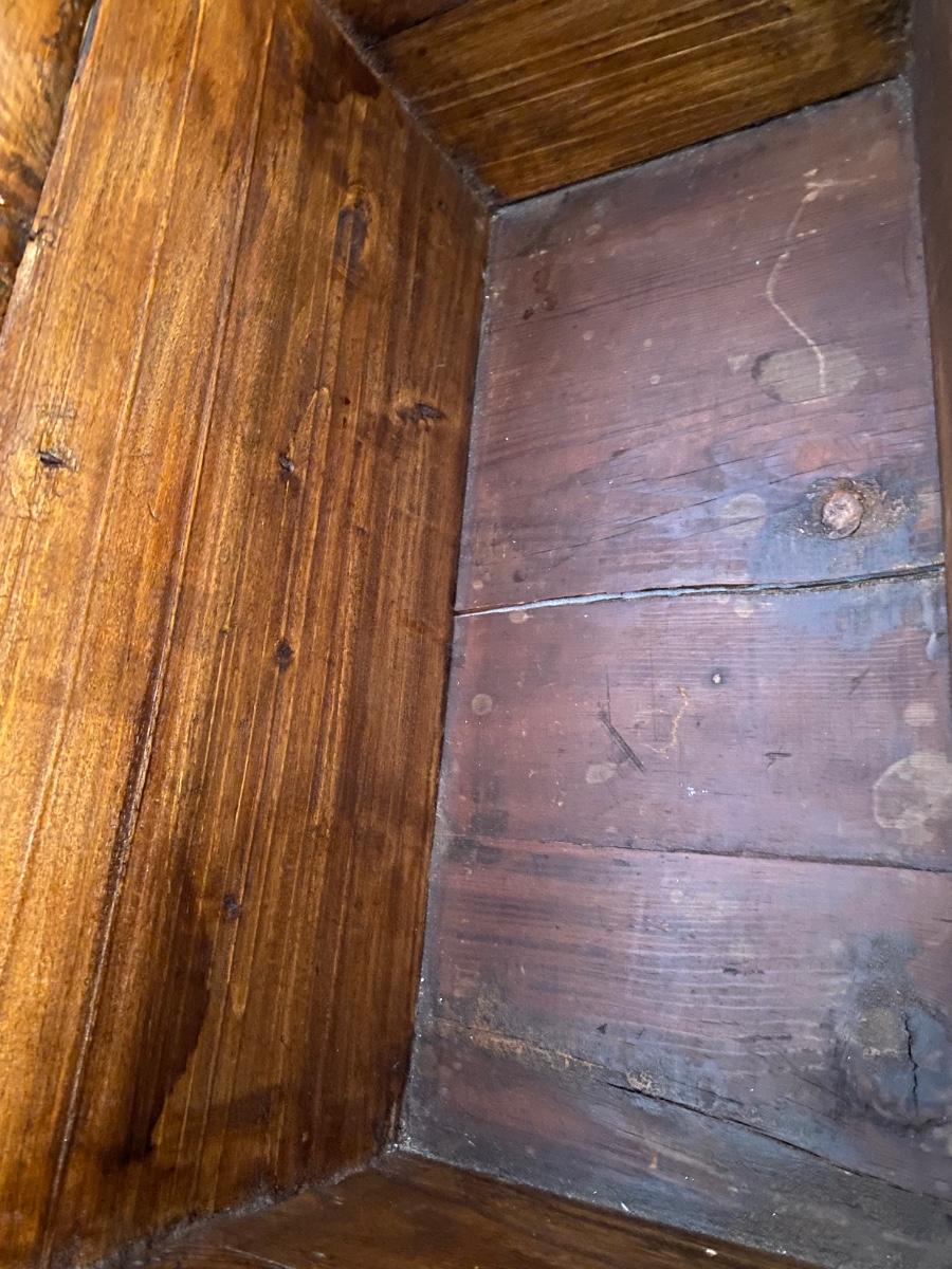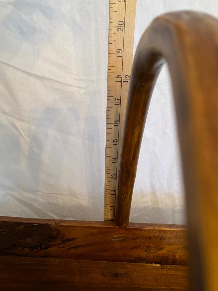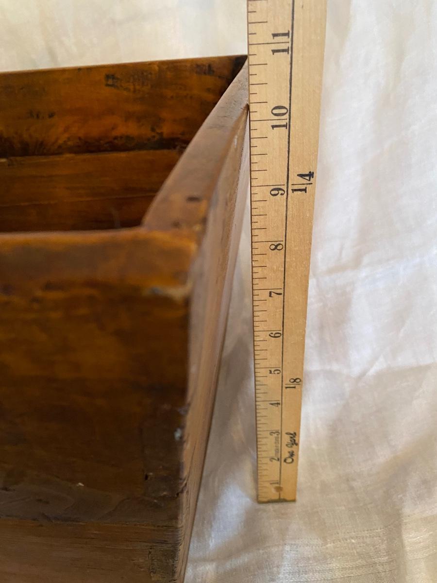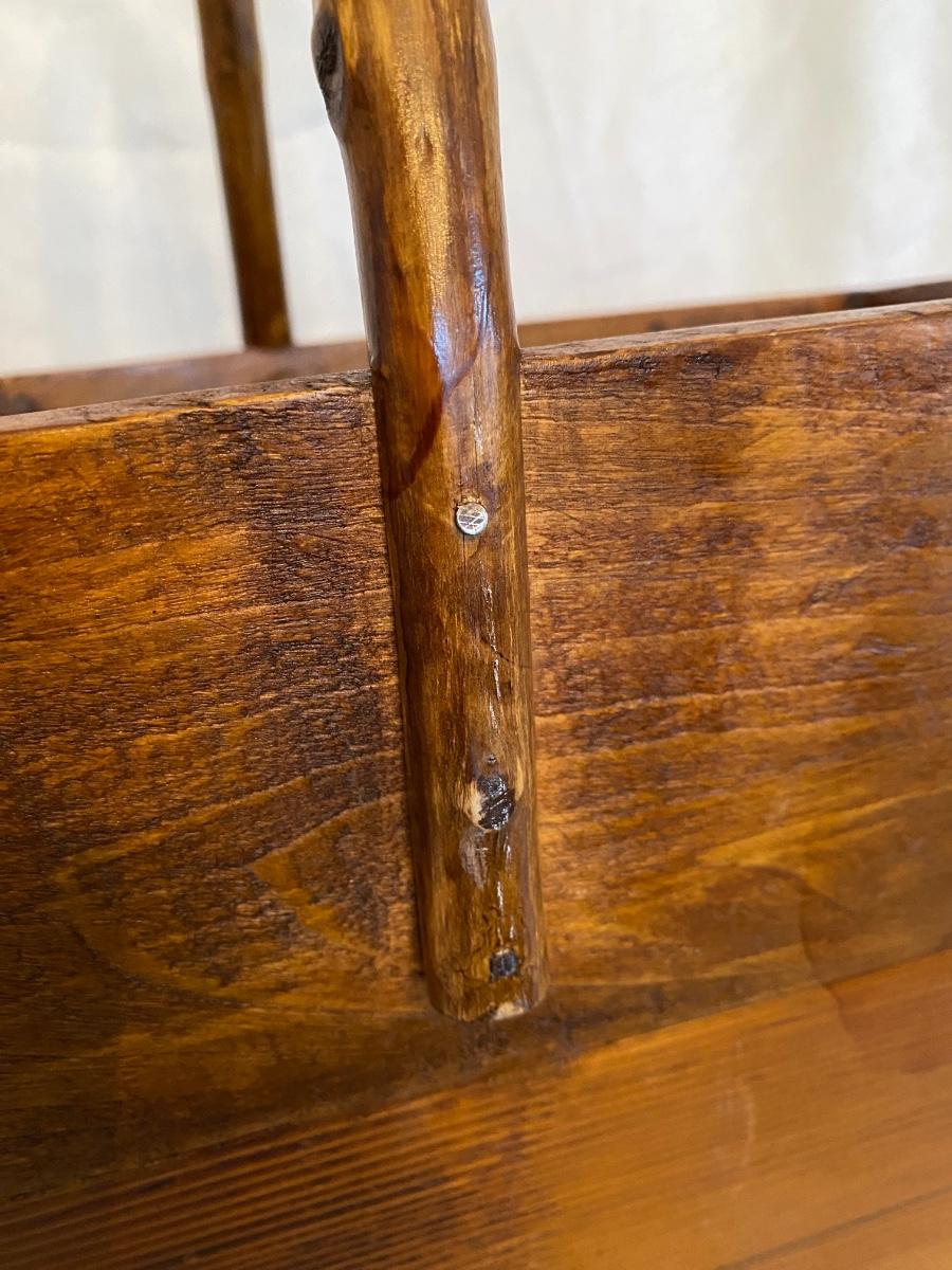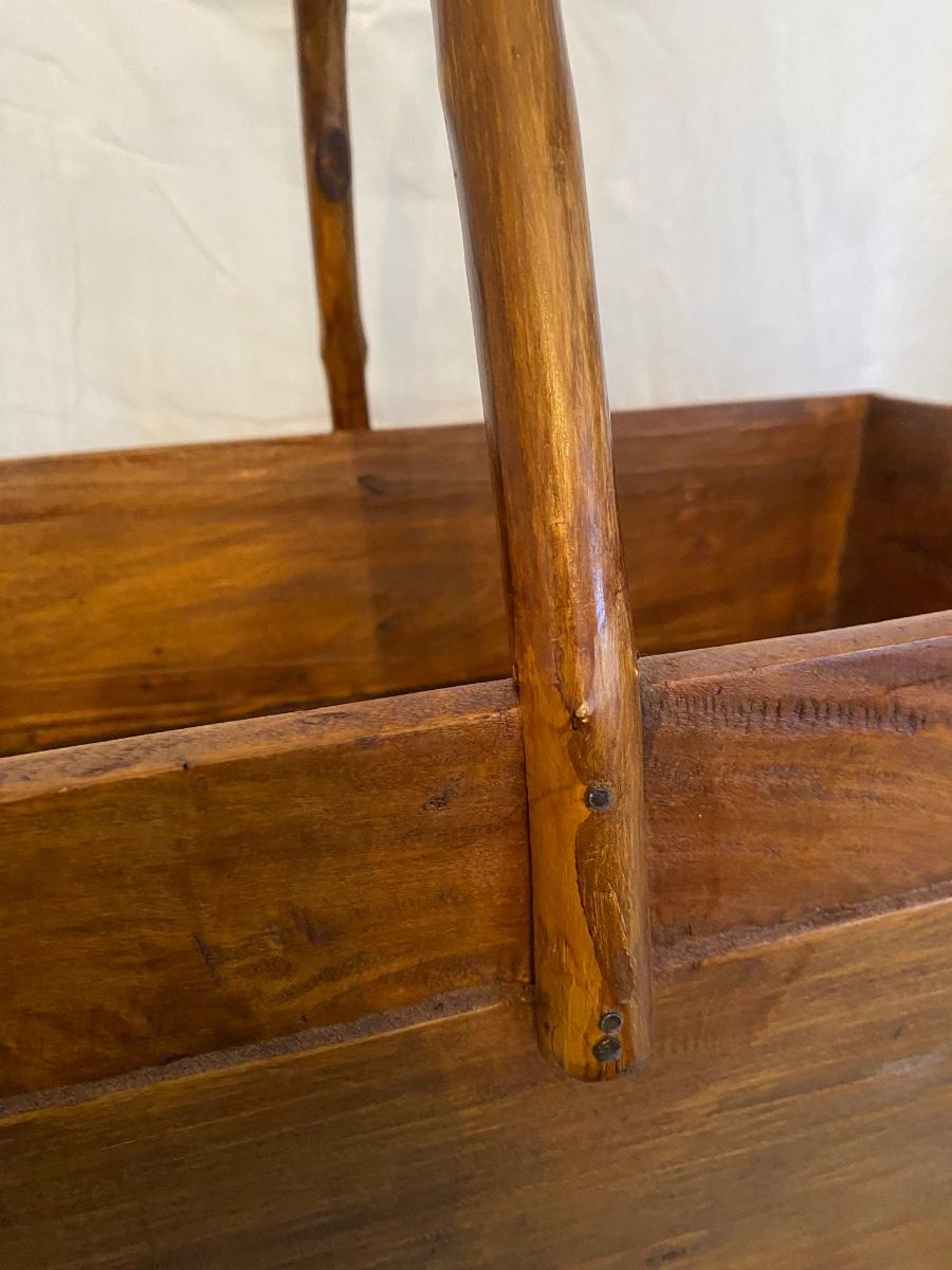 Vintage wooden flower/fruit trug harvest basket, rustic farmhouse, bent wood handle. very good condition, heavy and solid The curved handle is very secure,There is a very fine and not very deep split through the base as shown, with the basket's charm coming through its age and usage related wear. App 20Wx10Hx11.5 with 10" handle.