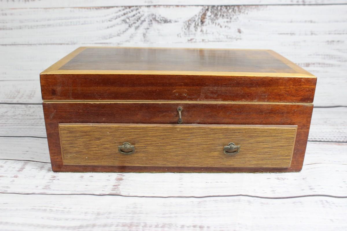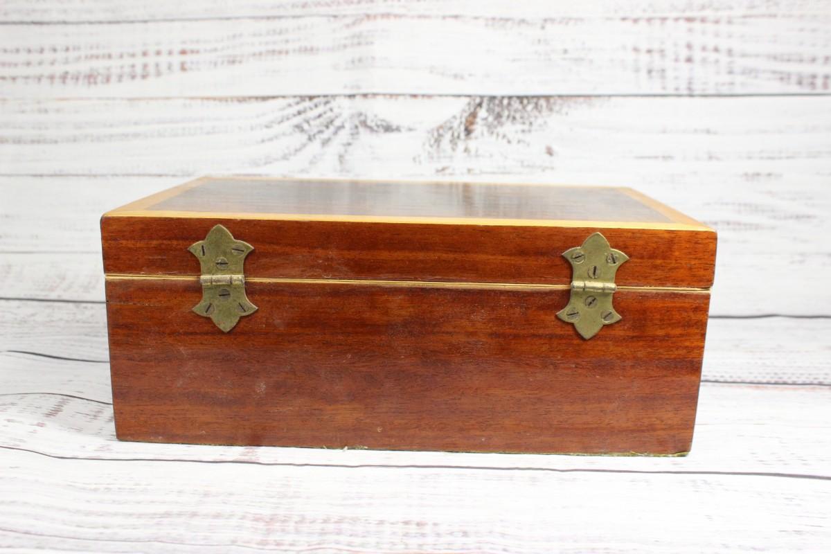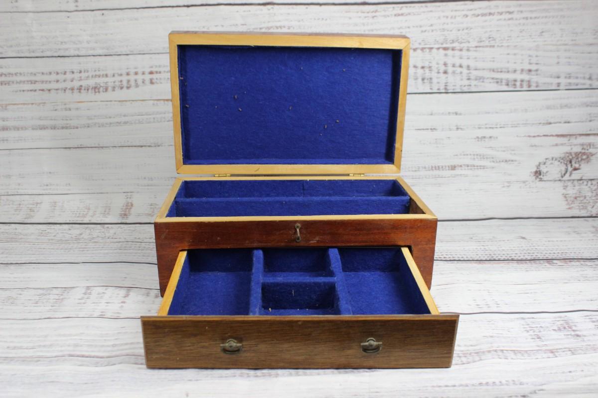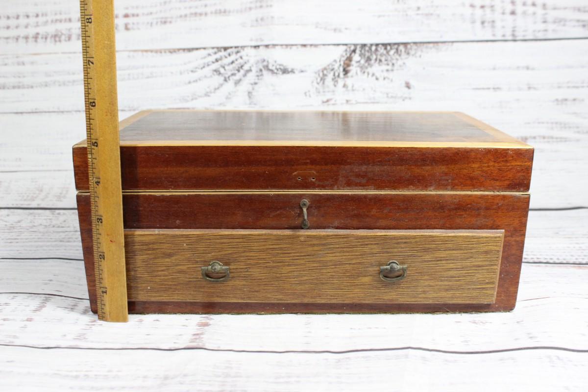 Vintage wooden jewelry box, has no significant damage or scratches. The hinge latch is broken off, but is in the box.
