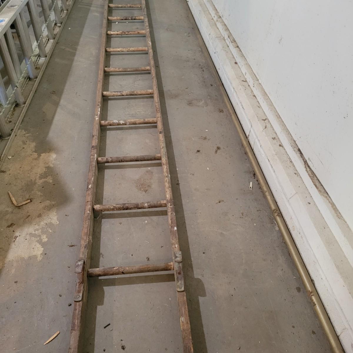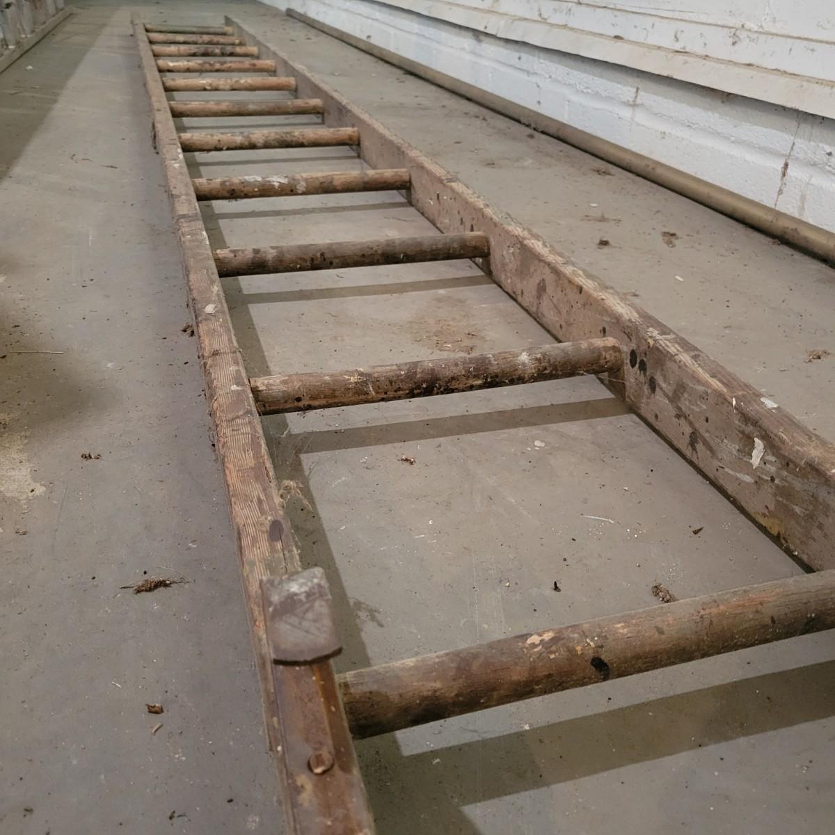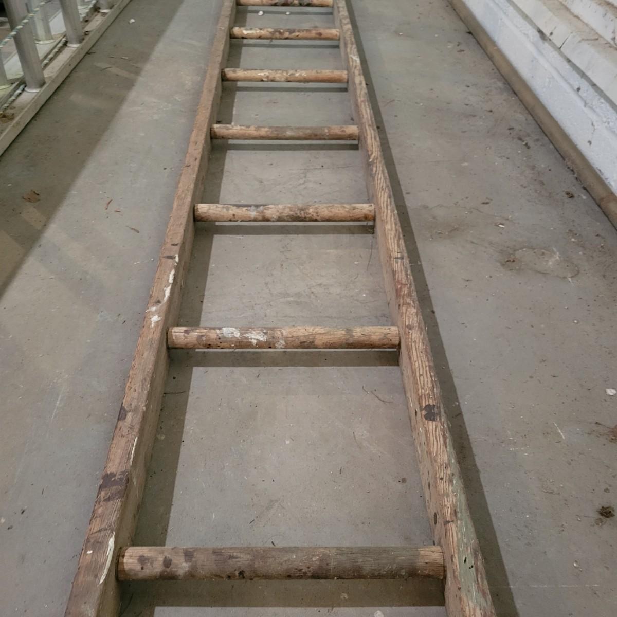 A vintage wooden ladder in good condition with no rot, but does have some paint stains. Ladder has hooks on its end to hold items while working. Measures approximately 143" x 14" x 2.5". This is an older ladder and likely does not meet current OSHA standards. Local pickup only