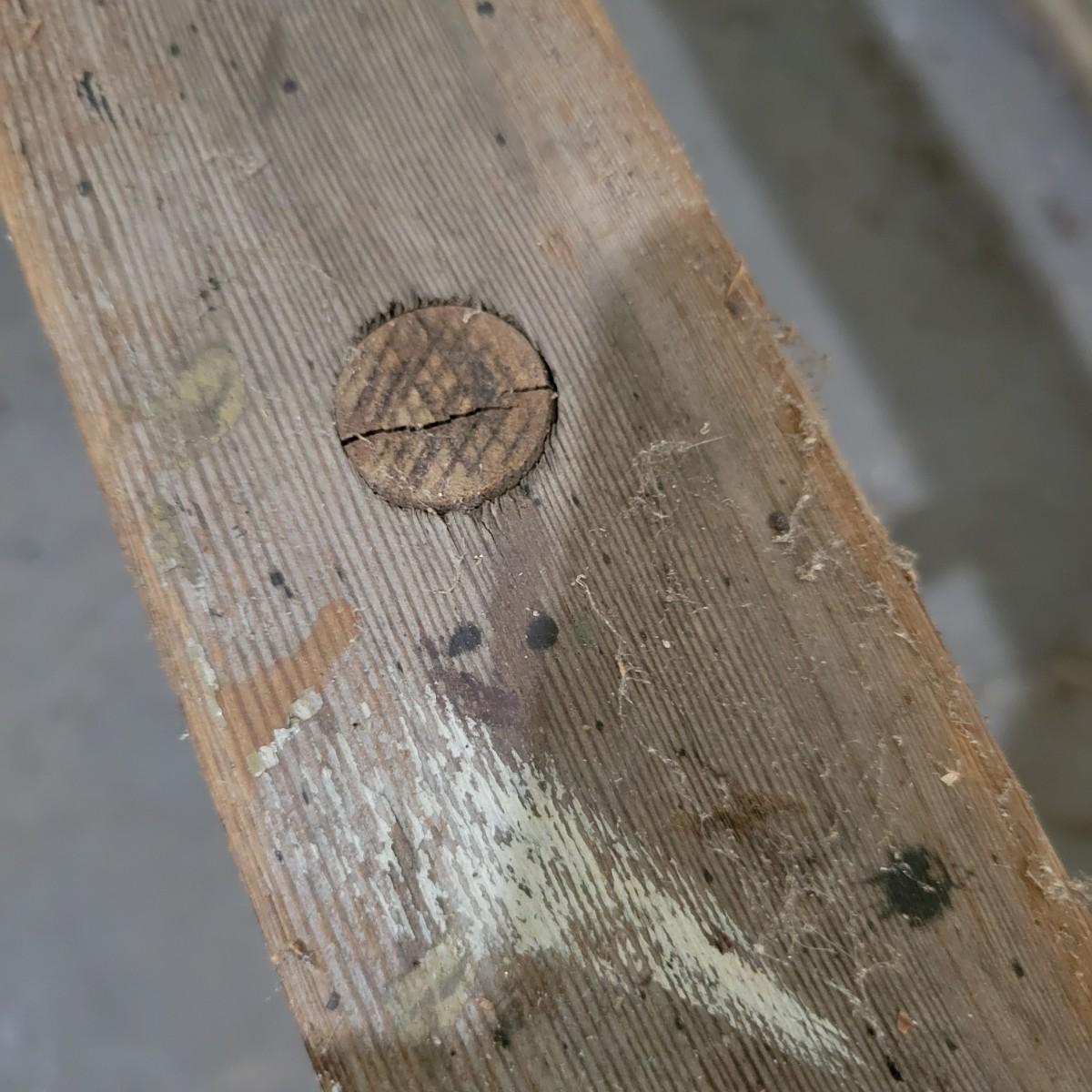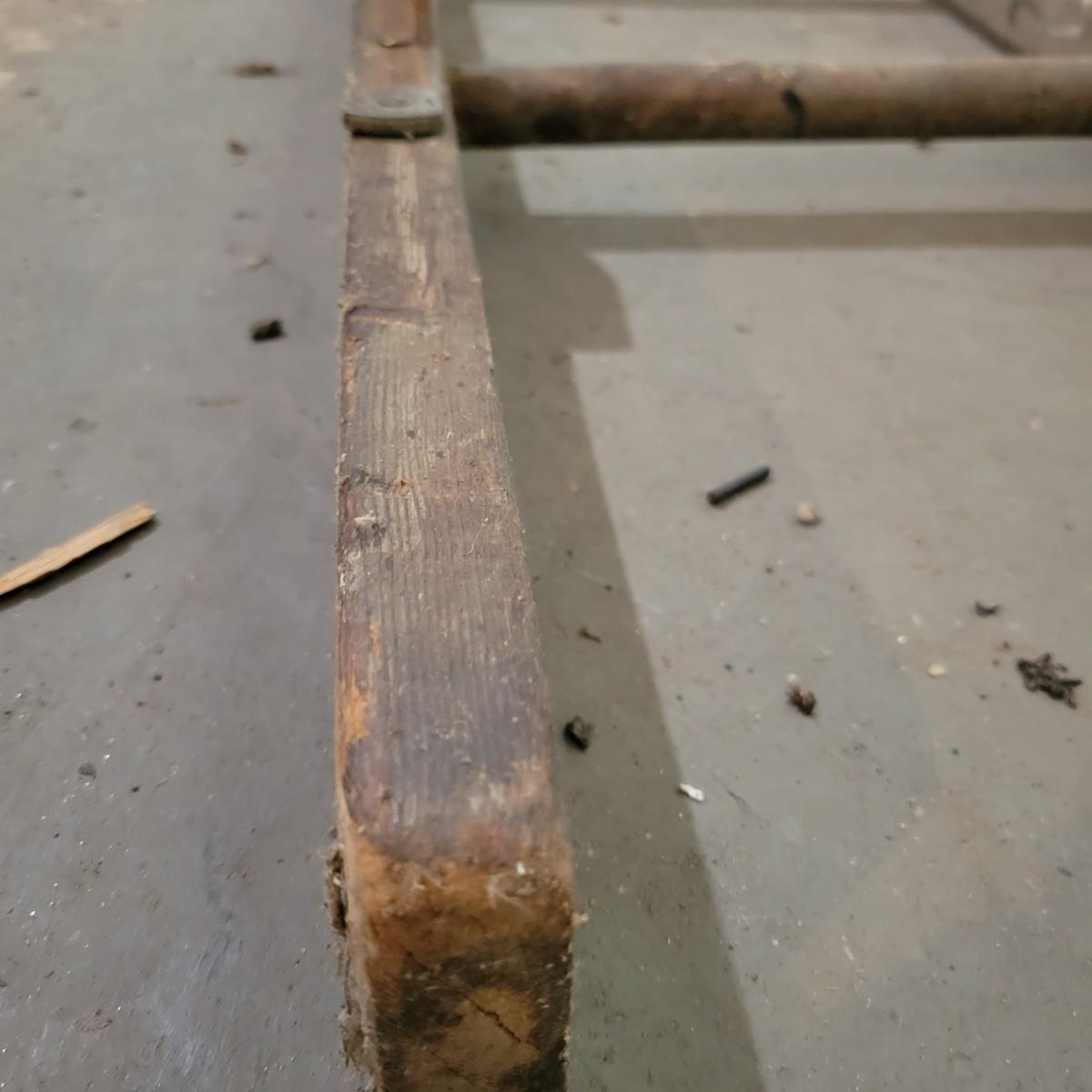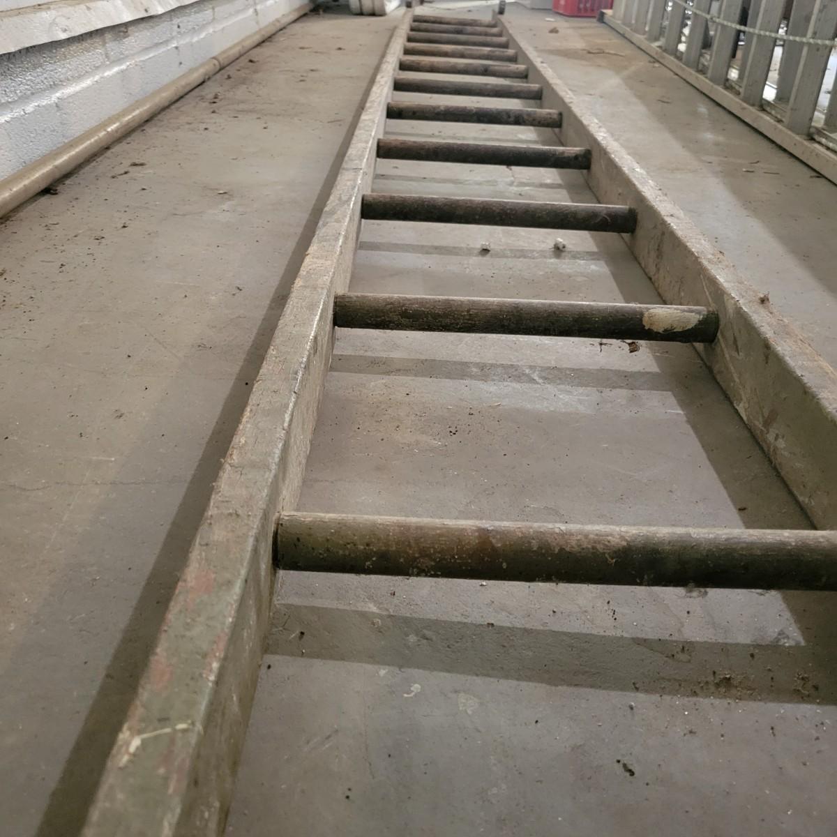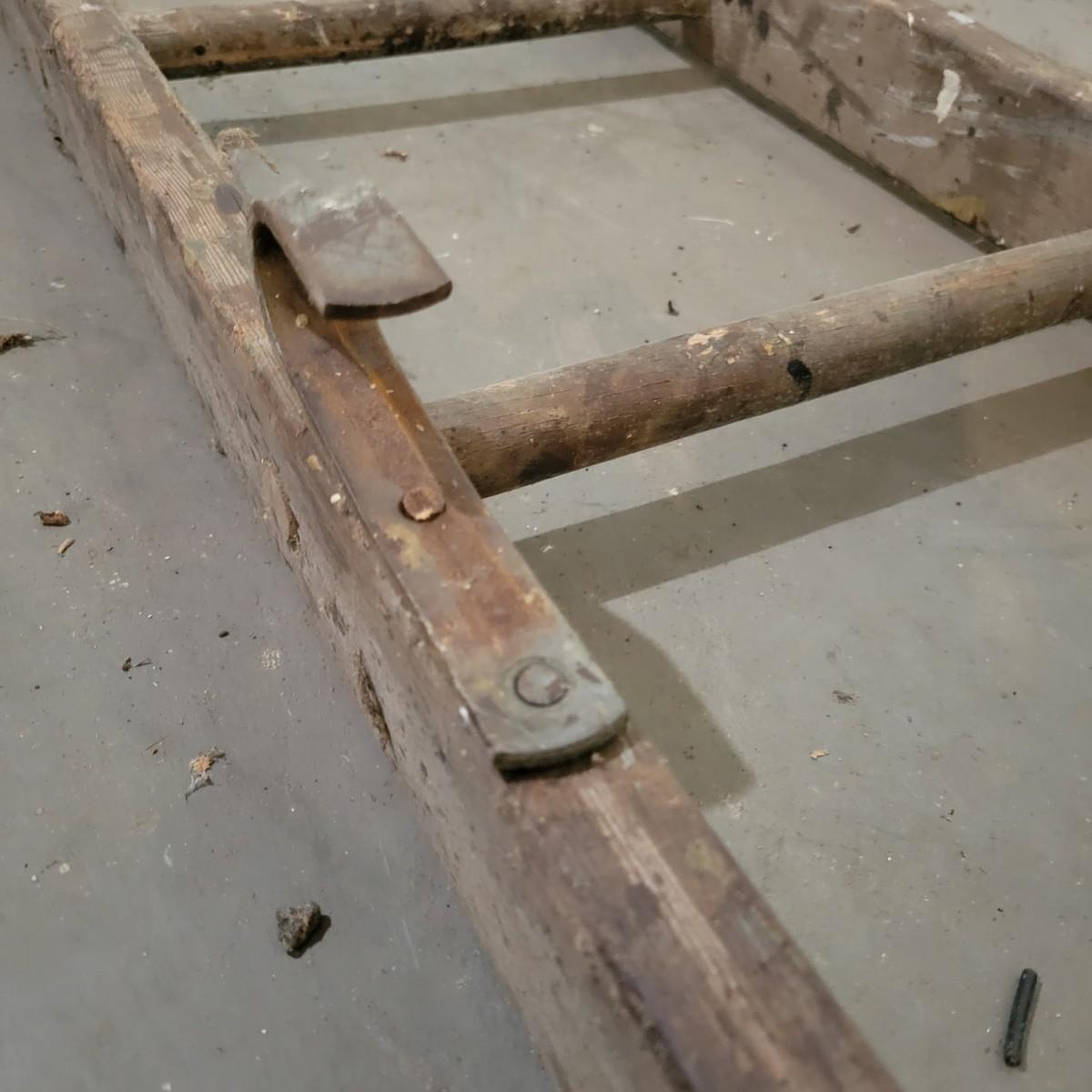 A vintage wooden ladder in good condition with no rot, but does have some paint stains. Ladder has hooks on its end to hold items while working. Measures approximately 143" x 14" x 2.5". This is an older ladder and likely does not meet current OSHA standards. Local pickup only