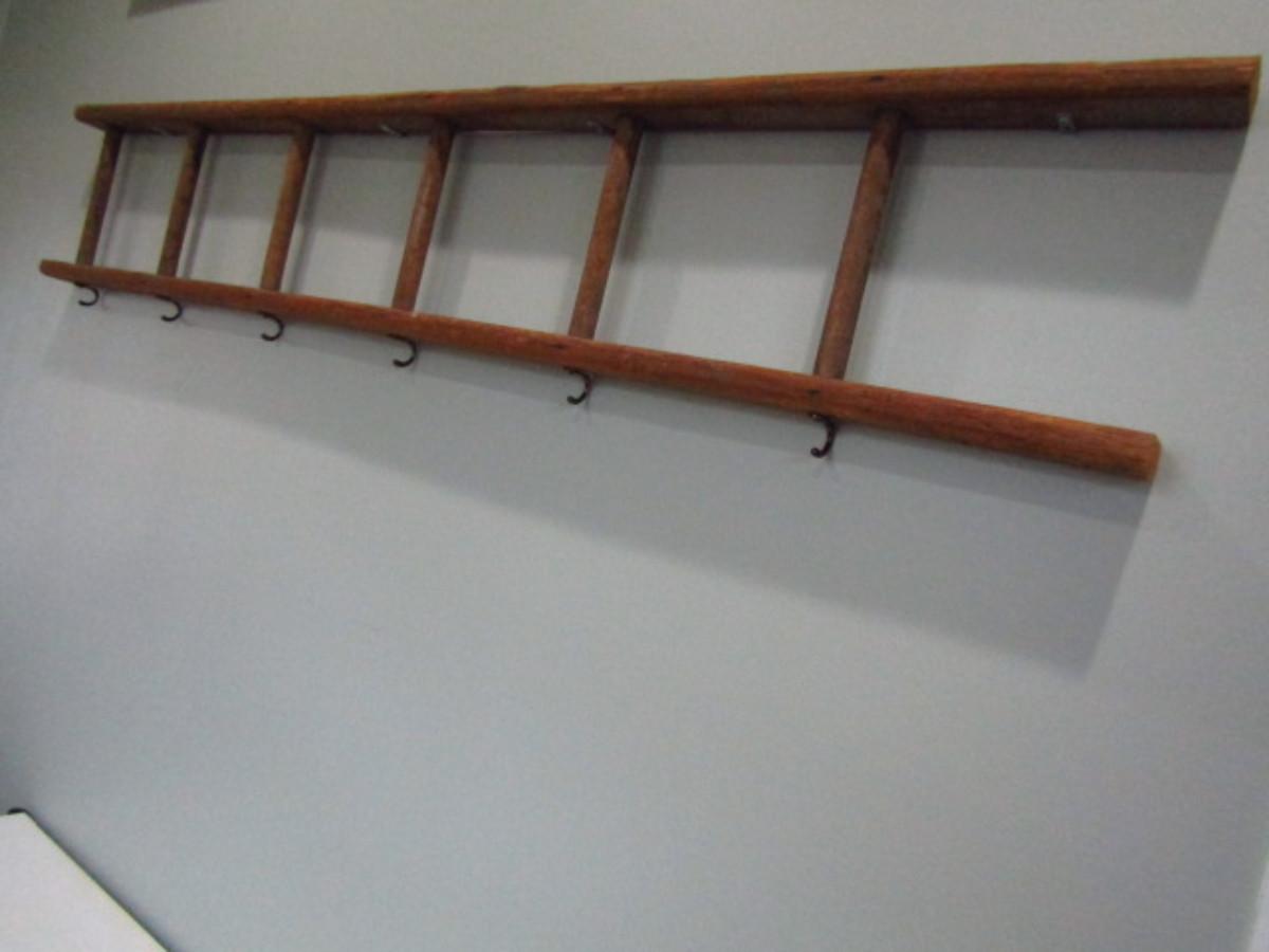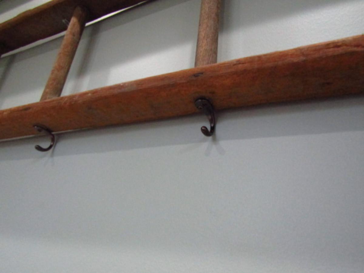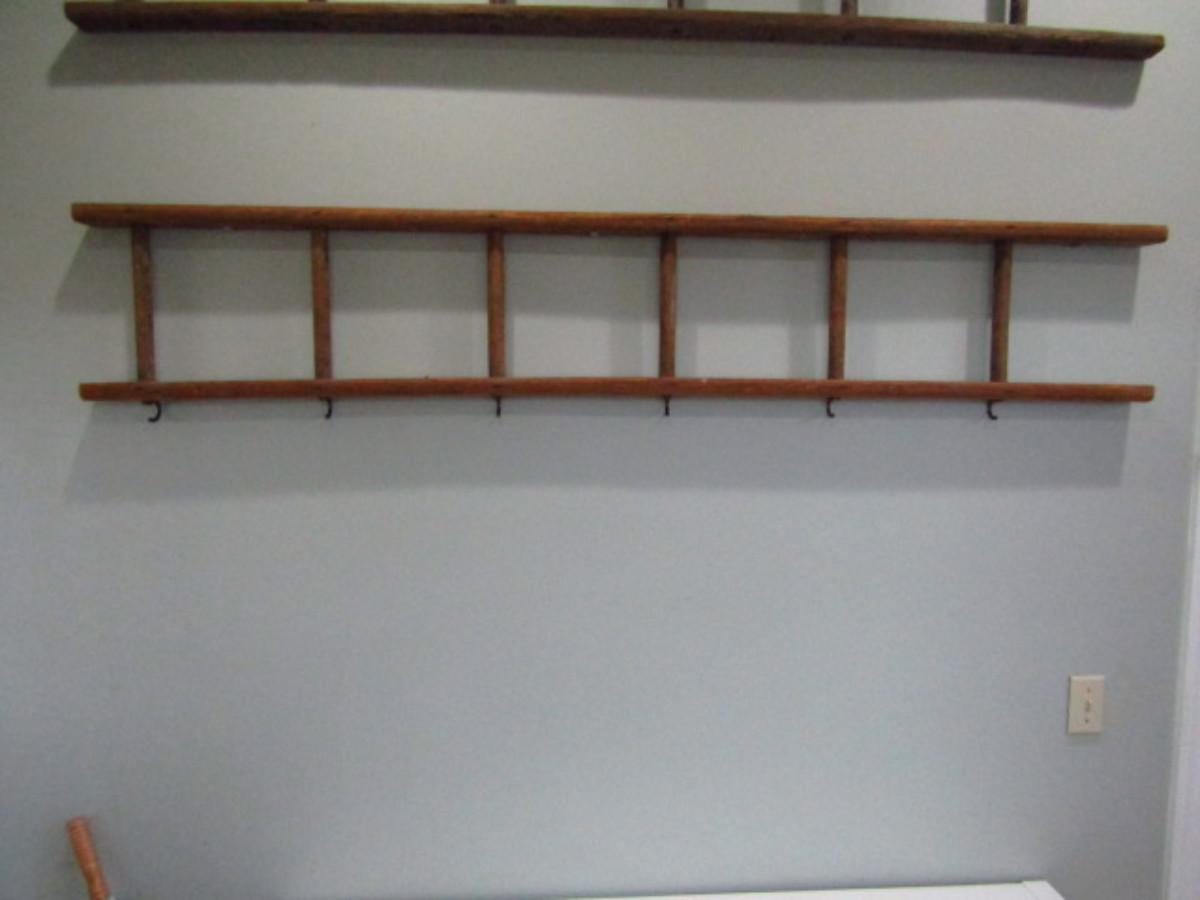 Vintage Wooden Ladder Used for Home Decor- With Coat Hooks. Measures approx 75" long.