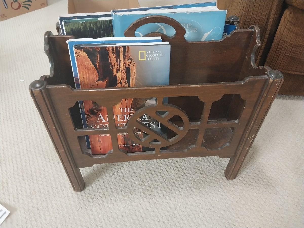 VINTAGE WOODEN MAGAZINE HOLDER AND HARDBACK BOOKS