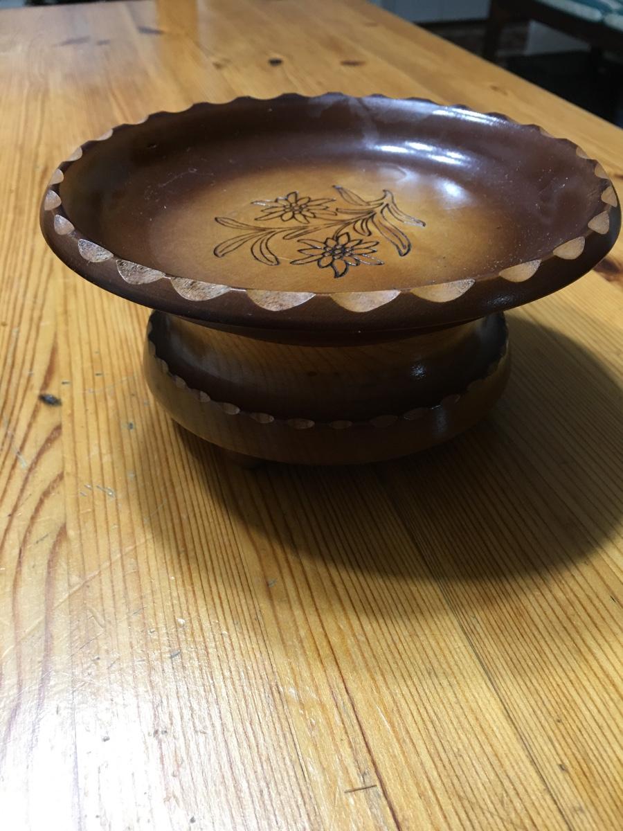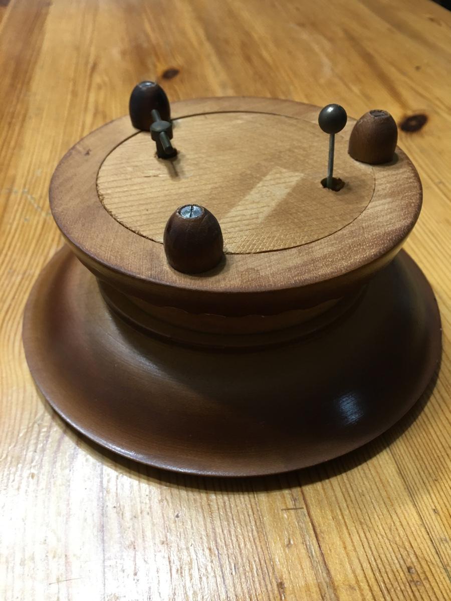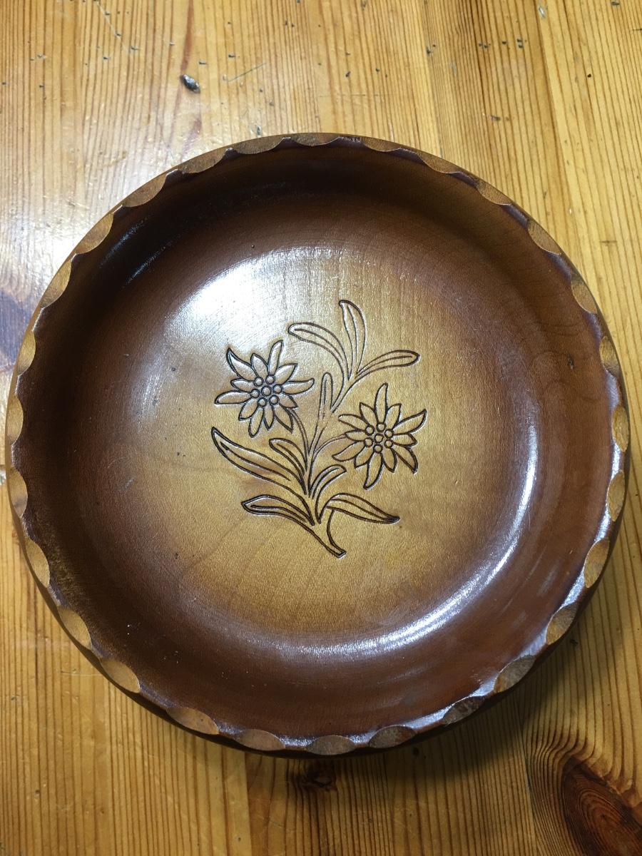 Beautiful Vintage hand carved wooden music box/trinket dish with carved flower. 6” in diameter and 2 1/2” tall with a spring off switch on bottom as shown in photos. Music box is in good condition looks un-used.
