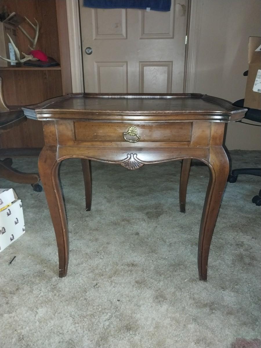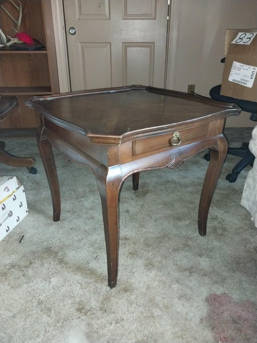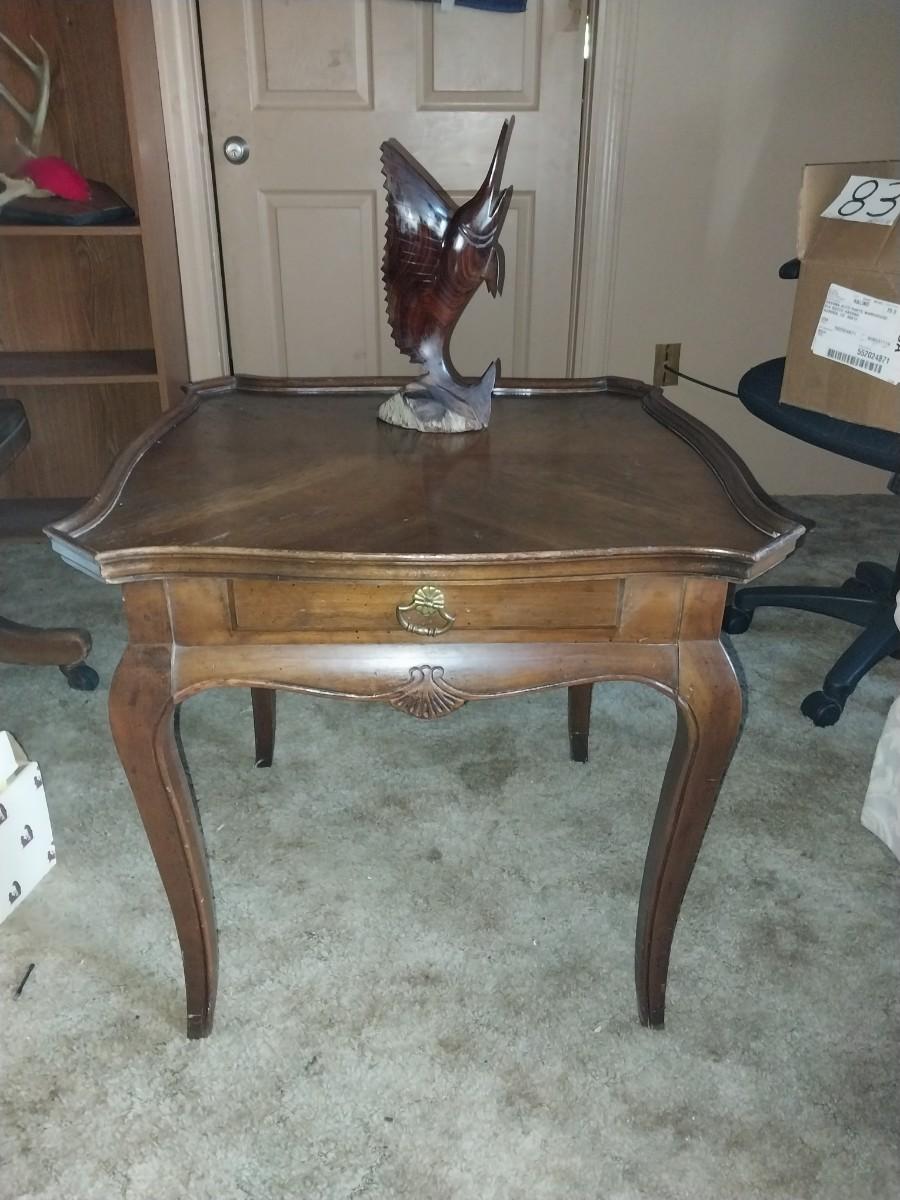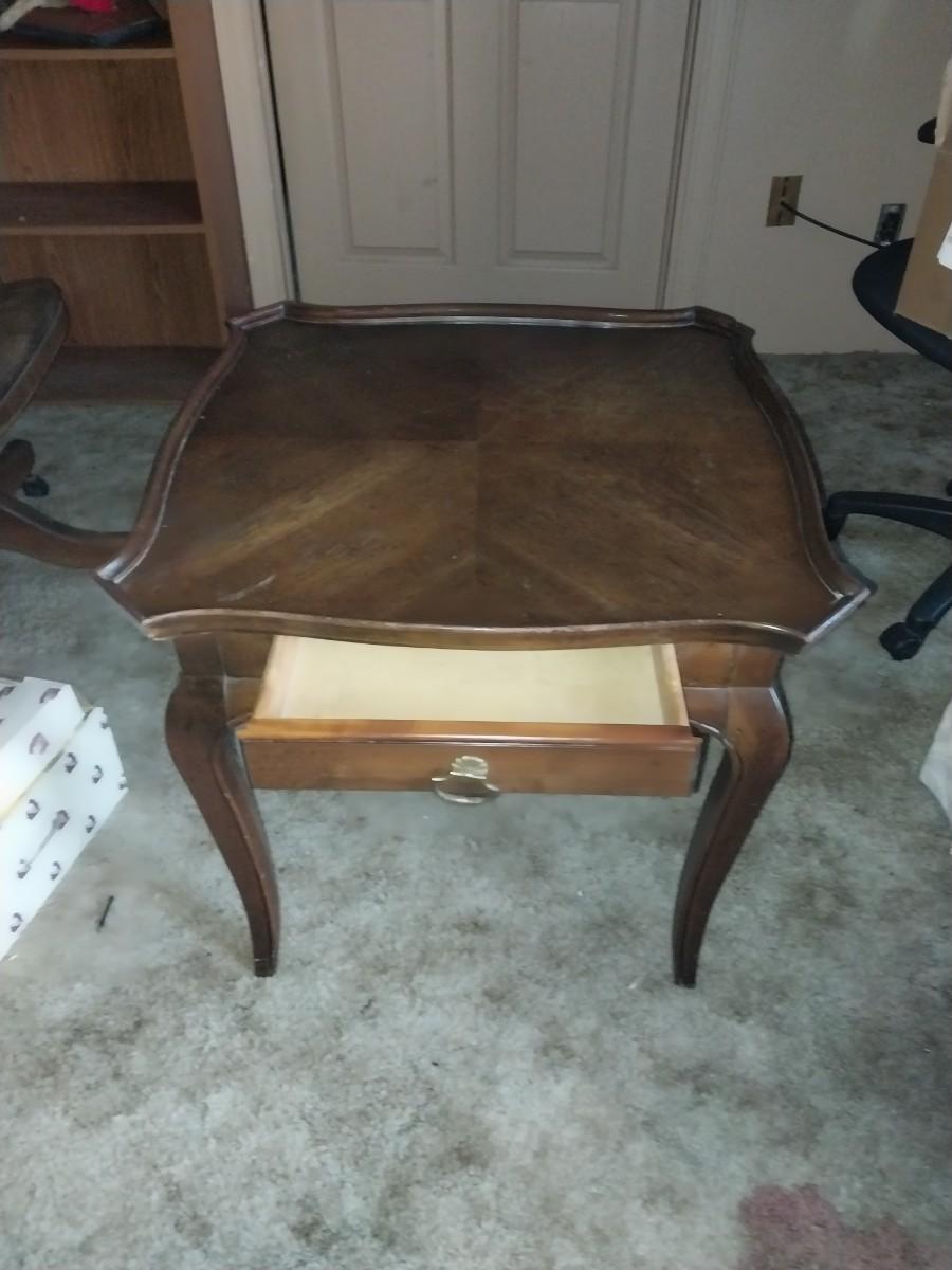 VINTAGE WOODEN ONE DRAWER END TABLE AND SOLID WOOD MERLIN