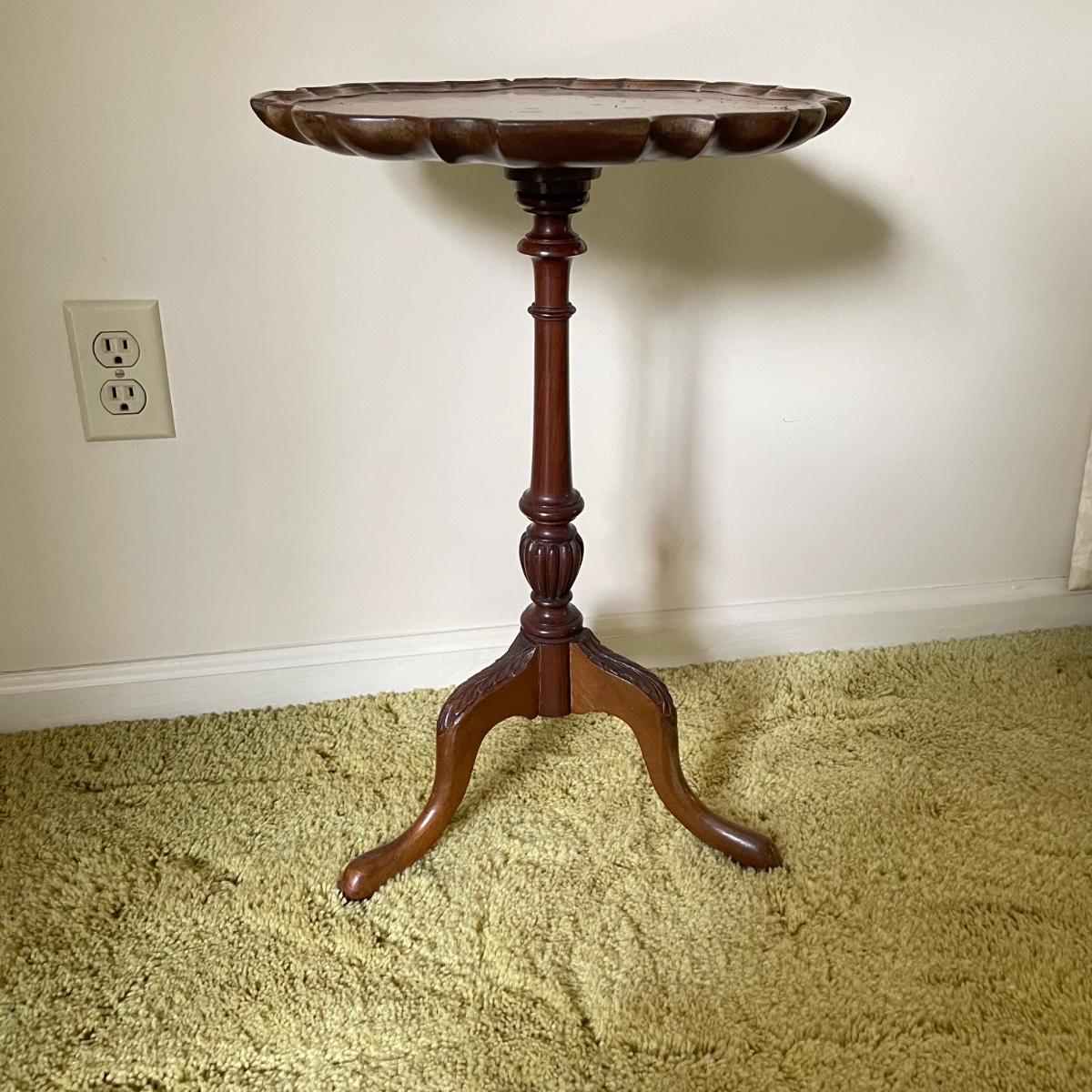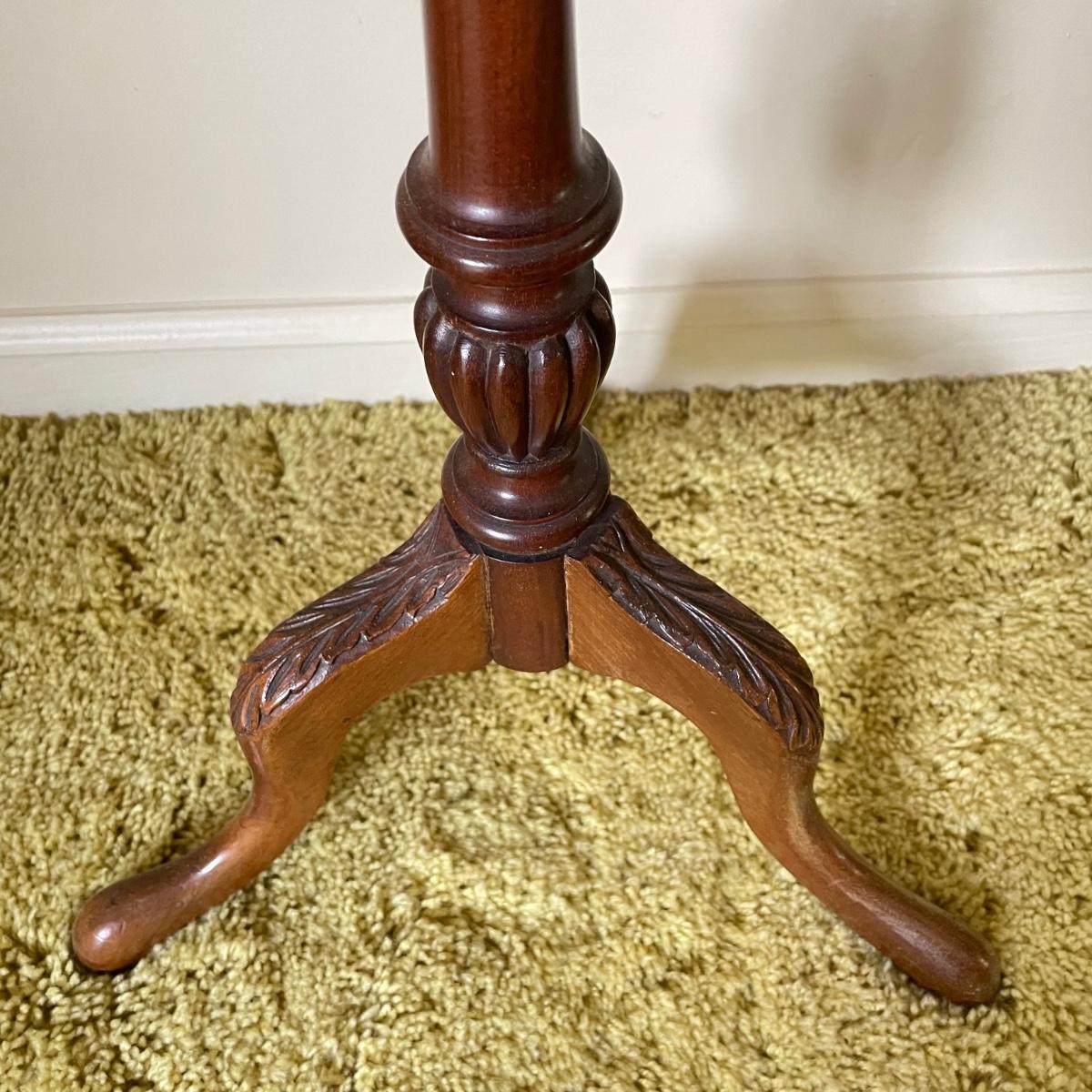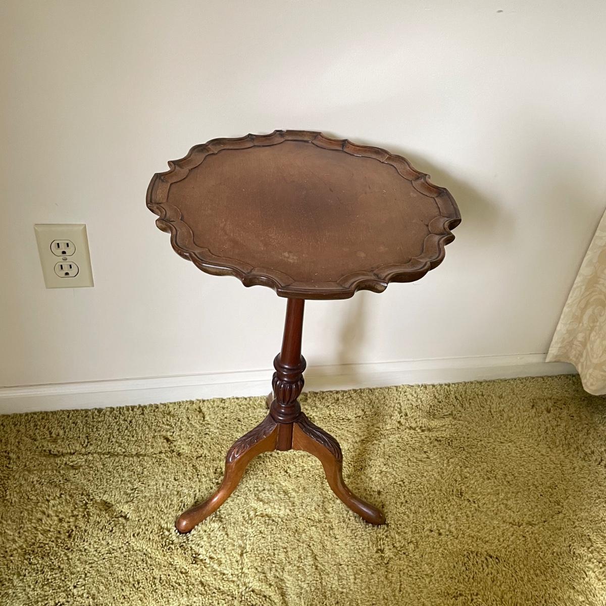 Pretty wooden antique side table that could also be a plant stand appears to be very sturdy. Piece measures 13.75”d x 21.5”, it’s in great shape with some minor water spots on the top. See images. Local pick up only.