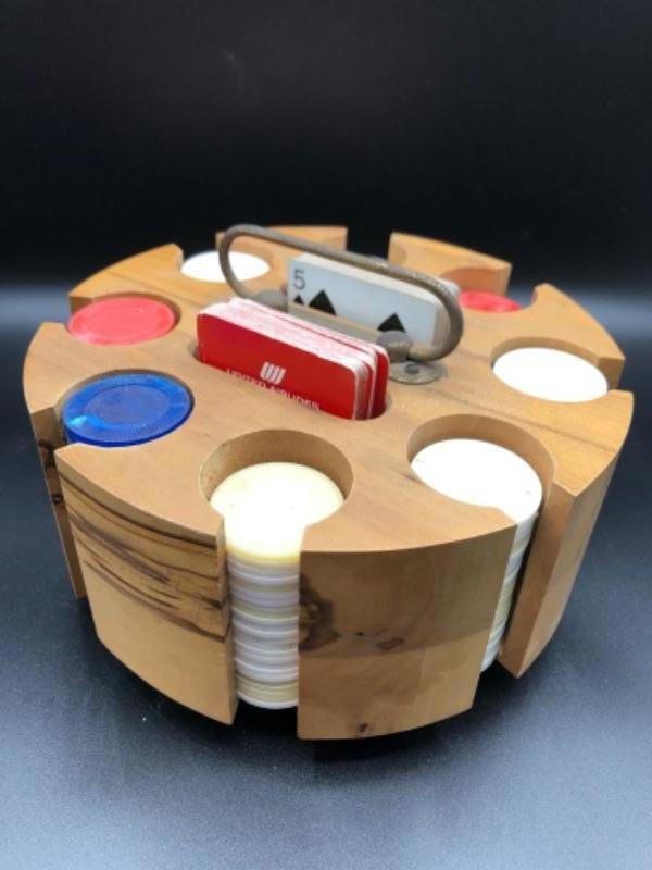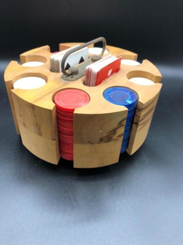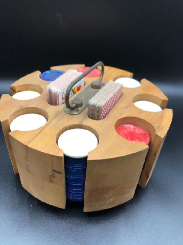 Vintage wooden Poker Chip & Playing Card Caddy, rotating
