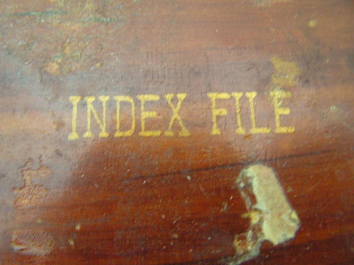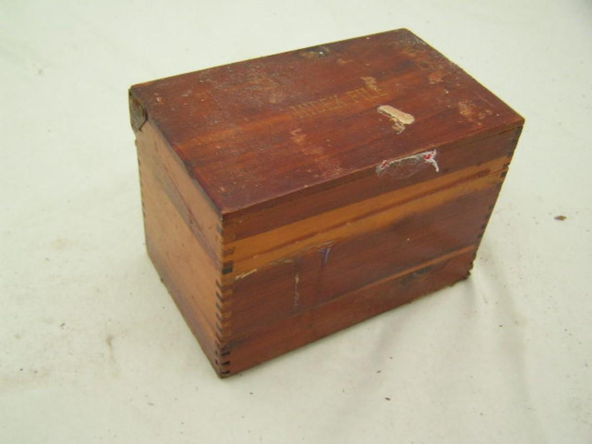 Vintage wooden recipe file box. Includes a bunch of recipes hand written on cards. Hinge is missing pivot pin (nail) and needs to be repaired. AS IS.
