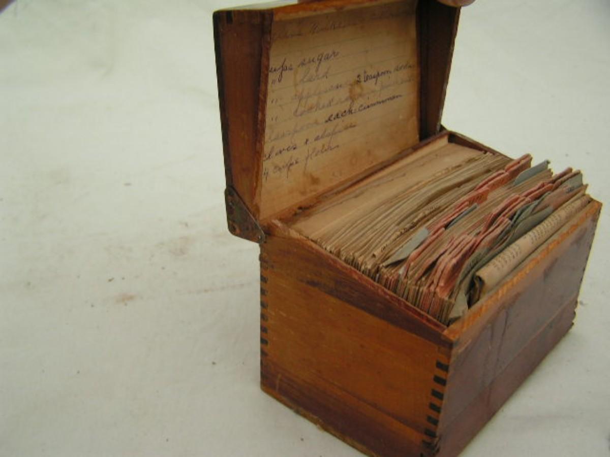 Vintage wooden recipe box. Includes a bunch of recipes hand written