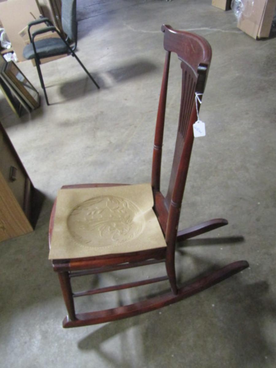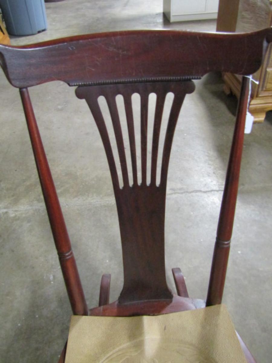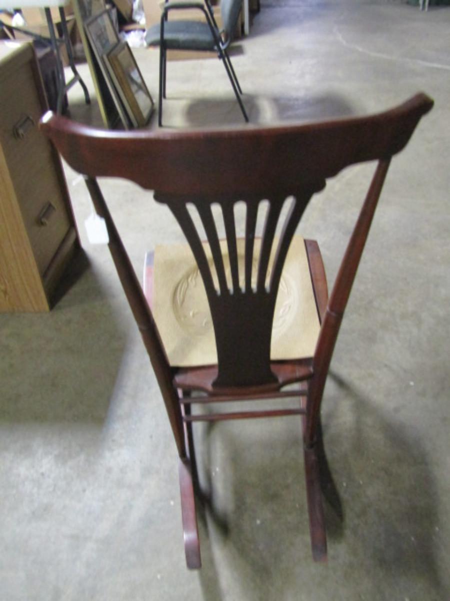 Vintage Wooden Rocker with Cane Seat- Dragon Theme Leather Panel on Top of Damaged Seat. Please see pictures.
