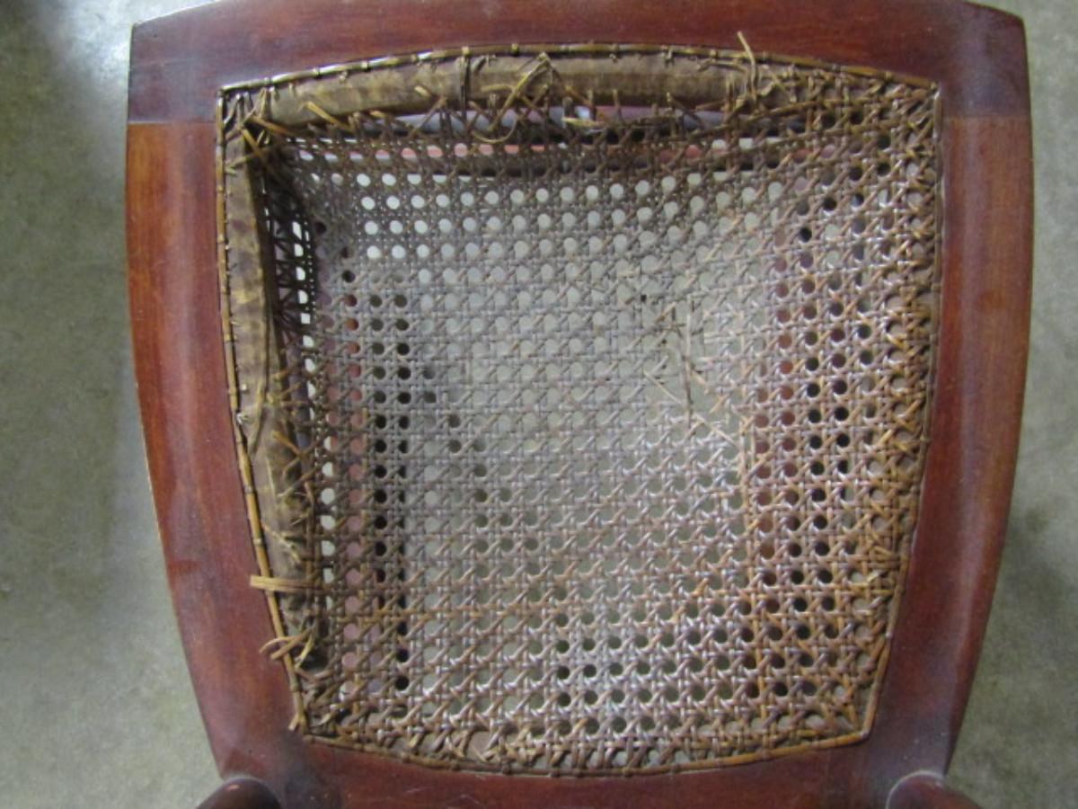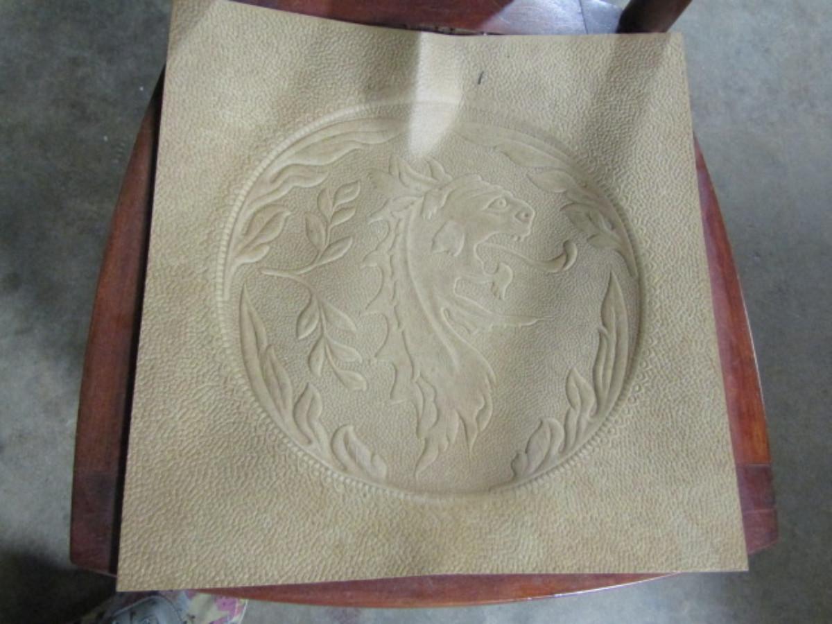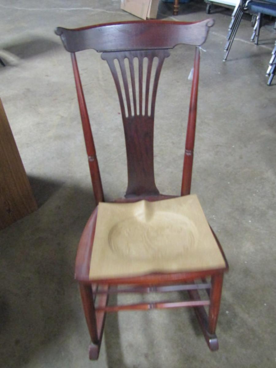 Vintage Wooden Rocker with Cane Seat- Dragon Theme Leather Panel on Top of Damaged Seat. Please see pictures.